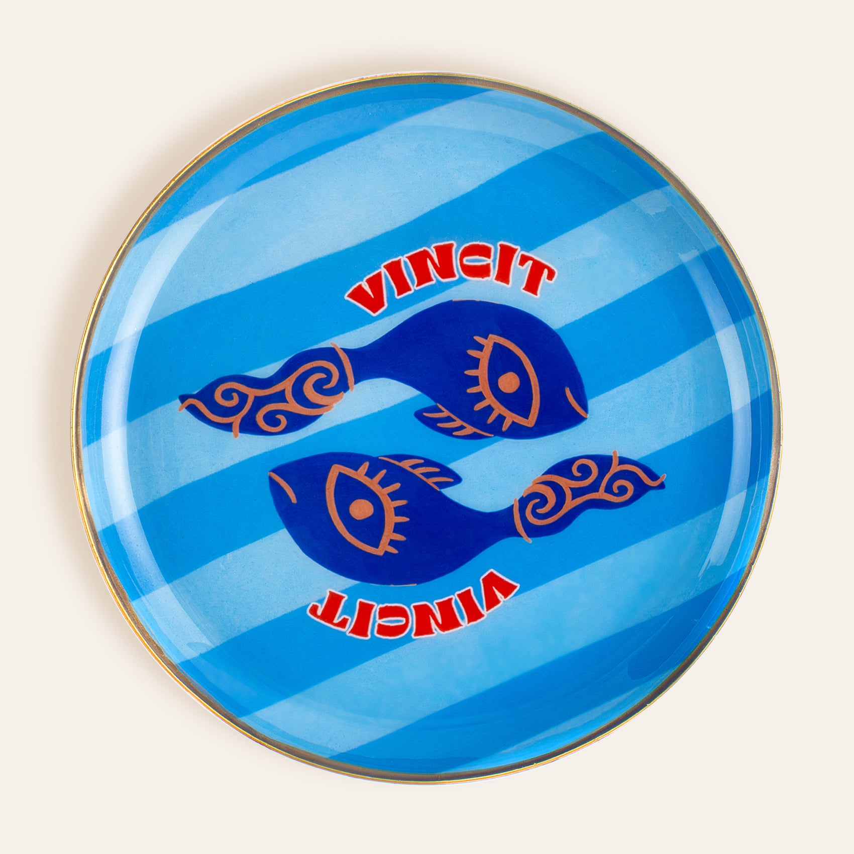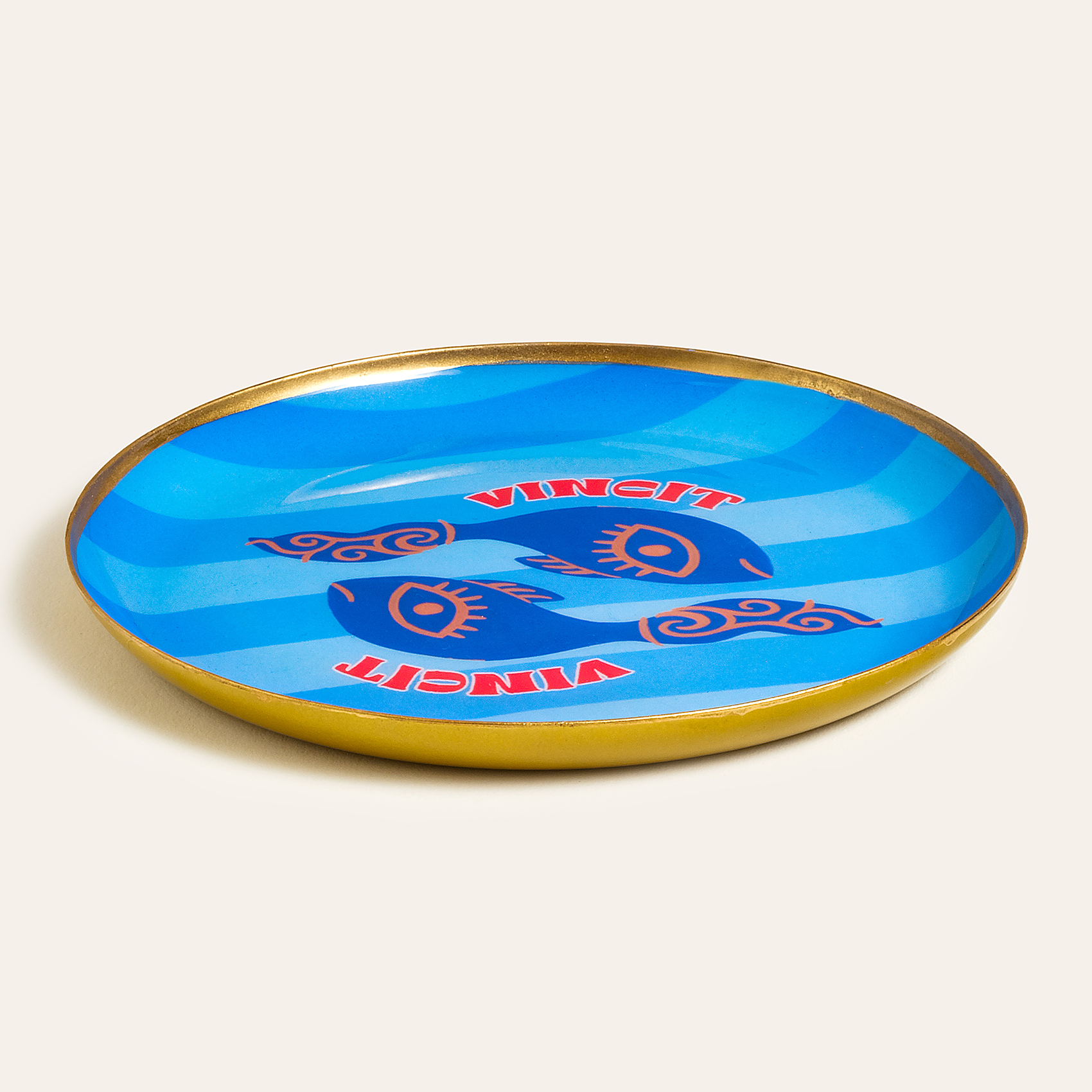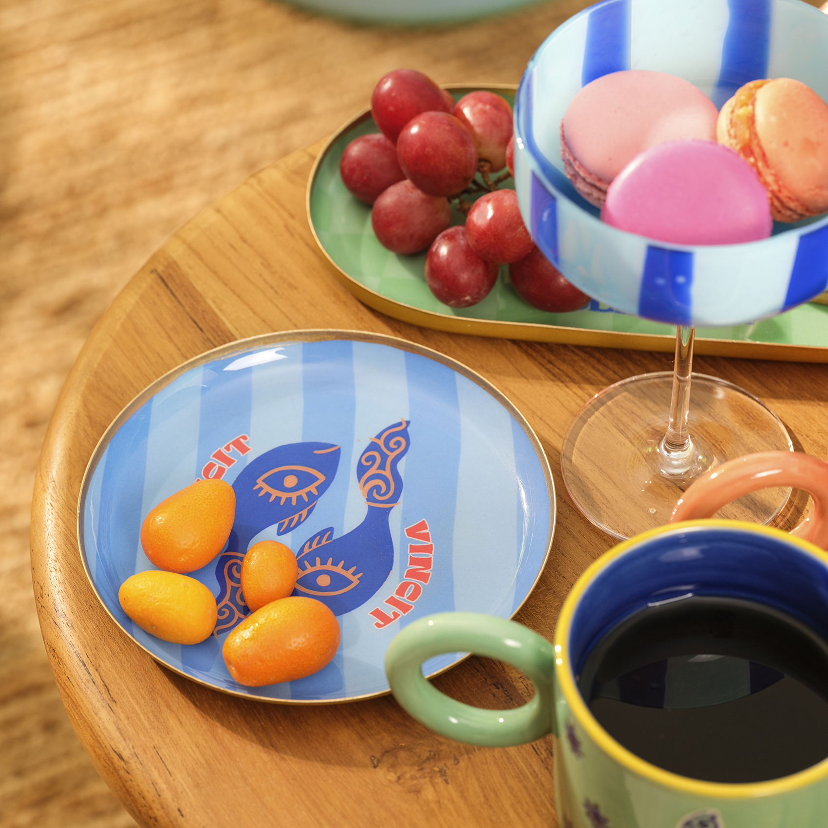 Dalgalar hareket ediyor, hiçbir şey sabit kalmıyor. Agra Tepsi, Blue koleksiyonunun akışkan ve canlı dünyasını yüzeye taşıyor; katman katman mavi tonları hareketi derinleştirirken, merkezdeki figür bu akışı sahipleniyor. “Vincit” detayı, bu akışın içinde kendine güvenli bir iz bırakıyor; sessiz ama kararlı bir ifade. Yuvarlak formu hareketi tamamlıyor, akışı kesintisiz bir döngüye dönüştürüyor. Hindistan’da demir yüzey üzerine uygulanan dekal tekniğiyle üretiliyor. Yüzeyi parlak, renk geçişleri net, etkisi doğrudan. Kahve sunumlarında, küçük anlarda ya da duvarda tek başına sergilendiğinde bulunduğu alana hareket katıyor. Agra, enerjisiyle öne çıkan, akışıyla bulunduğu yeri canlandıran; Blue koleksiyonunun İlkbahar Yaz 2026 sezonuna ait ilham dolu bir tasarım.