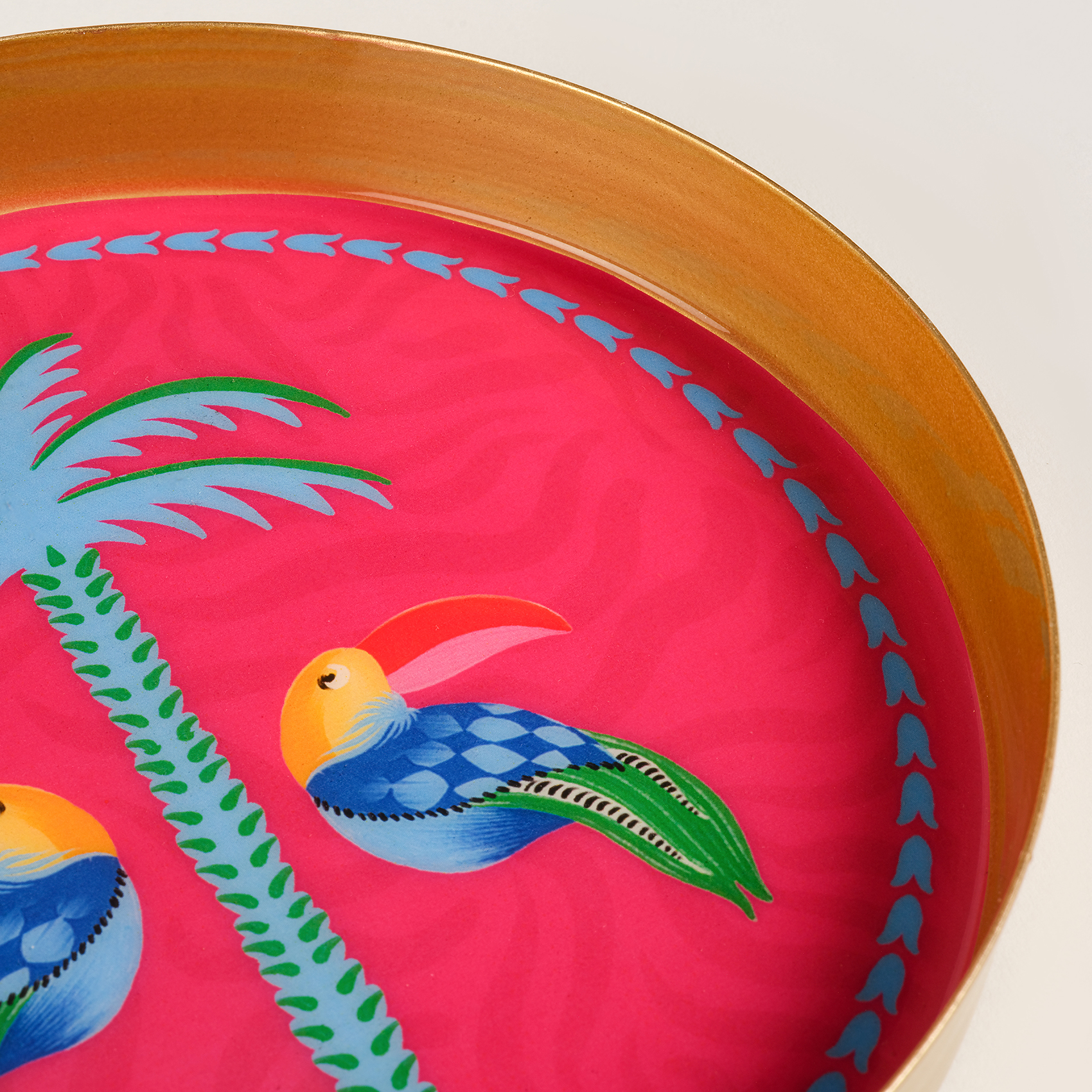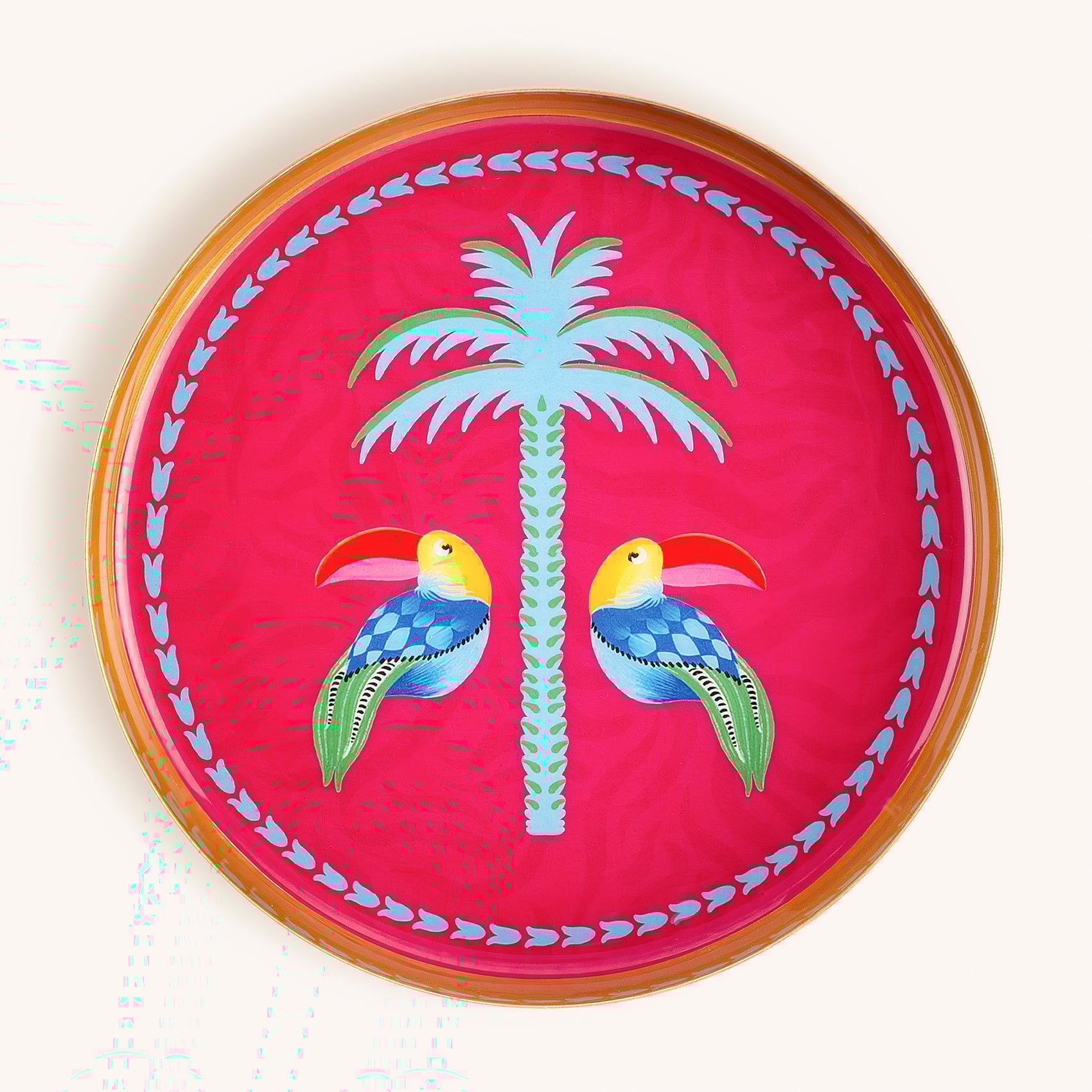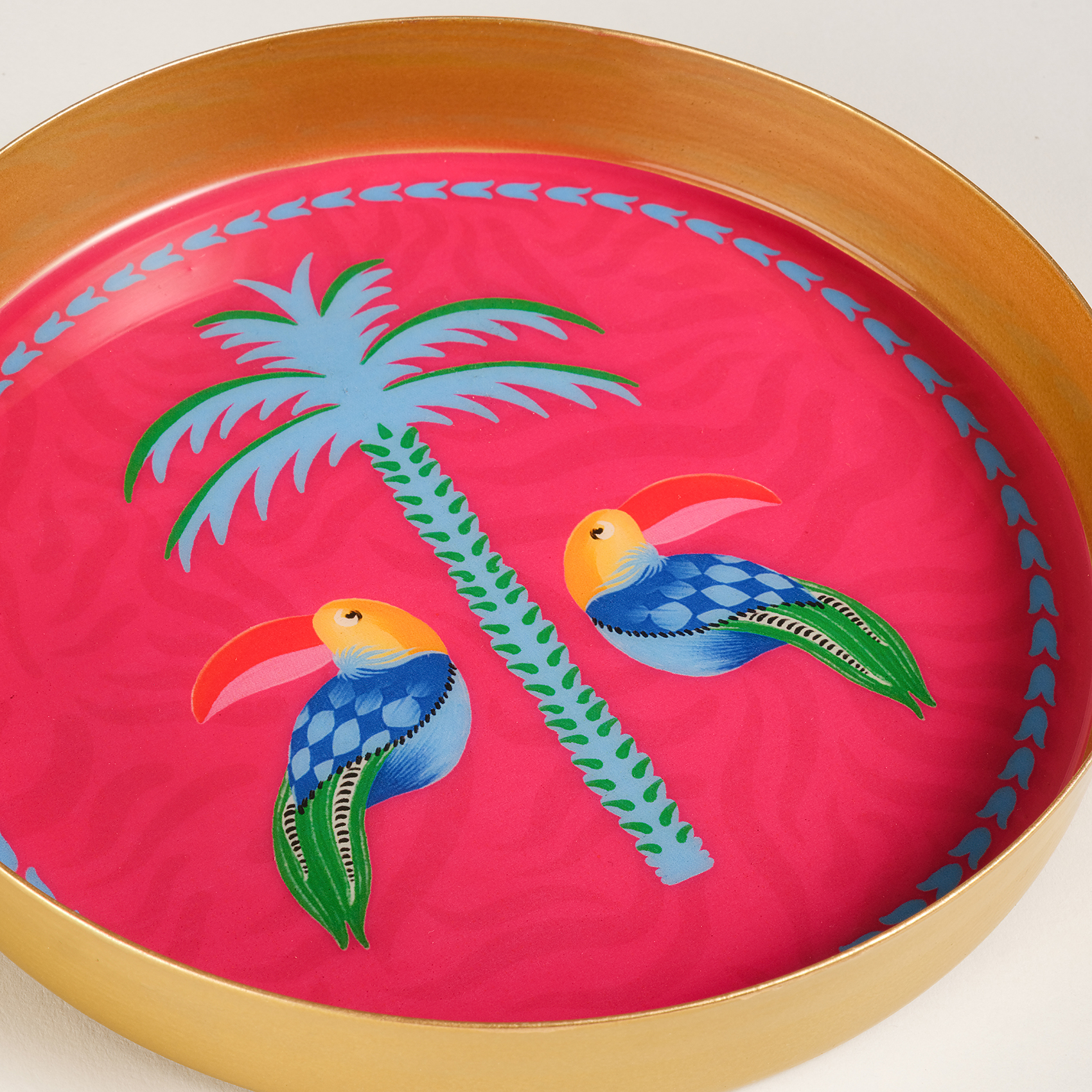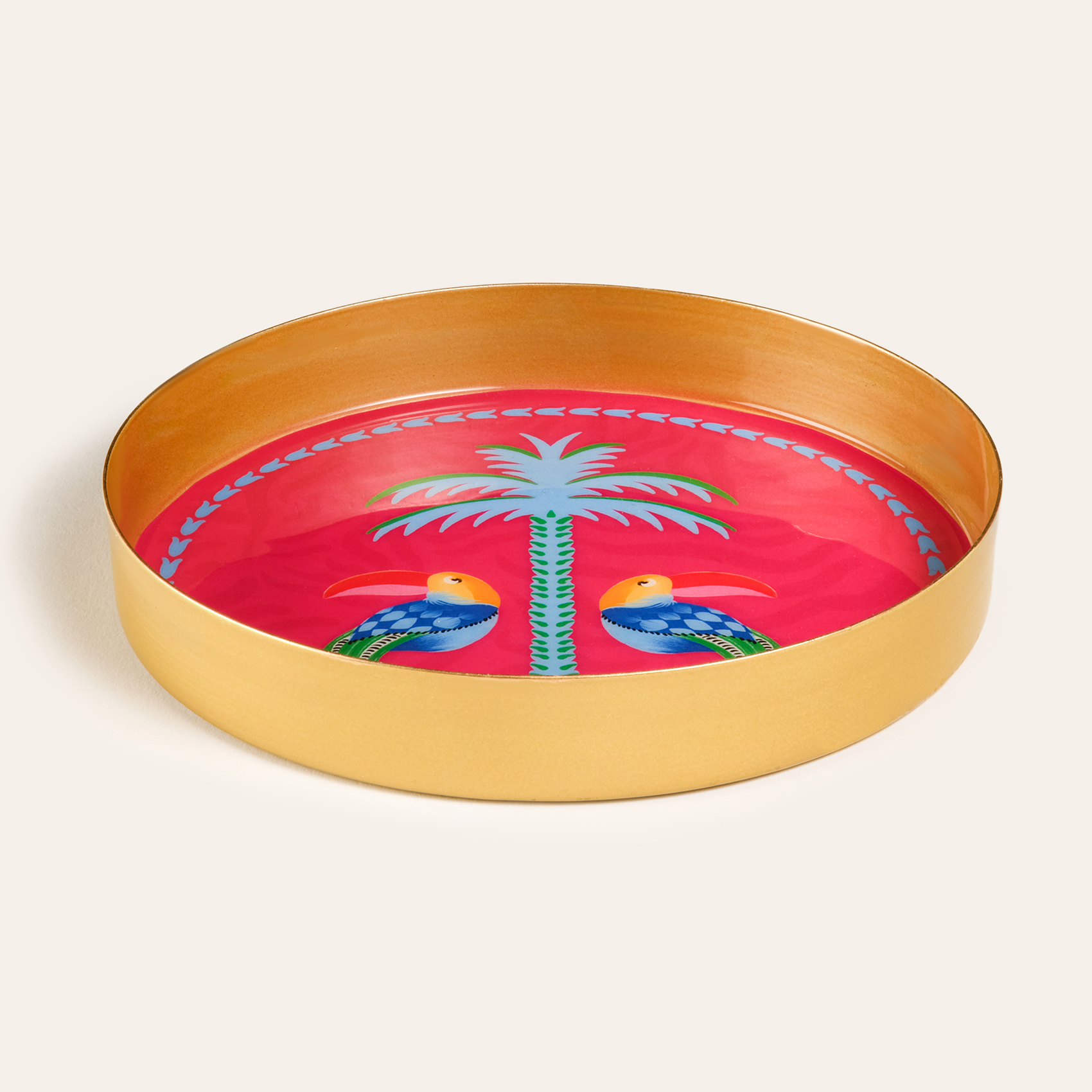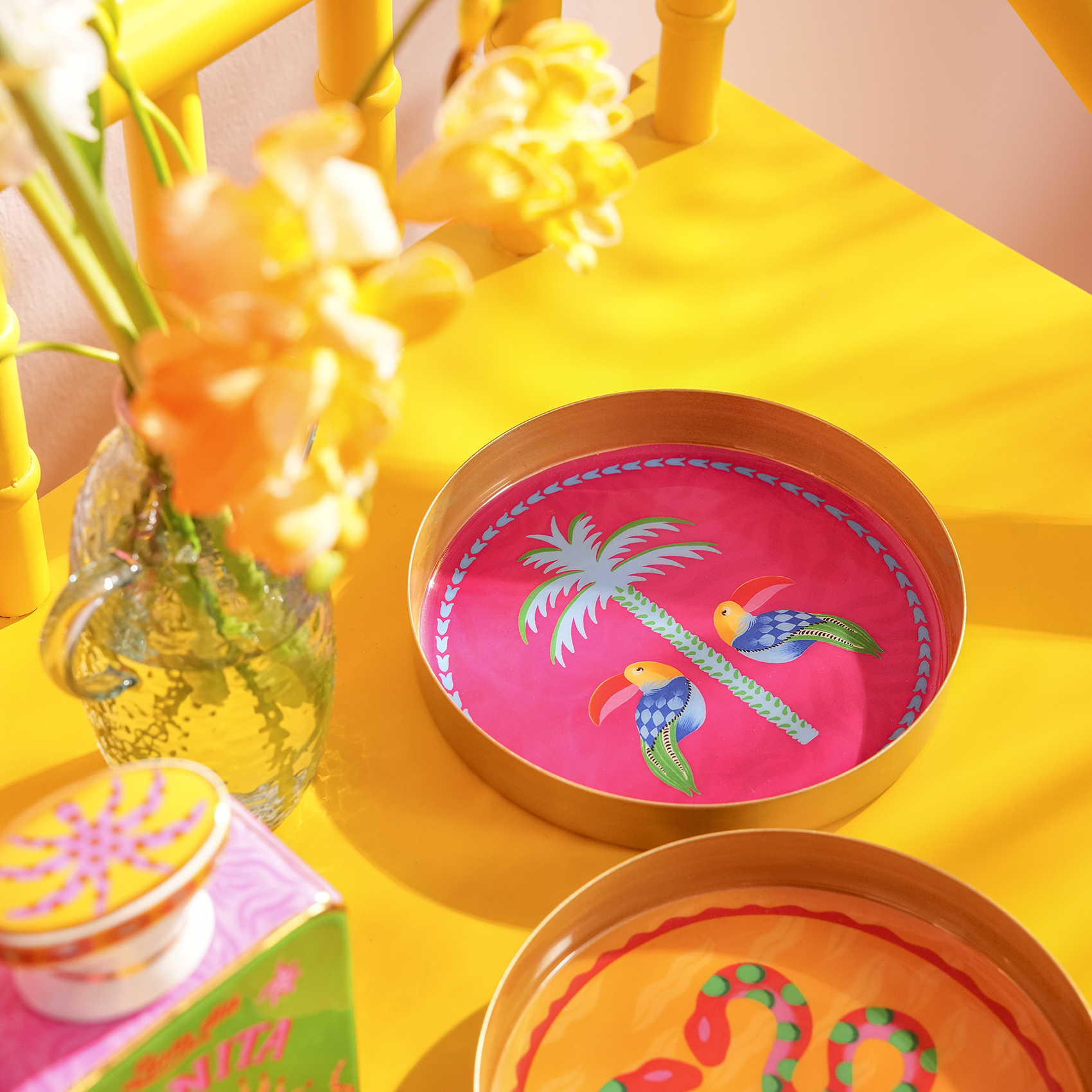 Bulunduğu alanda hemen fark ediliyor, enerjisini etrafına yaymaktan çekinmiyor. Maximalist koleksiyonunun İlkbahar Yaz 2026 sezonunda yer alan Agra Desenli Yuvarlak Metal Dekoratif Tepsi, cesur renkleri, katmanlı desenleri ve özgür stil yaklaşımıyla bulunduğu her alana güçlü bir karakter kazandırıyor. Parlak yüzey, yüksek kontrast ve canlı grafik dili bir araya gelerek oyunbaz ve iddialı bir etki yaratıyor. Yuvarlak form, bu yoğun enerjiyi dengeliyor; kompozisyonu net ve akıcı bir çerçeve içinde bir arada tutuyor. Hindistan’da metal üzerine uygulanan dekal tekniğiyle üretiliyor. Kahve sunumlarında, küçük servislerde ya da dekoratif bir obje olarak kullanıldığında bulunduğu alanın enerjisini anında yükseltiyor. Agra Tepsi, stilini açıkça ortaya koyan, bulunduğu her yerde güçlü bir etki bırakan bir tasarım.