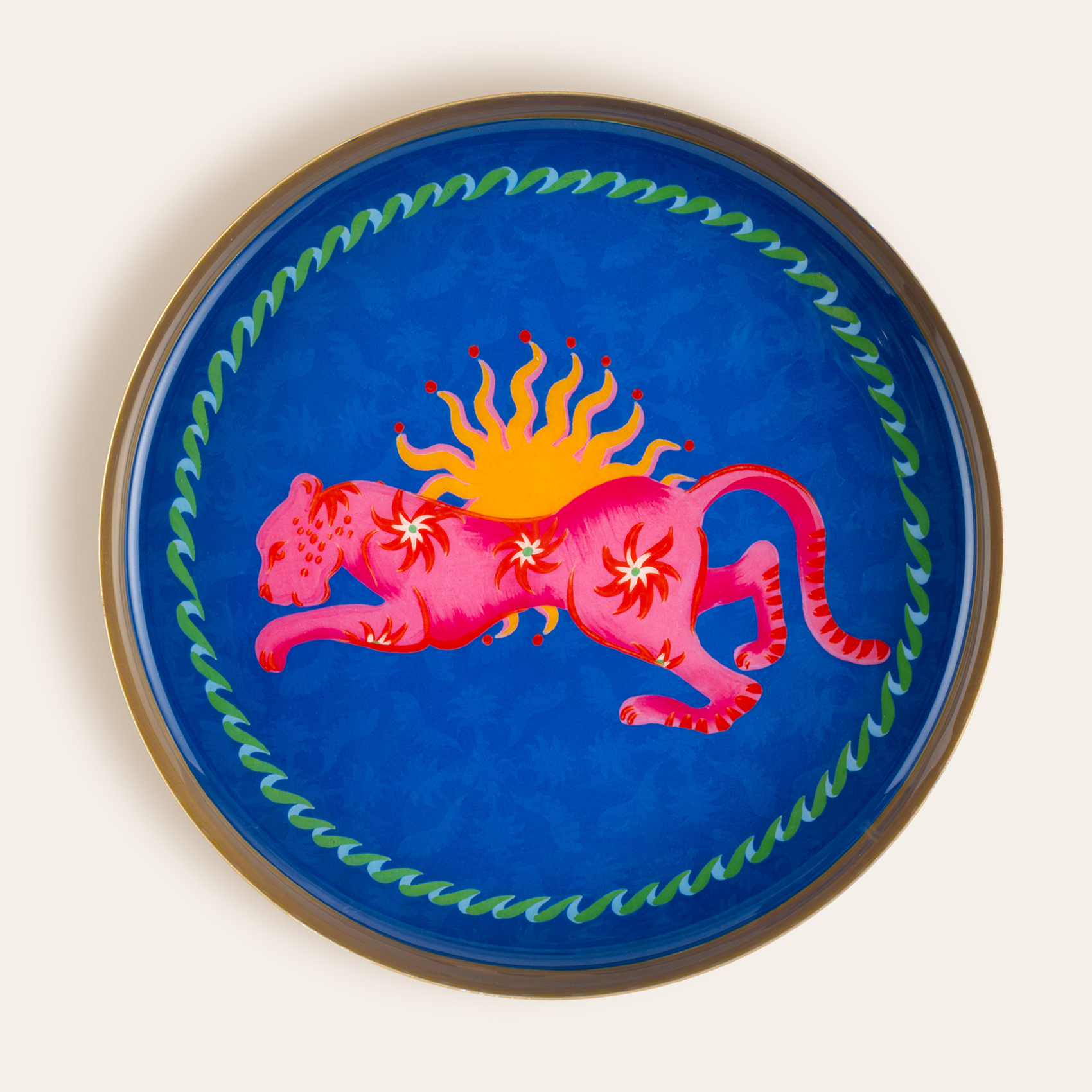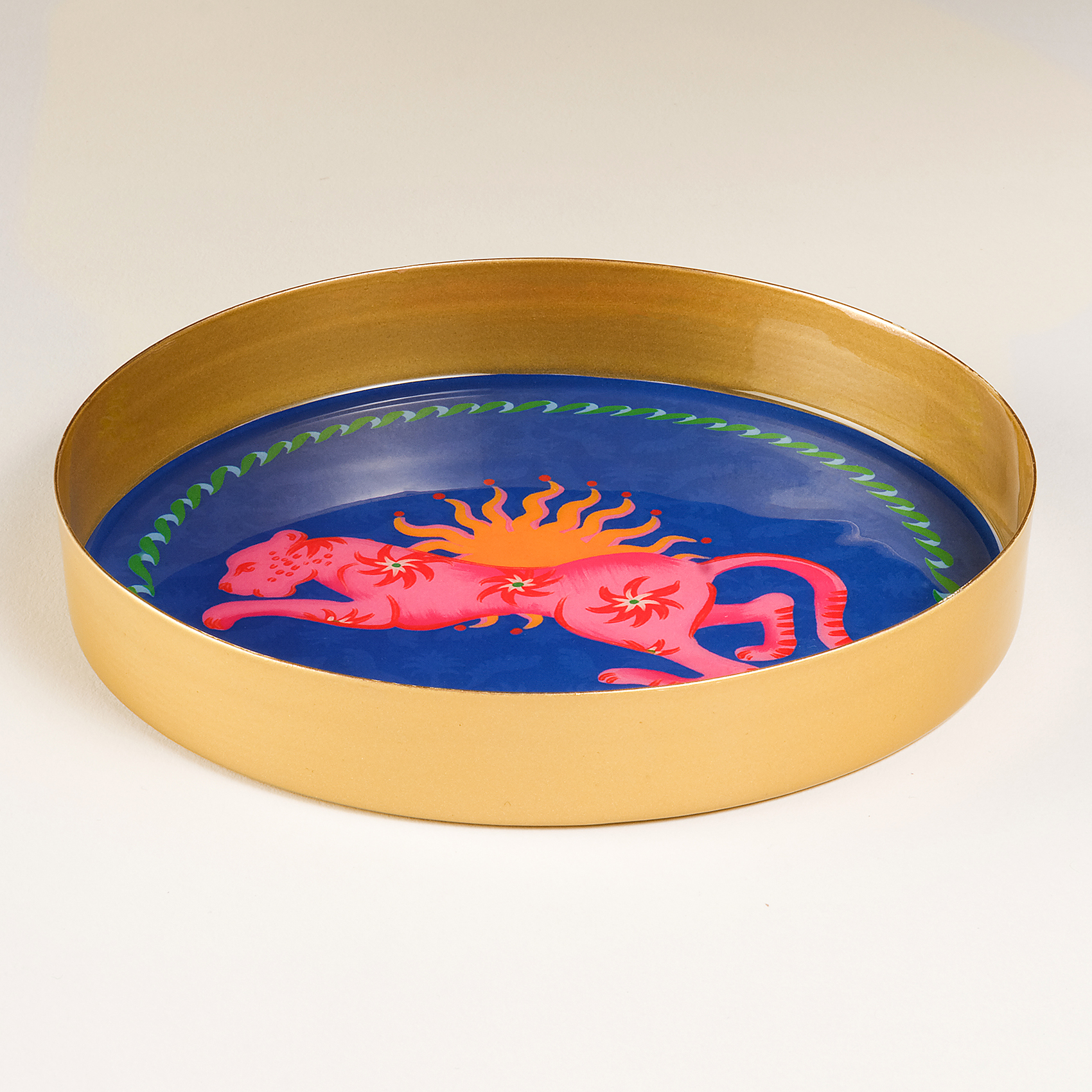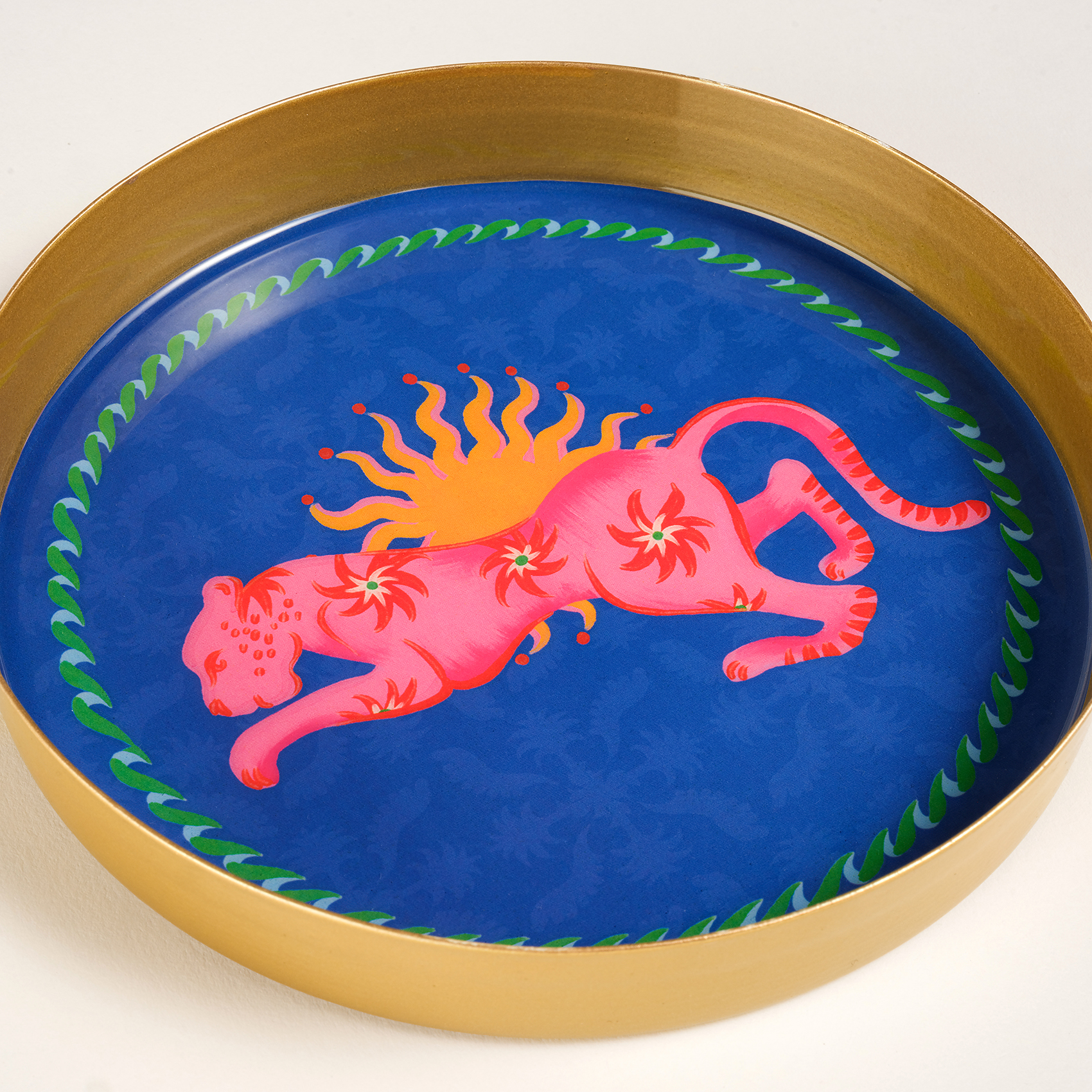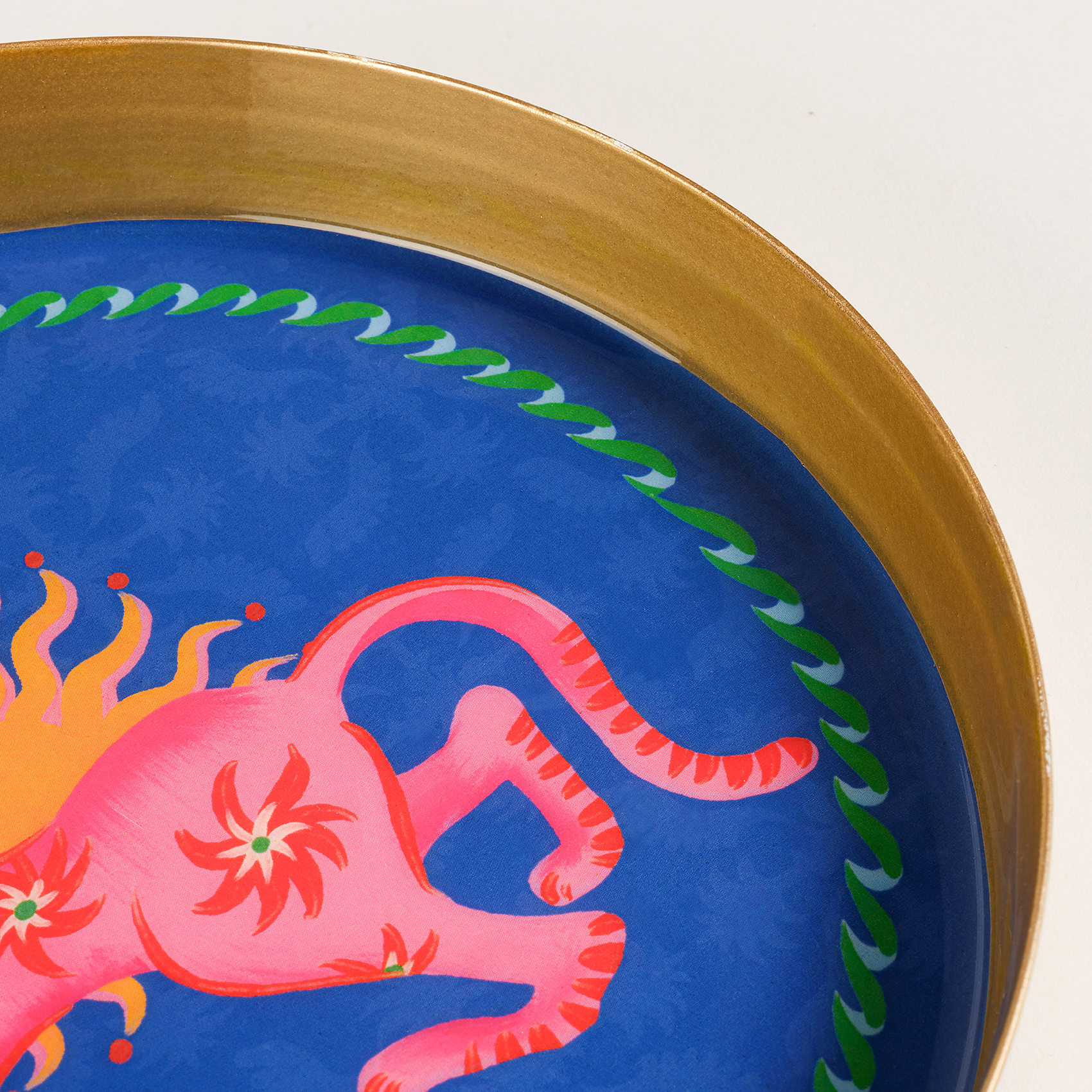 Bulunduğu alanda hemen fark ediliyor, enerjisini etrafına yaymaktan çekinmiyor. Maximalist koleksiyonunun İlkbahar Yaz 2026 sezonunda yer alan Agra Desenli Yuvarlak Metal Dekoratif Tepsi, cesur renkleri, katmanlı desenleri ve özgür stil yaklaşımıyla bulunduğu her alana güçlü bir karakter kazandırıyor. Parlak yüzey, yüksek kontrast ve canlı grafik dili bir araya gelerek oyunbaz ve iddialı bir etki yaratıyor. Yuvarlak form, bu yoğun enerjiyi dengeliyor; kompozisyonu net ve akıcı bir çerçeve içinde bir arada tutuyor. Hindistan’da metal üzerine uygulanan dekal tekniğiyle üretiliyor. Kahve sunumlarında, küçük servislerde ya da dekoratif bir obje olarak kullanıldığında bulunduğu alanın enerjisini anında yükseltiyor. Agra Tepsi, stilini açıkça ortaya koyan, bulunduğu her yerde güçlü bir etki bırakan bir tasarım.