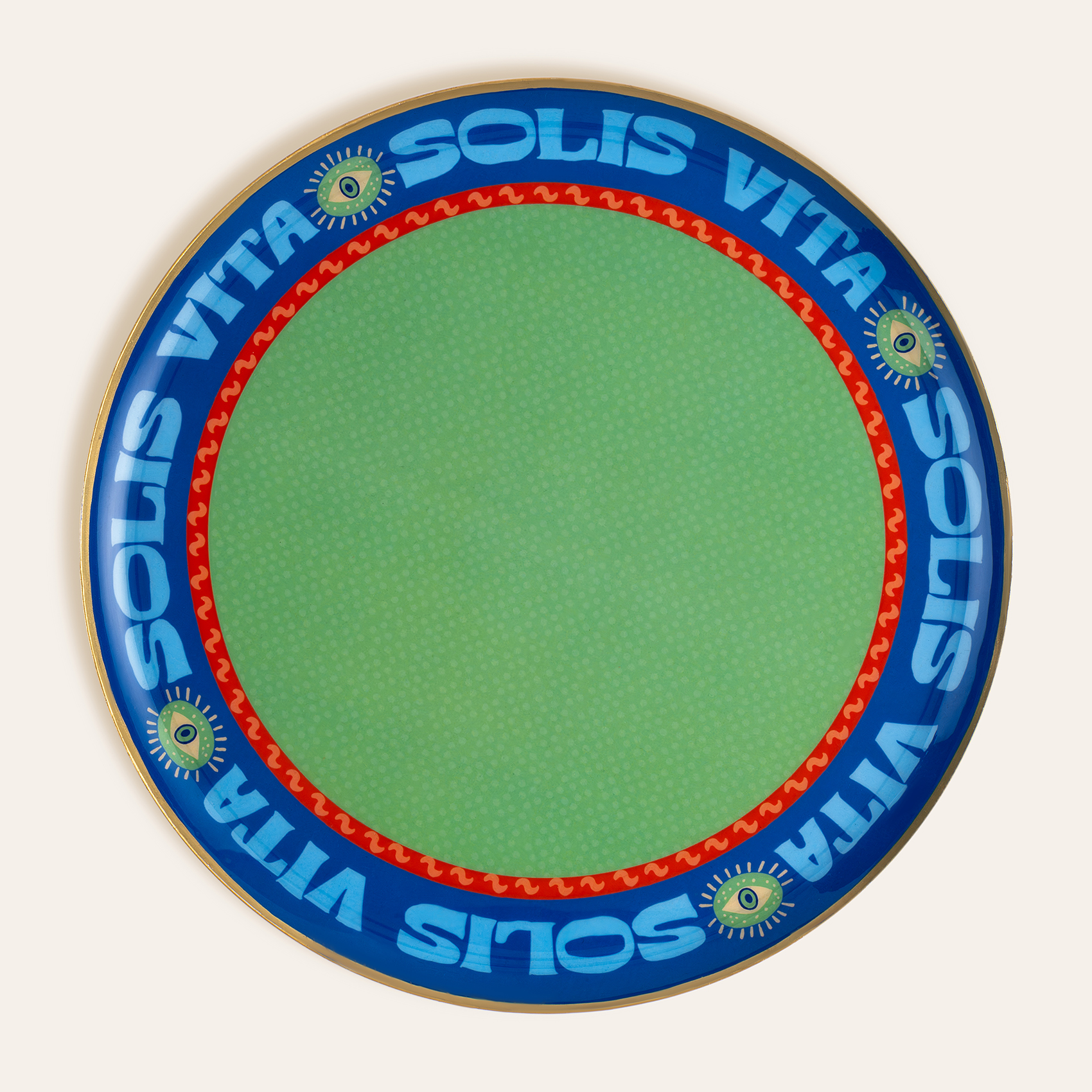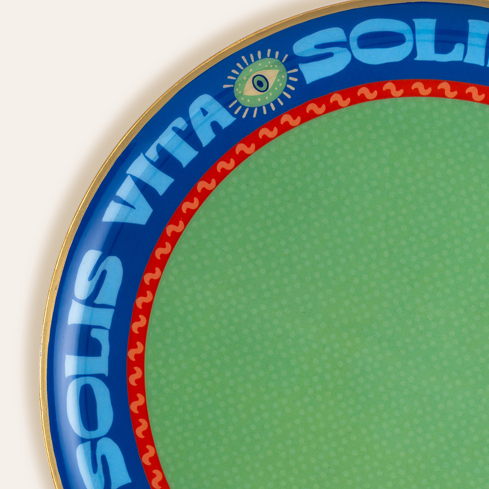 Güneşten aldığı enerjiyi saklamıyor, doğrudan yüzeye yayıyor. Agra Tepsi, Blue koleksiyonunun o parlak ve canlı dünyasını “Solis Vita” ritmiyle taşıyor; ortadaki yeşil alan bir nefes gibi açılıyor, etrafındaki mavi çerçeve hareketi sürekli kılıyor. Hindistan’da demir yüzey üzerine uygulanan dekal tekniğiyle üretiliyor. Renkler net, kontrast güçlü, duruşu kararlı. Küçük sunumlarda, kahve anlarında ya da duvarda tek başına bile bulunduğu yeri daha enerjik bir hale getiriyor. Agra, güneşten gelen mutluluk hissini hayatınızın her anında hissetmeniz için tasarlandı.