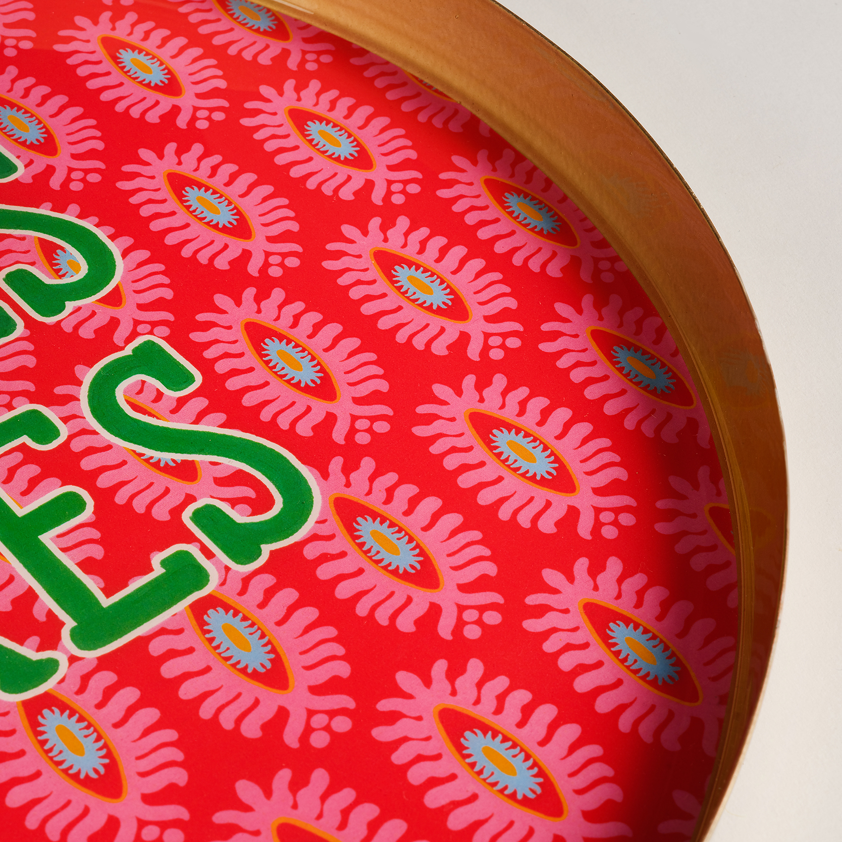 Bulunduğu alanda hemen fark ediliyor, enerjisini etrafına yaymaktan çekinmiyor. Maximalist koleksiyonunun İlkbahar Yaz 2026 sezonunda yer alan Agra Desenli Yuvarlak Metal Dekoratif Tepsi, cesur renkleri, katmanlı desenleri ve özgür stil yaklaşımıyla bulunduğu her alana güçlü bir karakter kazandırıyor. Parlak yüzey, yüksek kontrast ve canlı grafik dili bir araya gelerek oyunbaz ve iddialı bir etki yaratıyor. Yuvarlak form, bu yoğun enerjiyi dengeliyor; kompozisyonu net ve akıcı bir çerçeve içinde bir arada tutuyor. Hindistan’da metal üzerine uygulanan dekal tekniğiyle üretiliyor. Kahve sunumlarında, küçük servislerde ya da dekoratif bir obje olarak kullanıldığında bulunduğu alanın enerjisini anında yükseltiyor. Agra Tepsi, stilini açıkça ortaya koyan, bulunduğu her yerde güçlü bir etki bırakan bir tasarım.