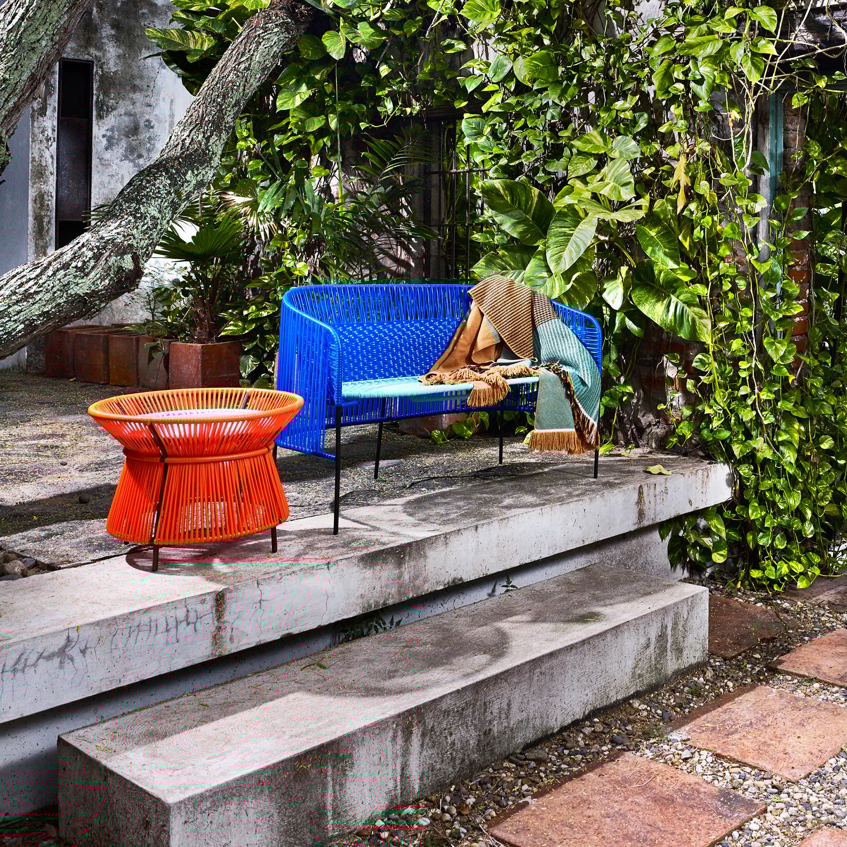 Alman tasarımcı Sebastian Herkner’in ames markası için tasarladığı Caribe koleksiyonunun bu iki kişilik bench’i, Zsa Zsa Zsu’nun açık hava dünyasında birlikte oturmanın en renkli hâllerinden biri. Herkner’in Kolombiya’da deneyimlediği kültürel zenginlik, el işçiliğiyle modern tasarımı buluşturan bu ikonik parçaya ilham veriyor. Santa Marta’nın Karayip esintili atölyelerinde, yerel ustalar tarafından geri dönüştürülmüş PVC ipler Momposino tekniğiyle, galvanizli ve toz boyalı çelik iskelet üzerine tek tek örülüyor. Hazırlığı ayrı, üretimi başlı başına bir ustalık hikâyesi olan bu bench; nereye konulsa renk getiriyor, enerjiyi yükseltiyor. Renklerini korumak için doğrudan güneşle mesafeli durması, deniz havasında ise nazikçe silinmesi yeterli. İki kişilik, capcanlı ve Zsa Zsa Zsu’nun güneşli renklerine çok yakışan bir özgürlük alanı.