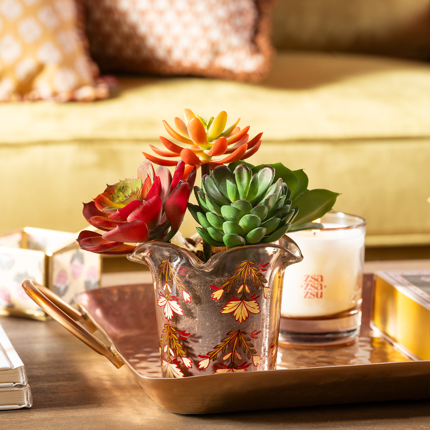 Aravali el boyaması dekoratif obje ile Hindistan’ın renkli ruhunu evinize getirin. Heritage koleksiyonunun zarif detaylarını ve Hindistan’ın geleneksel el işçiliğini bir araya getiren Aravali dekoratif obje, usta ellerde şekilleniyor; her biri elde üflenmiş ve ince ince el boyamasıyla süslenmiş tasarımı benzersiz bir duruş sergiliyor. Sade bir şıklıkla parlak renklerin dansını sunan bu dekoratif obje ışıltılı ve canlı desenleriyle yaşam alanlarınıza özgün bir dokunuş katmak için ideal. Farklı boyut seçenekleri ile sunulan Aravali dekoratif objeyi ister çiçeklerle ister dekoratif objelerle kullanın; Aravali evinizin her köşesinde başrolde olmayı başaracak.