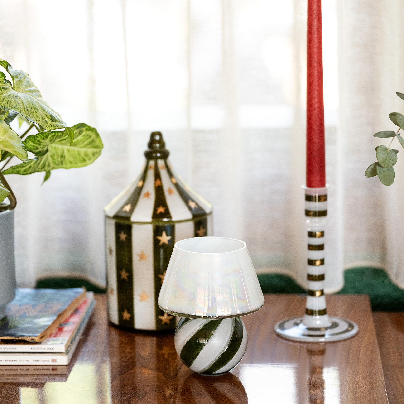 Hindistan’ın büyüleyici zanaat geleneğinden doğan Aravali el boyaması kapaklı cam dekoratif obje, adeta bir masaldan çıkıp evinize konuk oluyor! Bu tasarım, şekerlemelerle dolu hayali bir ormanı andıran yumuşak renk geçişleri ve neşeli detaylarıyla bulunduğu her köşeye hayat katıyor. Kapaklı yapısı, sanki bir sır saklıyormuş gibi merak uyandırıyor. Altındaki yeşil-beyaz spiral top ise, lunaparklarda dönen tatlı şeker çubuklarını çağrıştırıyor. Parlak cam yüzeyiyle ışıkla oynayan bu obje, her açıdan farklı bir hikâye anlatıyor. Funfair koleksiyonunun hayatı bir kutlama sahnesine dönüştüren konseptinden ilham alan tasarımıyla evinizde hem dikkat çekici hem de eğlenceli bir etki yaratan bu obje, ister modern bir dekorasyonun enerjik bir tamamlayıcısı, ister nostaljik bir atmosferin sevimli bir detayı olarak kullanılabilir. Aravali, yaşam alanlarınızı sıradanlıktan çıkarıp küçük bir festival havası estirecek.