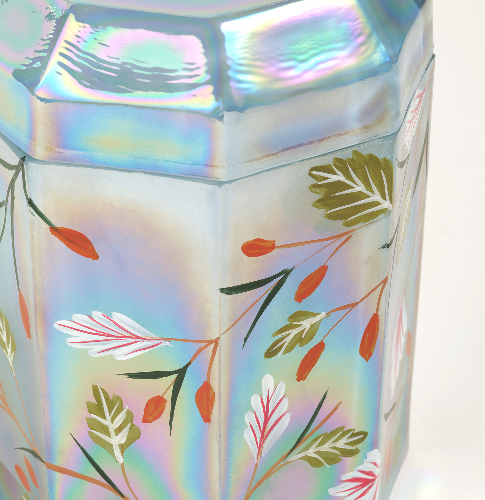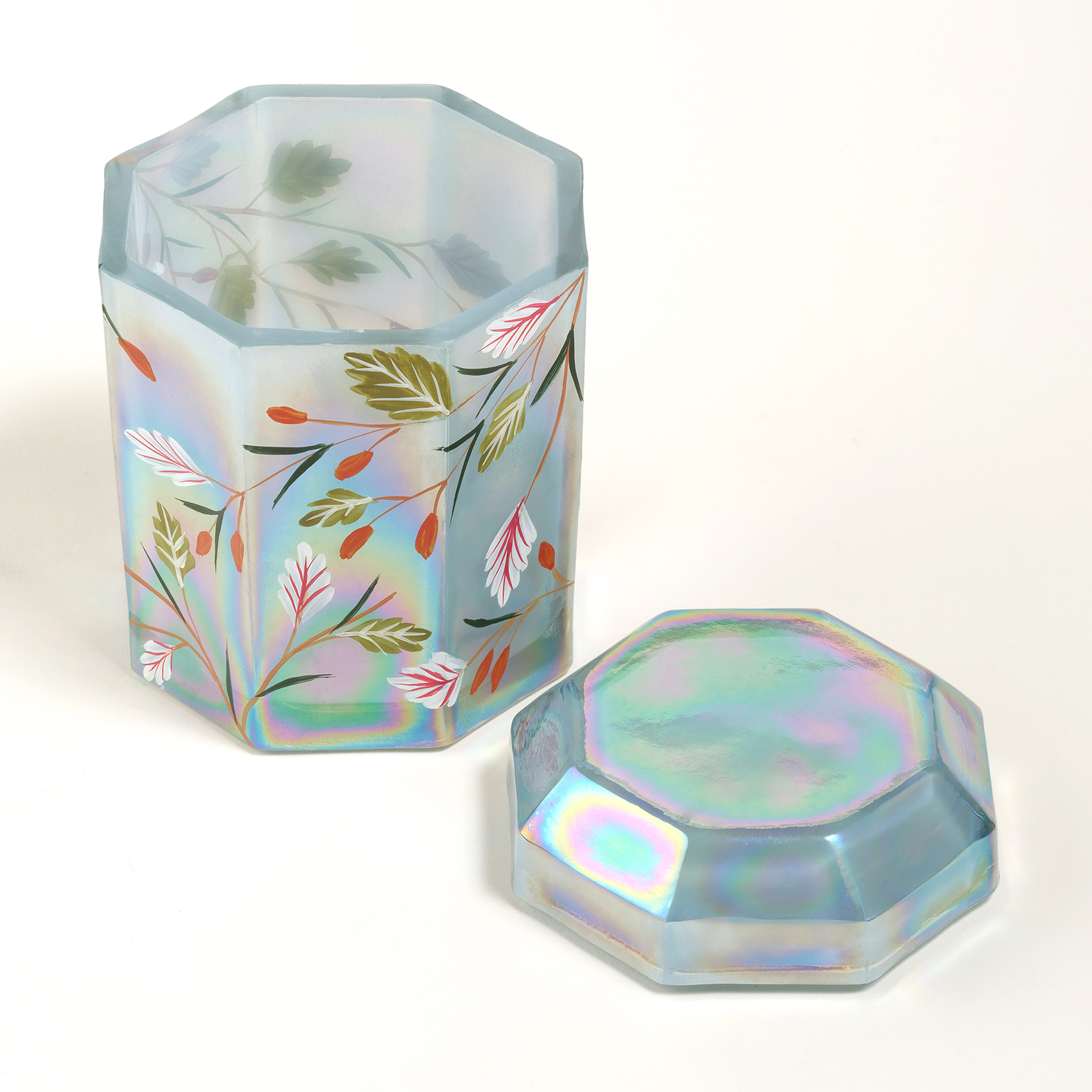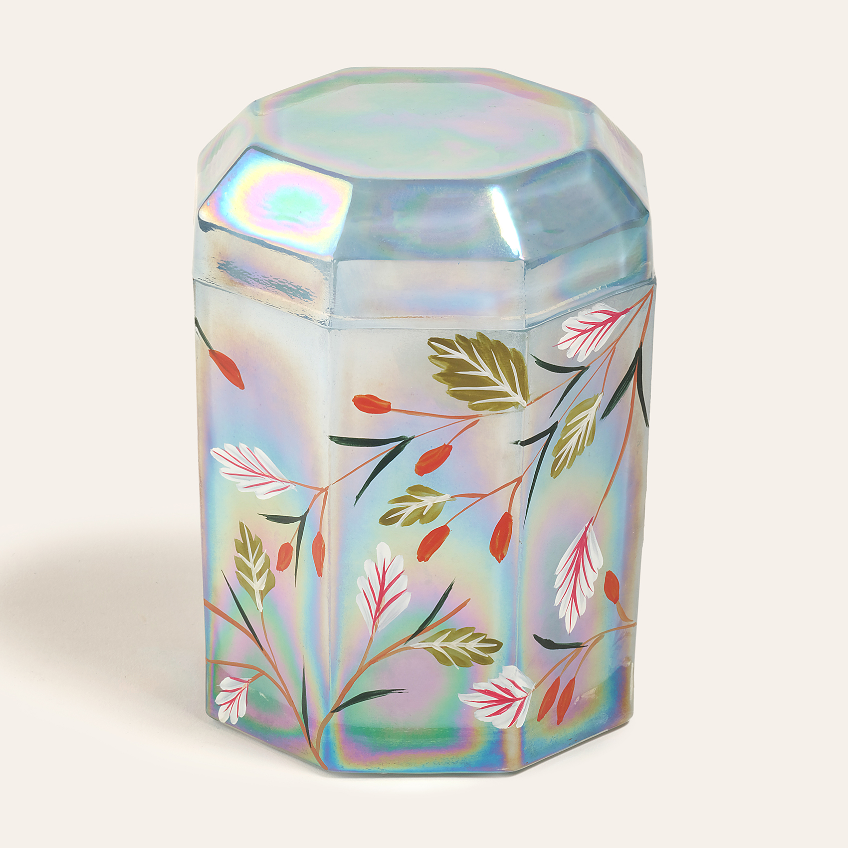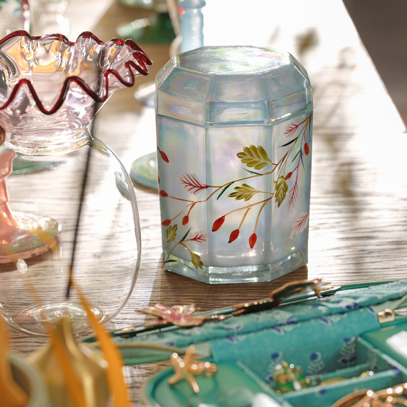 Heritage koleksiyonunun ilham dolu dünyasından çıkan Aravali El Boyaması Kapaklı Cam Obje, Hindistan’daki ustaların özenli ellerinde hayat buluyor. Lüster efektli mavi cam yüzey, ışığa göre farklı renklerle parıldarken üzerine tek tek boyanan zarif bitki motifleri doğadan gelen bir şiirsellik taşıyor. Her yaprak ve dal, sabırla işlenmiş bir sanat dokunuşu gibi camın yüzeyinde canlanıyor. Estetik olduğu kadar işlevsel bir obje olan Aravali, ister dekoratif bir parça ister saklama kutusu olarak yaşam alanınıza ilham katıyor; ışıkla, desenle ve renkle küçük bir büyü yaratıyor.