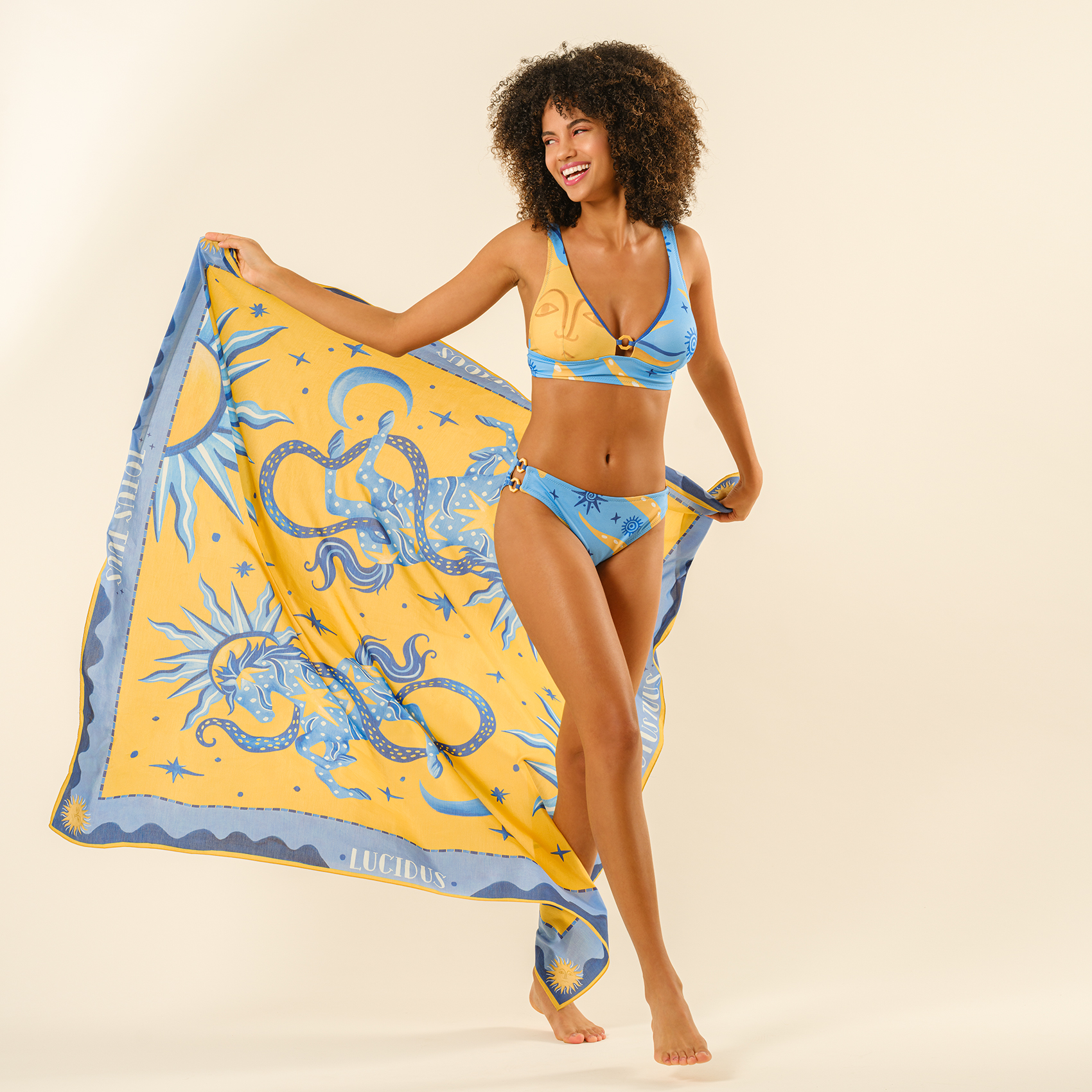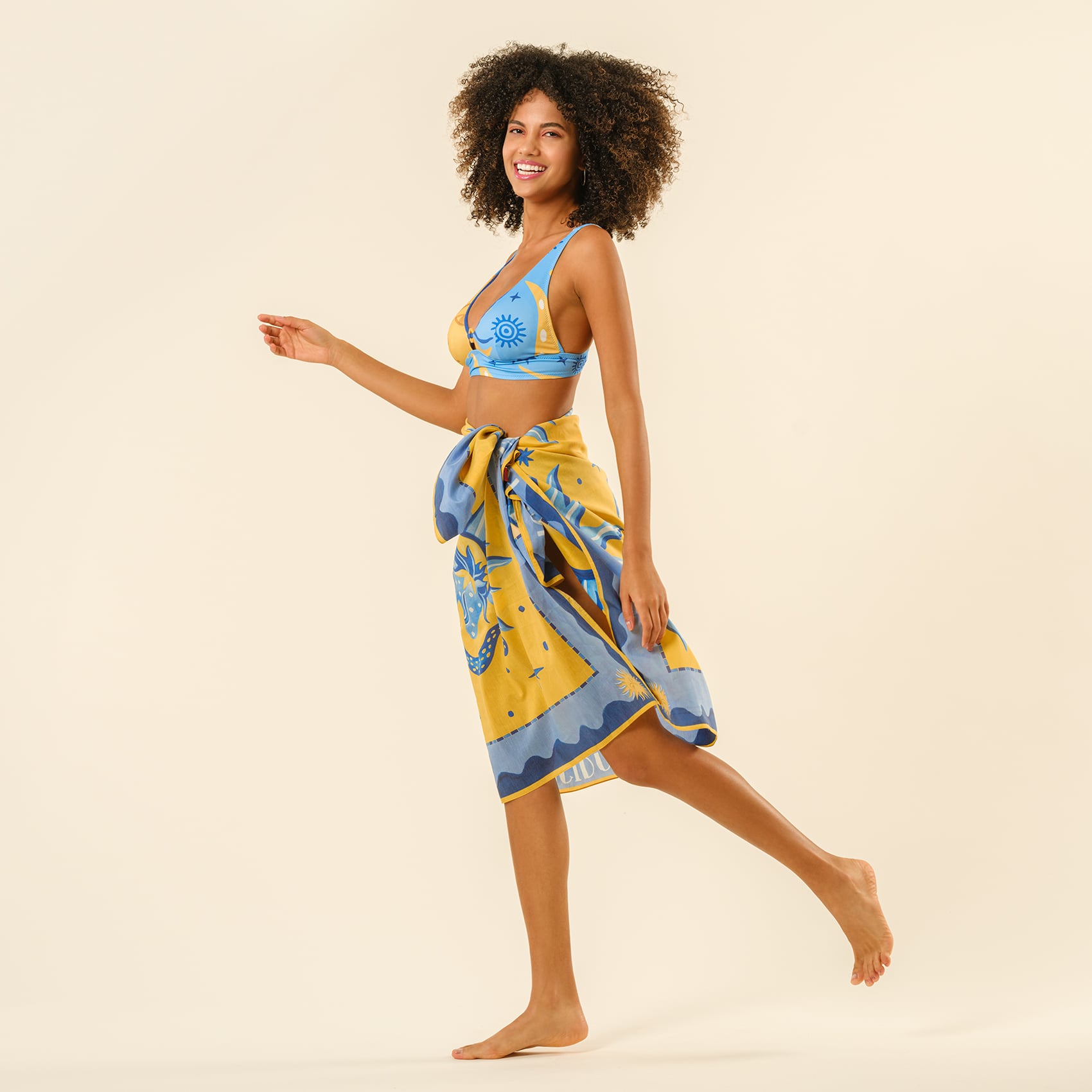 Yıldızlar ve güneş göz alıcı bir ahenkle üzerinizde dans ederken, Daphne bikini altı yazın ritmini yakalıyor. Yanlardaki zarif halka detayları ve altın tonlu sembolleriyle bu parça, Blue koleksiyonunun enerjisini cesur bir zarafetle yansıtıyor. Teninize ipeksi bir dokunuşla değen kumaşı, zararlı kimyasallardan uzak ve cilt dostu boyalarıyla da içinize su serpiyor. Elde yıkandığında ilk günkü formunu yıllarca korur. Daphne ile plajda yürümek, yıldızların arasında süzülmek gibi.