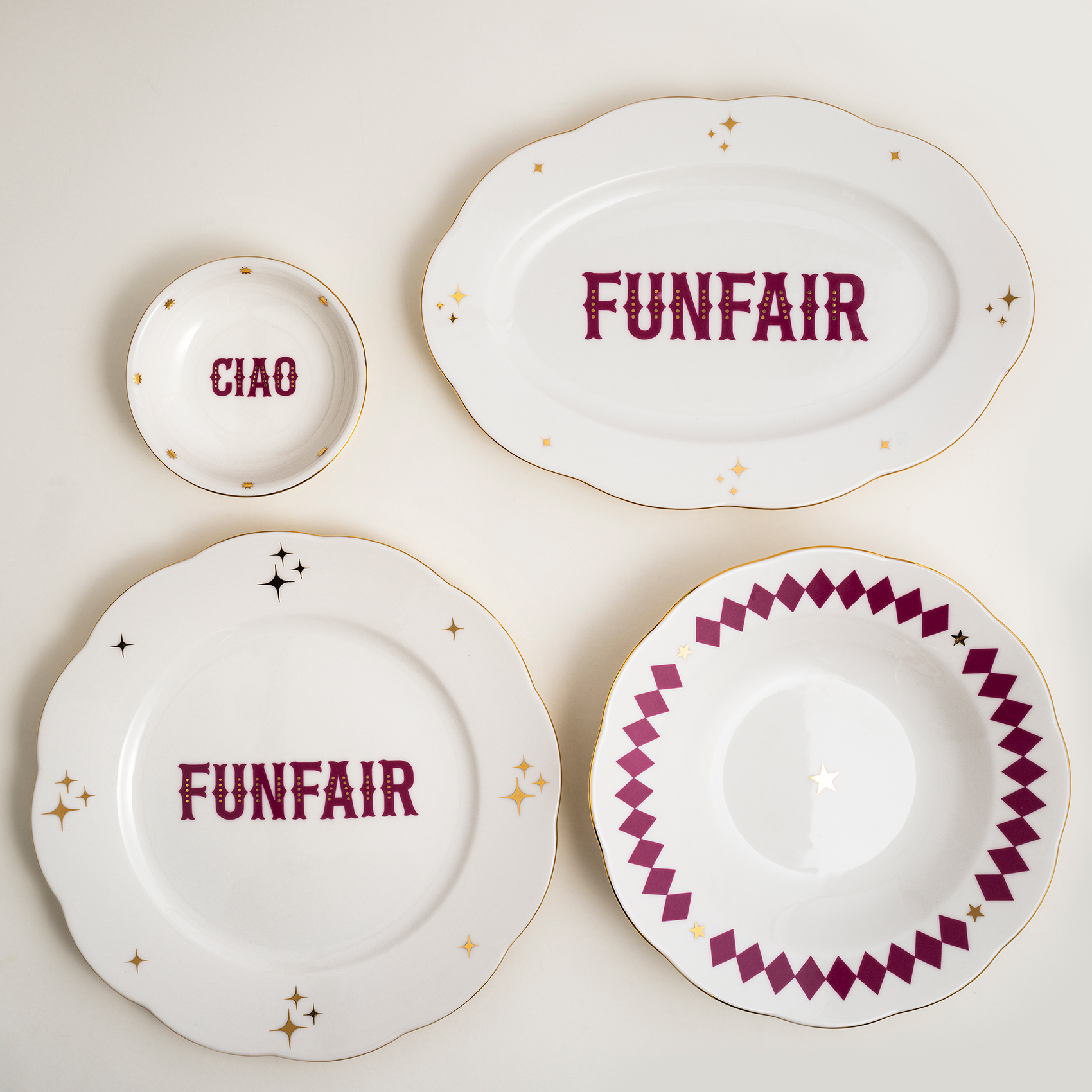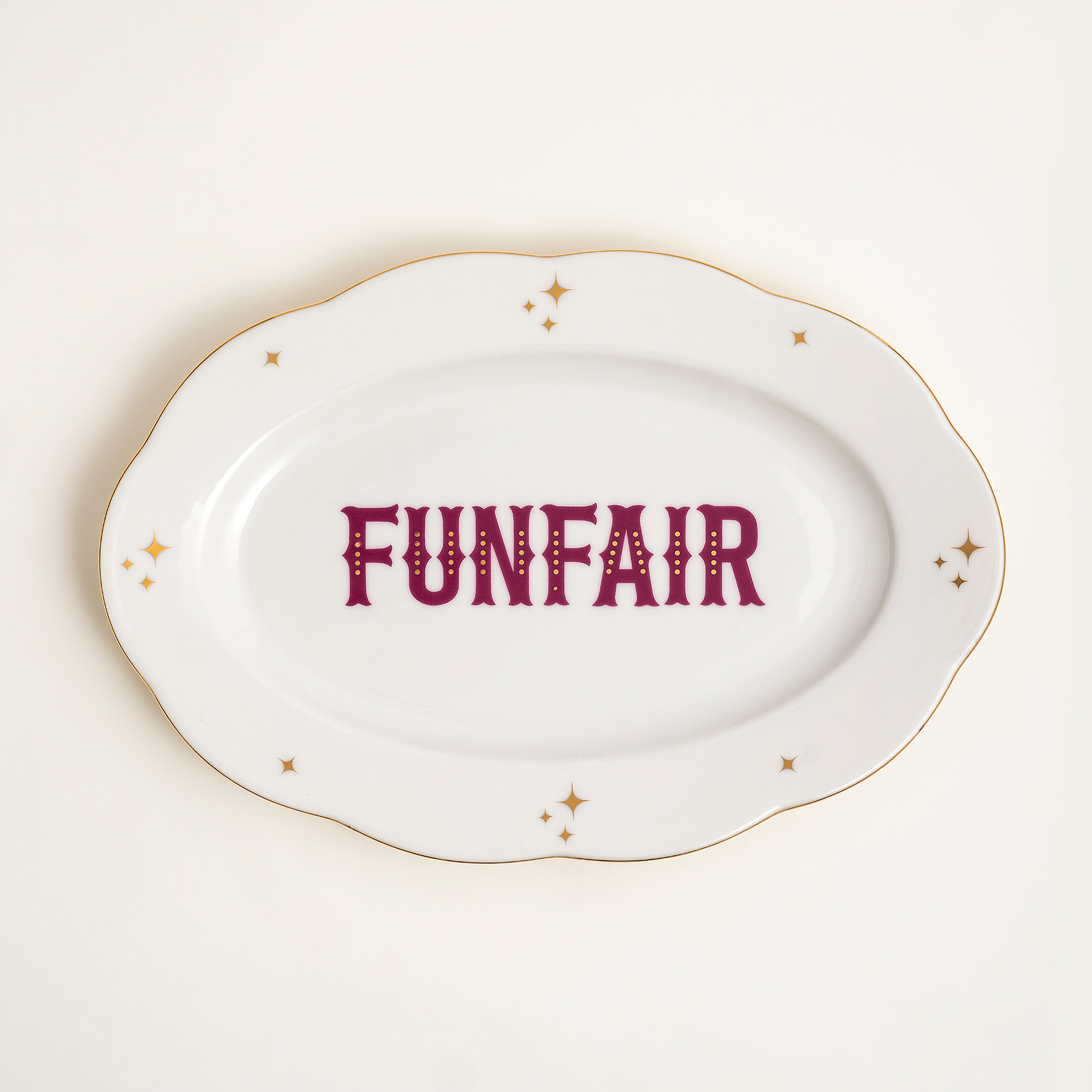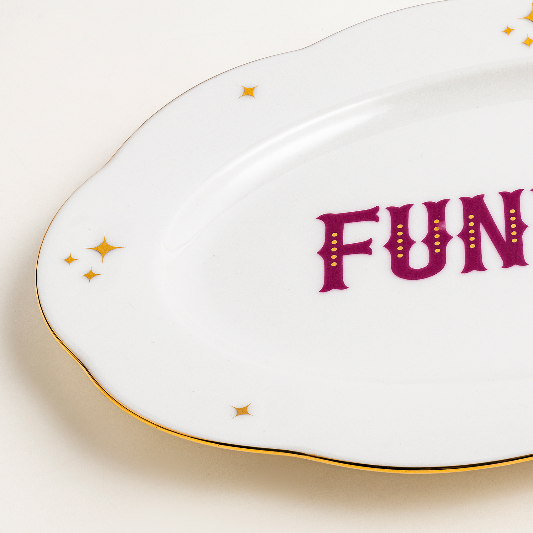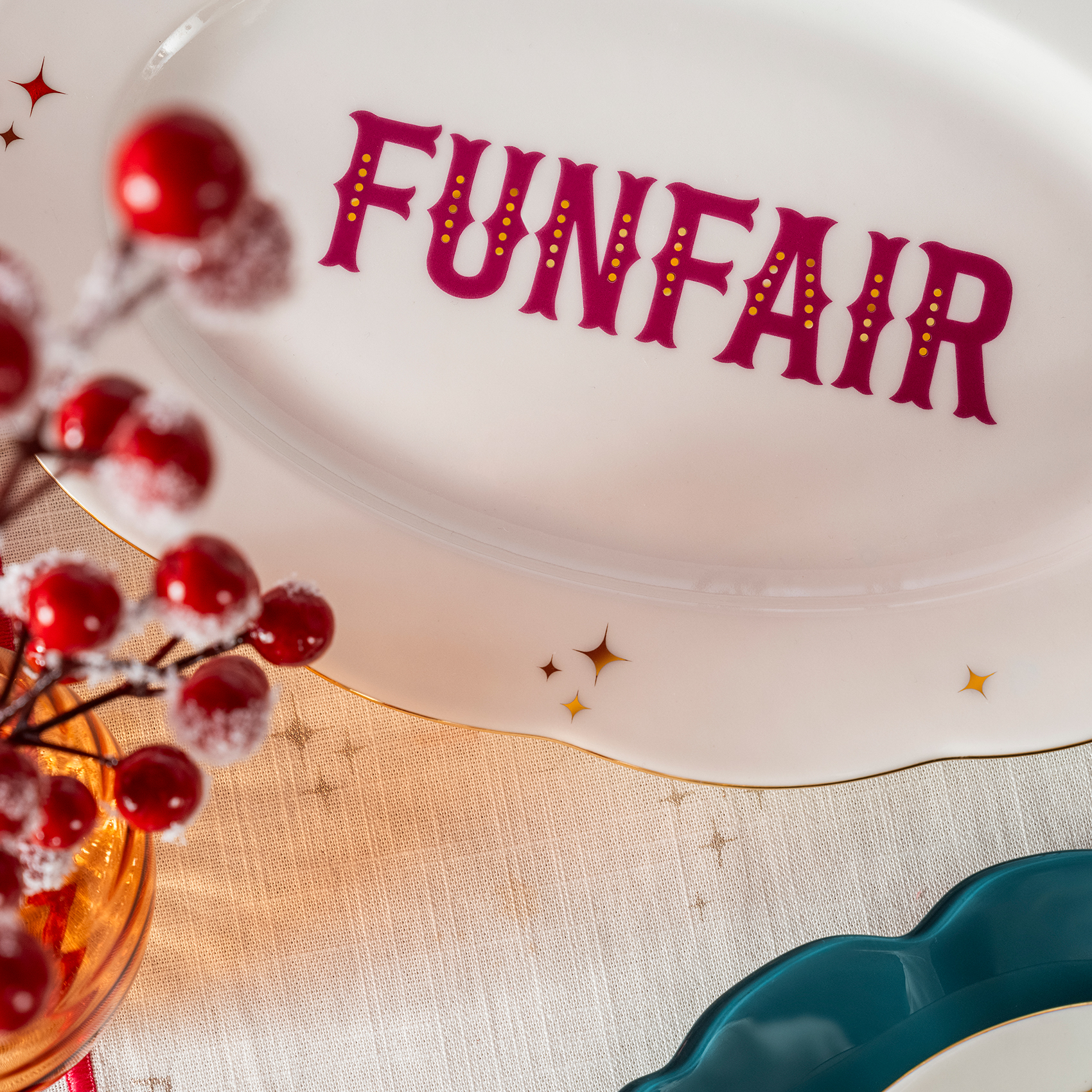 Masada dikkat çekmek isteyen bir servis tabağı mı? İşte karşınızda! Ortasında kocaman "FUNFAIR" yazısı ve altın rim detaylarıyla bu kayık tabak, sofranızda sadece yemek değil, bolca neşe sunmayı vaat ediyor. 30 cm’lik zarif yapısıyla hem şık görünüyor hem de eğlencenin merkezine oturuyor. Tatlı mı, mezeler mi? Hangi lezzeti taşırsanız taşıyın, bu tabak sahneyi çalacak. Sofranızda bir festival başlatmaya hazır olun, çünkü bu tabak masanın başrolünde yer alacak. Türkiye’de üretilmiştir.