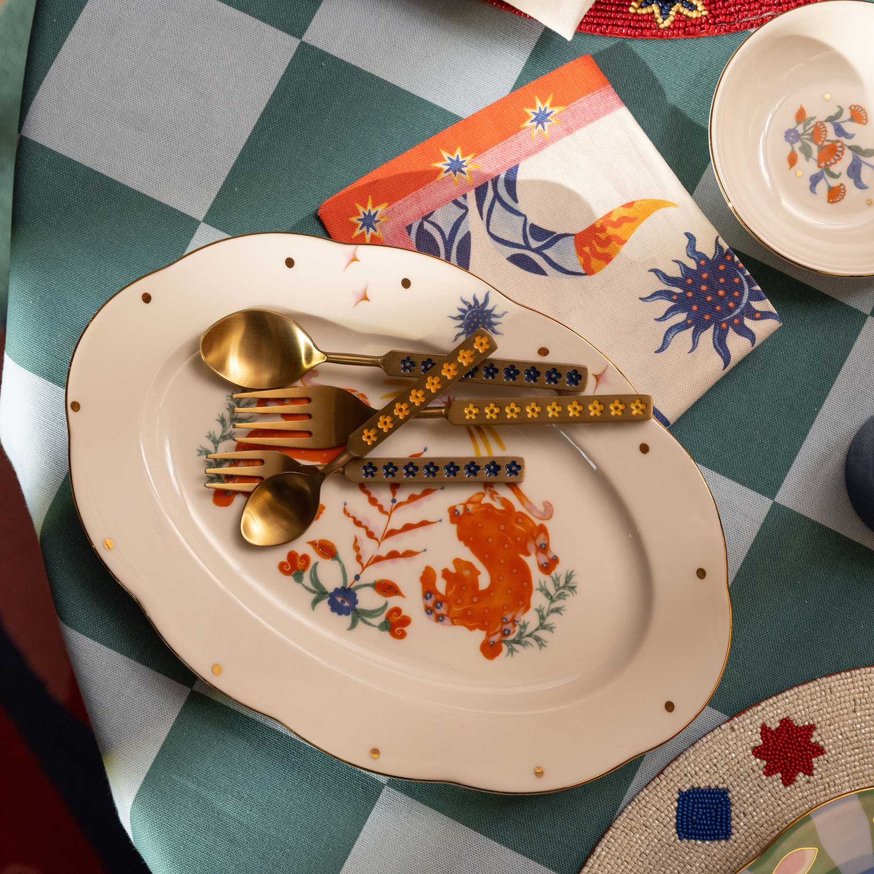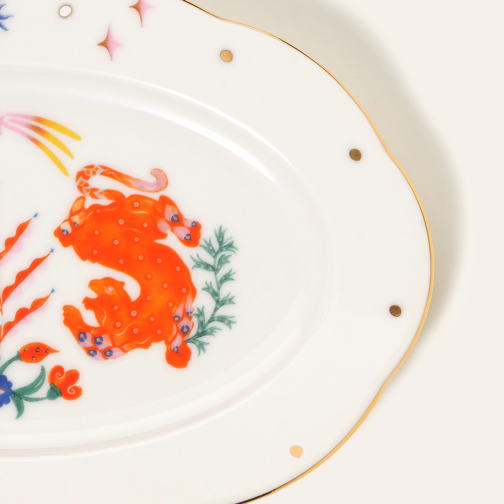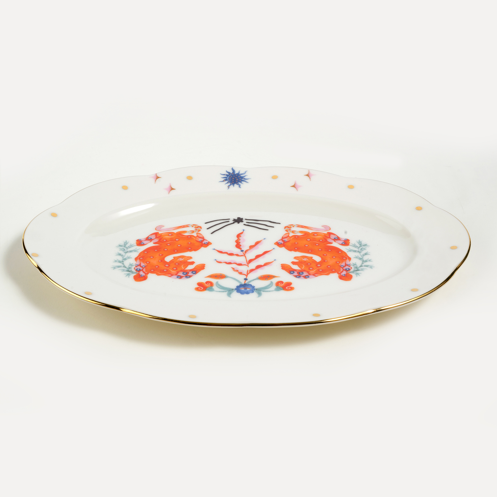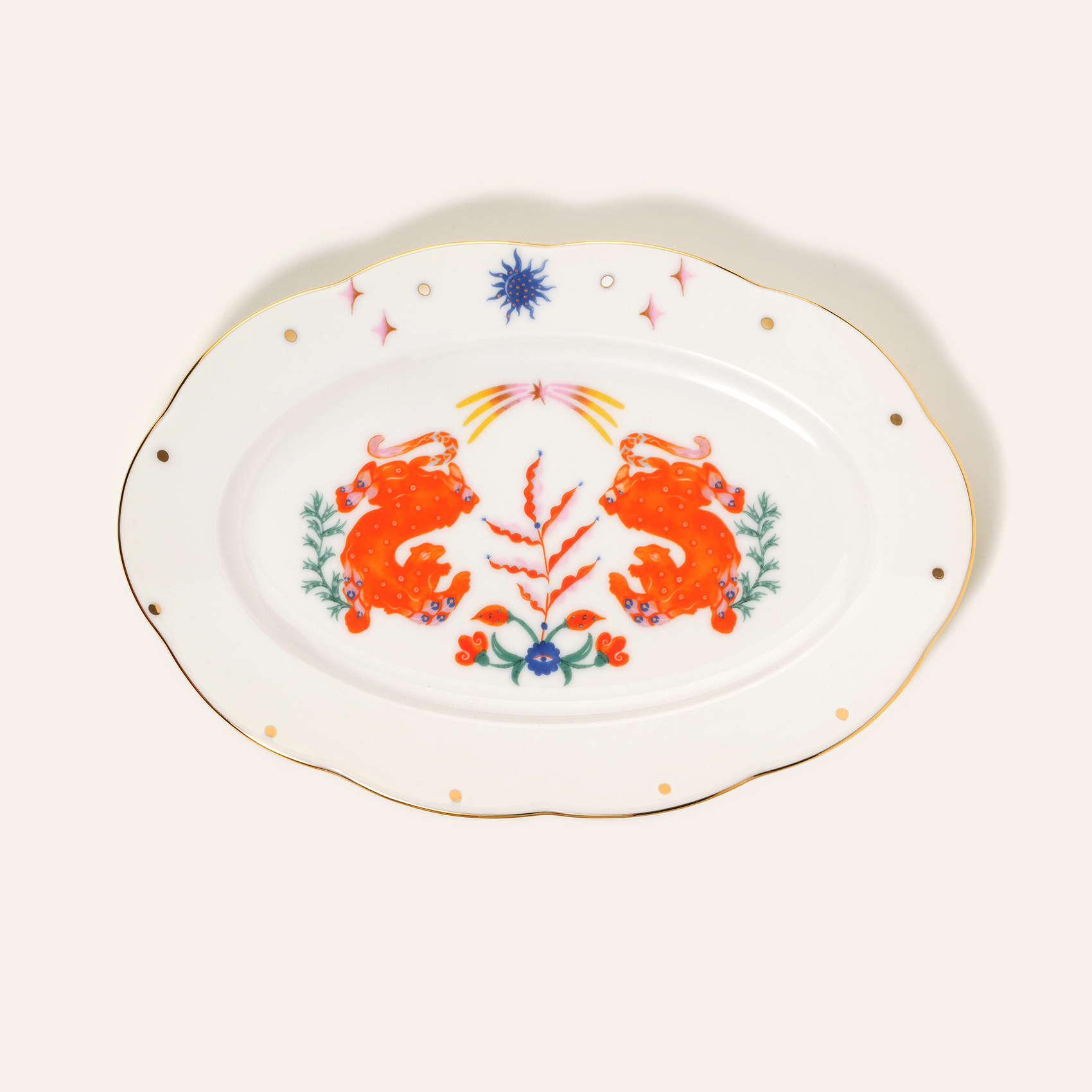 Renklerin cümbüşü, figürlerin oyunbazlığı, altın detayların zarafeti... Emet altın rimli porselen kayık tabak, sıradan sofralara maksimalist bir masal getiriyor. Karşılıklı duran mitolojik figürler, her bakışta yeni bir hikaye fısıldıyor; sofranda neşe ve tatlı bir şaşkınlık yaratıyor. Emet, eğlenceli bir koleksiyon parçası değil sadece, sofrana karakter katan bir masal kahramanı. Desenlerde Zsa Zsa Zsu tasarımcılarının imzası var. Türkiye’de üretildi.