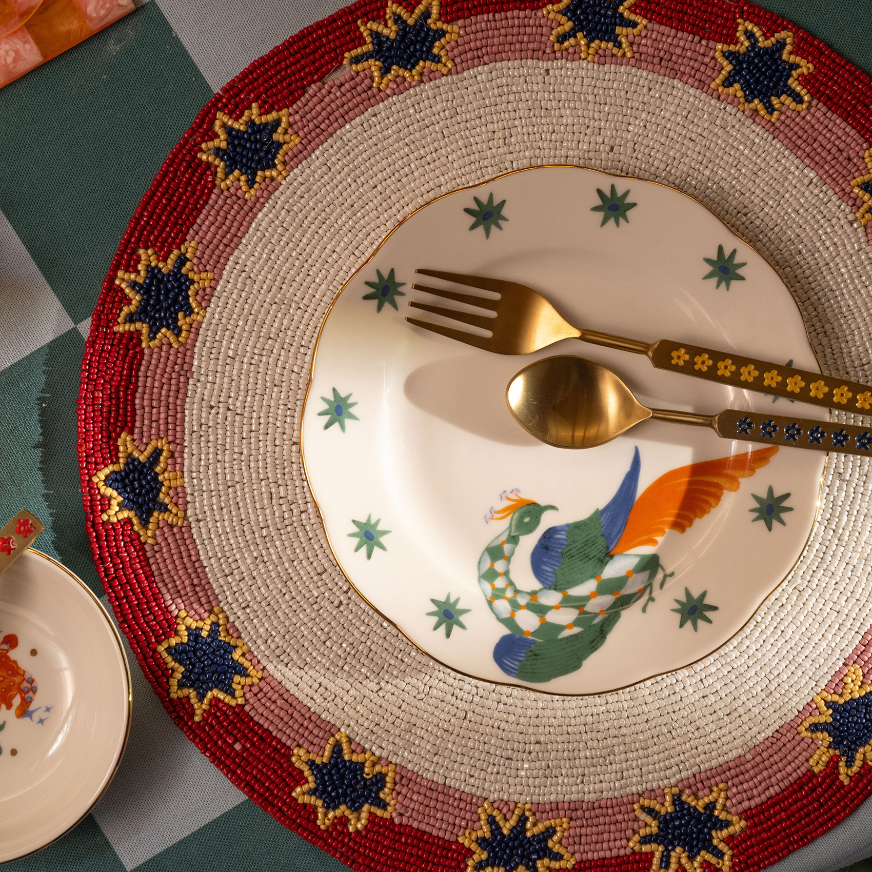 Masal kitabı değil, pasta tabağı. Emet altın rimli porselen pasta tabağının üzerinde fantastik bir dünya var. Renkler fısıldaşıyor, desenler arasında gizli kapılar açılıyor. Ejderha kılığına girmiş bir yılanla, yıldızları yelesine takmış bir kaplanla karşılaşabilirsiniz. Emet, sıradan bir pasta tabağı değil; tatlı keyfinizin ruhunu yükselten küçük bir sahne adeta. Kenarındaki altın çizgi ise final perdesi gibi: gösterişli, zarif ve unutulmaz. Zsa Zsa Zsu’nun çılgın hayal gücünden çıkan bu parça, sofranızda size ait, heyecanlı ve ilham dolu bir oyun kurmanız için tasarlandı.