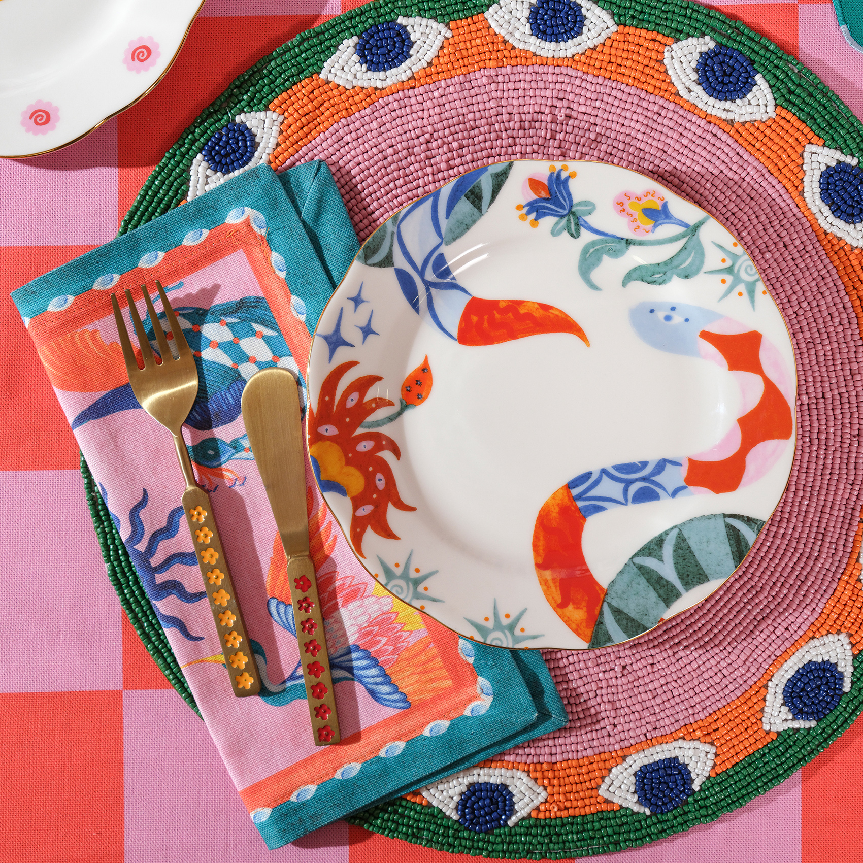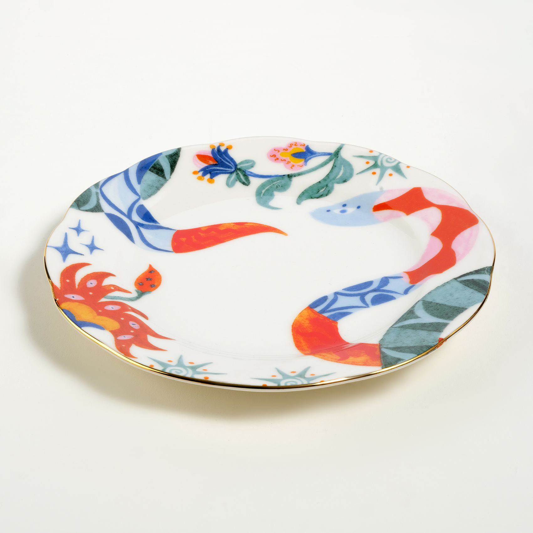 Masal kitabı değil, pasta tabağı. Emet altın rimli porselen pasta tabağının üzerinde fantastik bir dünya var. Renkler fısıldaşıyor, desenler arasında gizli kapılar açılıyor. Ejderha kılığına girmiş bir yılanla, yıldızları yelesine takmış bir kaplanla karşılaşabilirsiniz. Emet, sıradan bir pasta tabağı değil; tatlı keyfinizin ruhunu yükselten küçük bir sahne adeta. Kenarındaki altın çizgi ise final perdesi gibi: gösterişli, zarif ve unutulmaz. Zsa Zsa Zsu’nun çılgın hayal gücünden çıkan bu parça, sofranızda size ait, heyecanlı ve ilham dolu bir oyun kurmanız için tasarlandı.