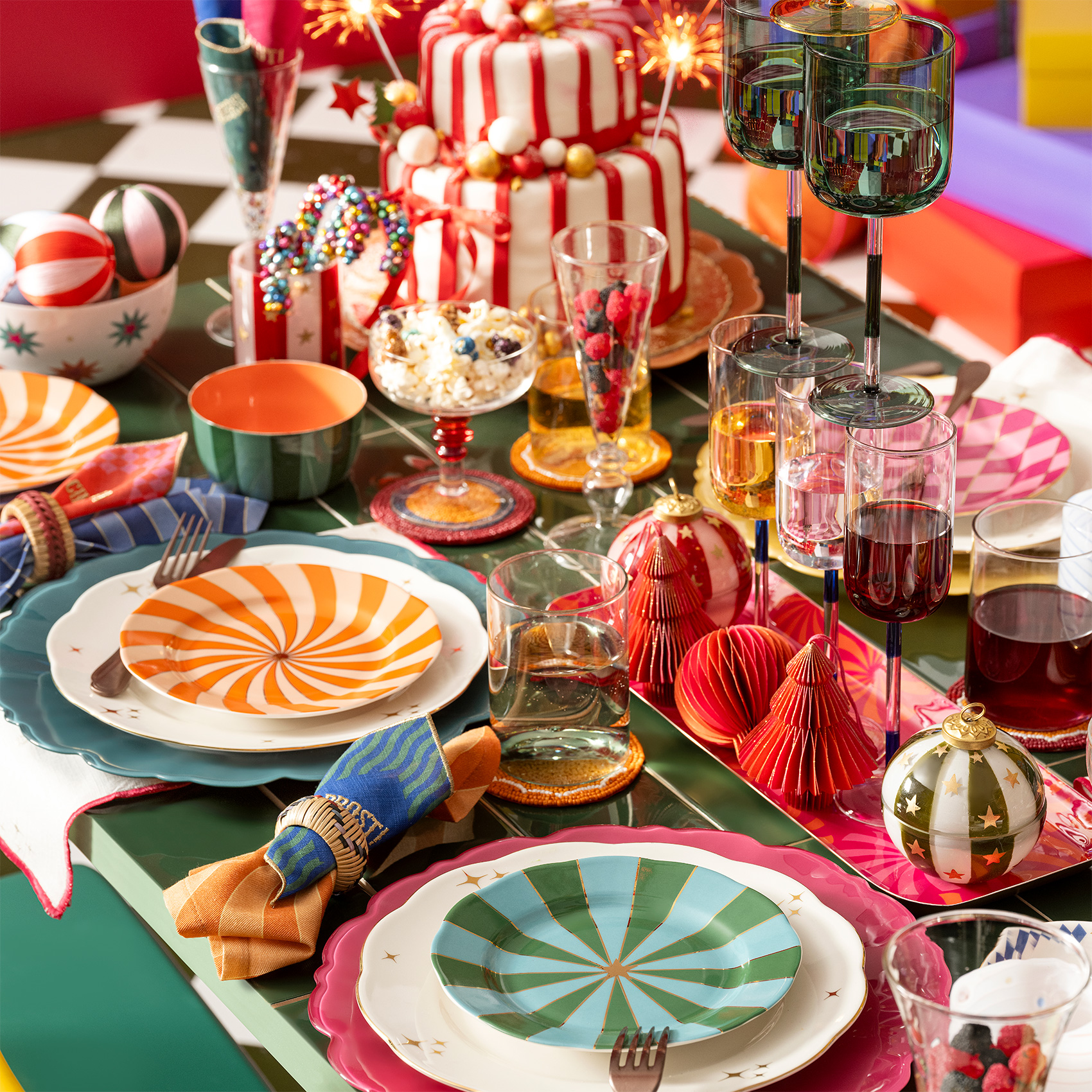 Sofralarınıza festival havası getirmek hiç bu kadar kolay olmamıştı! Funfair koleksiyonunun en renkli parçalarından biri olan Emet altın rimli porselen pasta tabağı, göz alıcı geometrik deseni ve neşeli rengiyle her buluşmayı bir şölene dönüştürüyor. Bu pasta tabağı ile tatlılarınızı sunarken masanızda adeta bir renk karnavalı yaratabilirsiniz! Dalgalı desenler, dönme dolapları anımsatan çizgilerle buluşurken, Funfair koleksiyonunun eğlenceli ruhu her öğünde hissediliyor. Sofralarınıza renk ve enerji katmak için Funfair koleksiyonunun bu zarif parçalarını keşfedin, yeni yılın coşkusunu yılın her anı sofranızda yaşayın