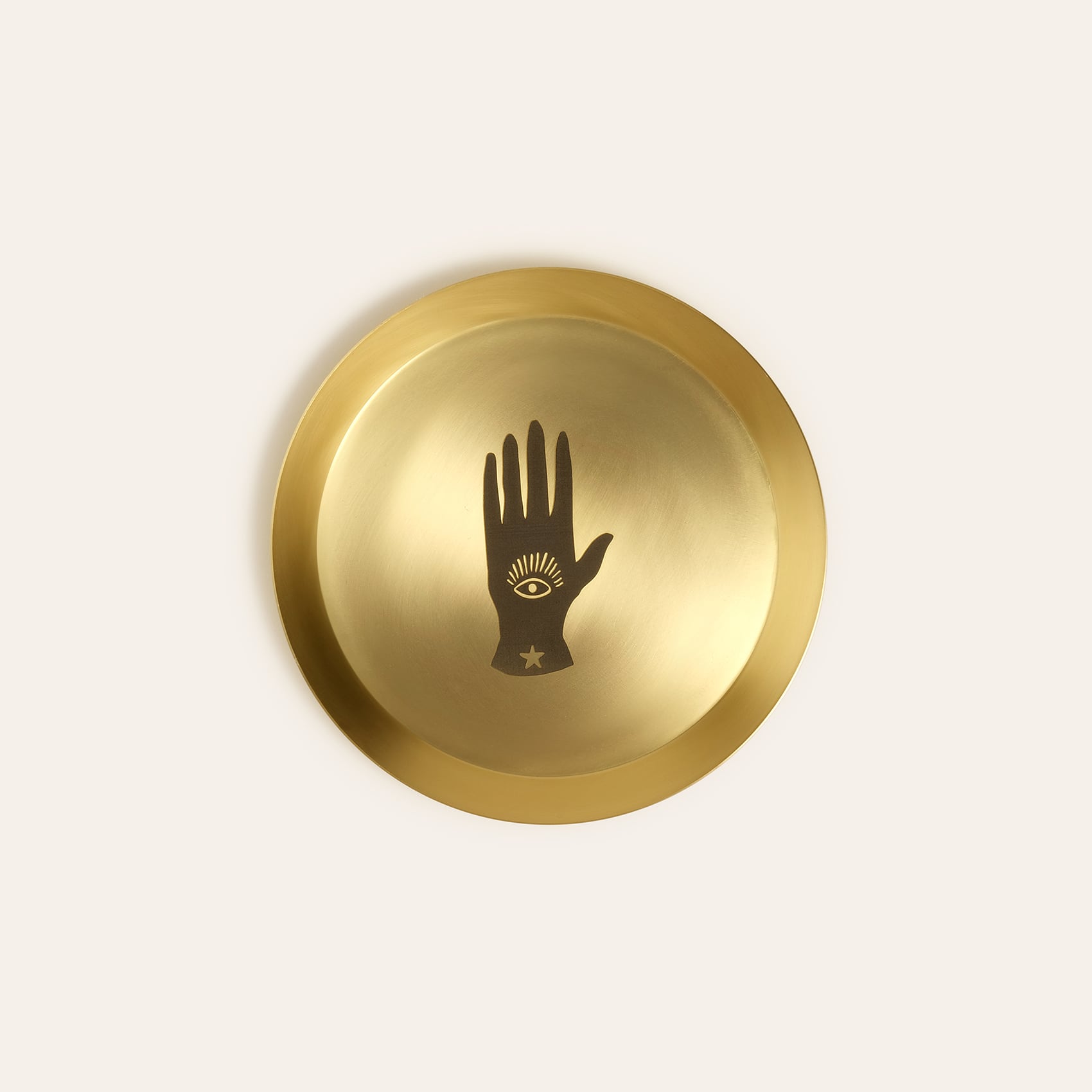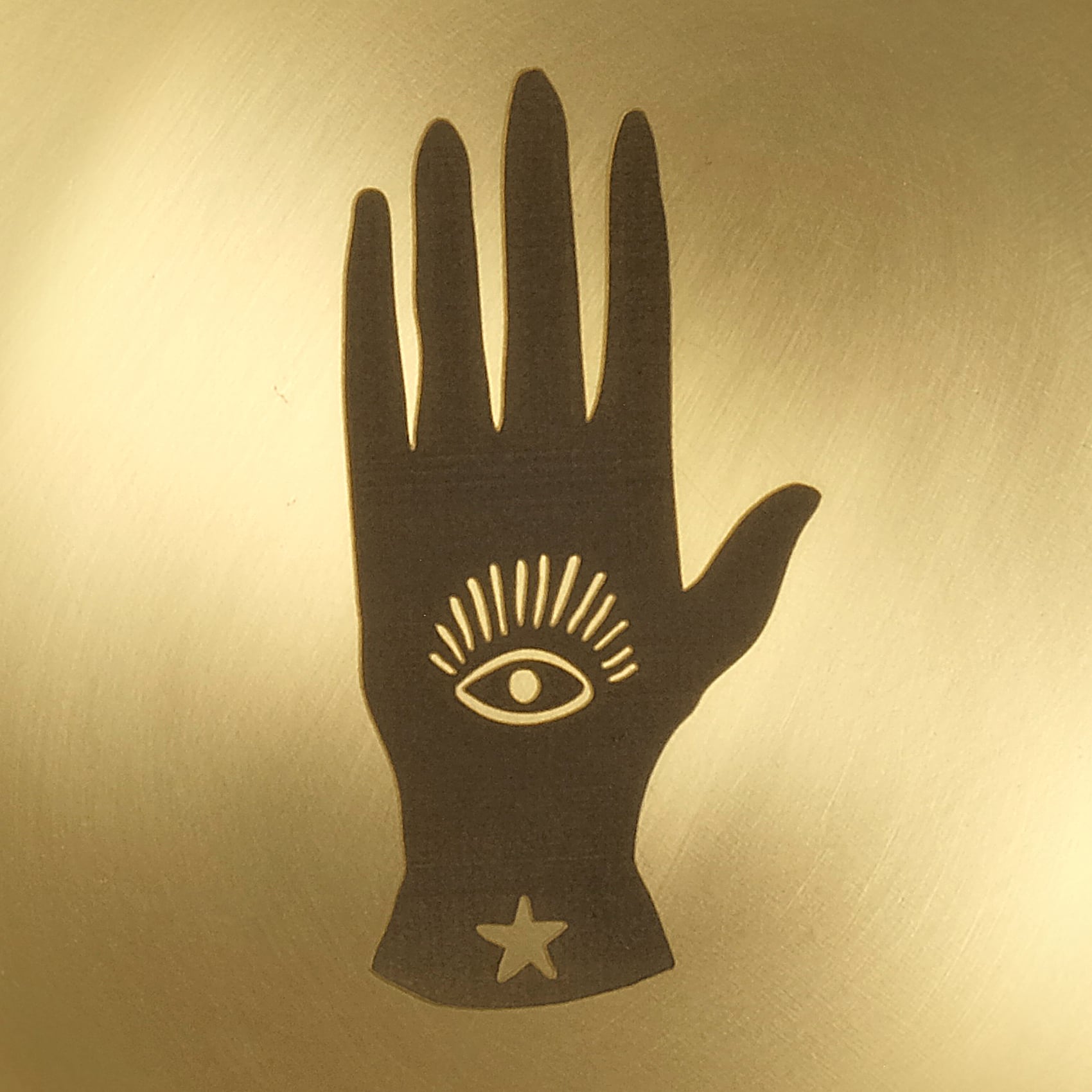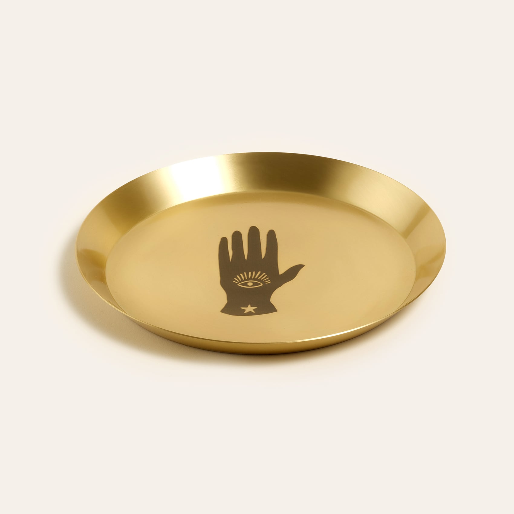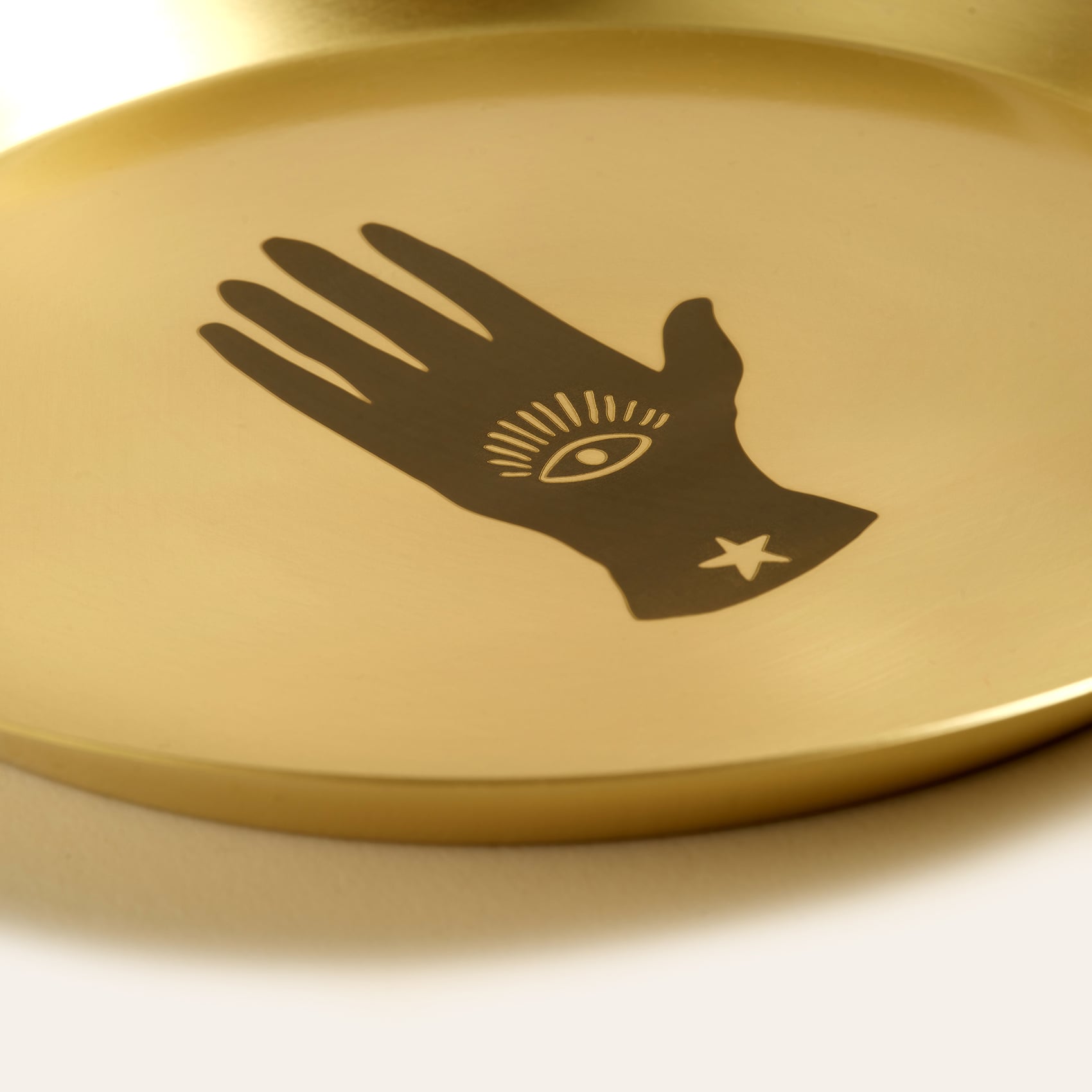 Blue koleksiyonunun Akdeniz’den gelen sofistike esintisi, bu kez altın gibi parlayan bir tabakta karşımızda. Mat yüzeyinde güneş gibi bir ışıltı, ortasında ise gizemli bir bakış var. Zsa Zsa Zsu tasarım ekibinin çizdiği elde göz ve minik yıldız deseni, lazerin zarif dokunuşuyla yüzeye işlenmiş. Tıpkı ışıkla yazılmış bir sembol gibi… Bir koruma işareti olmaktan çıkıp sofranızın en stil sahibi sohbet başlatıcısına dönüşüyor. Biraz spiritüel, biraz sır dolu, bolca havalı. Emet pirinç tabak, bulunduğu her yere ruh katmakta usta. Tek başına bir sahne yıldızı gibi parlıyor. Blue koleksiyonunun diğer parçalarıyla buluştuğundaysa tam anlamıyla görsel bir şiire dönüşüyor.