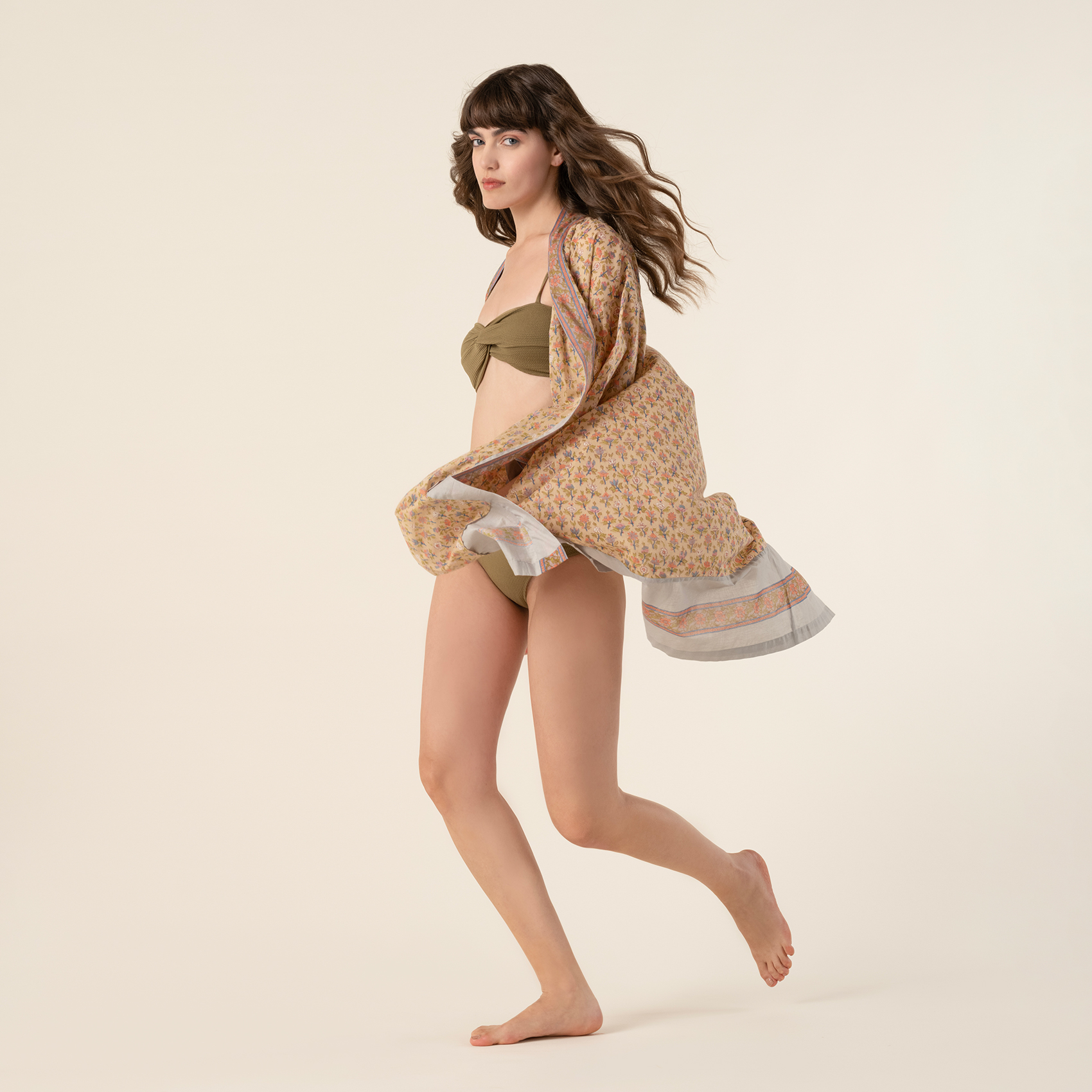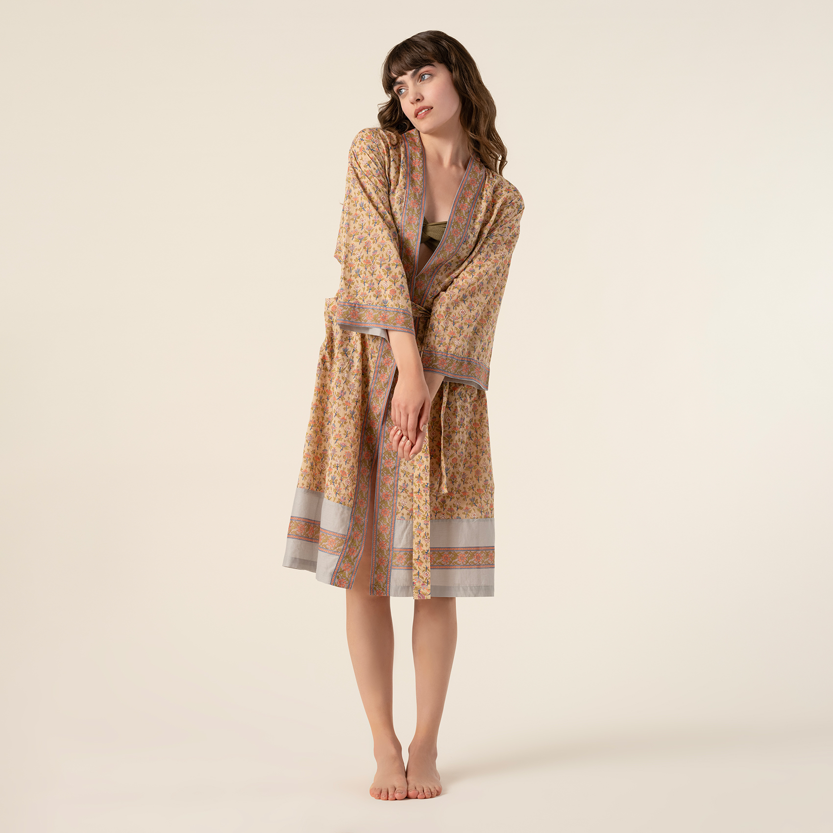 Gaya kimono ile Heritage koleksiyonunun otantik desenlerini ve sofistike renklerini plaj stilinize taşıyın. Blok baskı tekniğiyle kumaşa aktarılan eklektik motifleri ve dikiş detaylarıyla rahat ve şık bir siluet yaratan Gaya kimono, Hindistan’da yaşayan usta zanaatkarlar tarafından %100 pamuktan üretilmektedir.