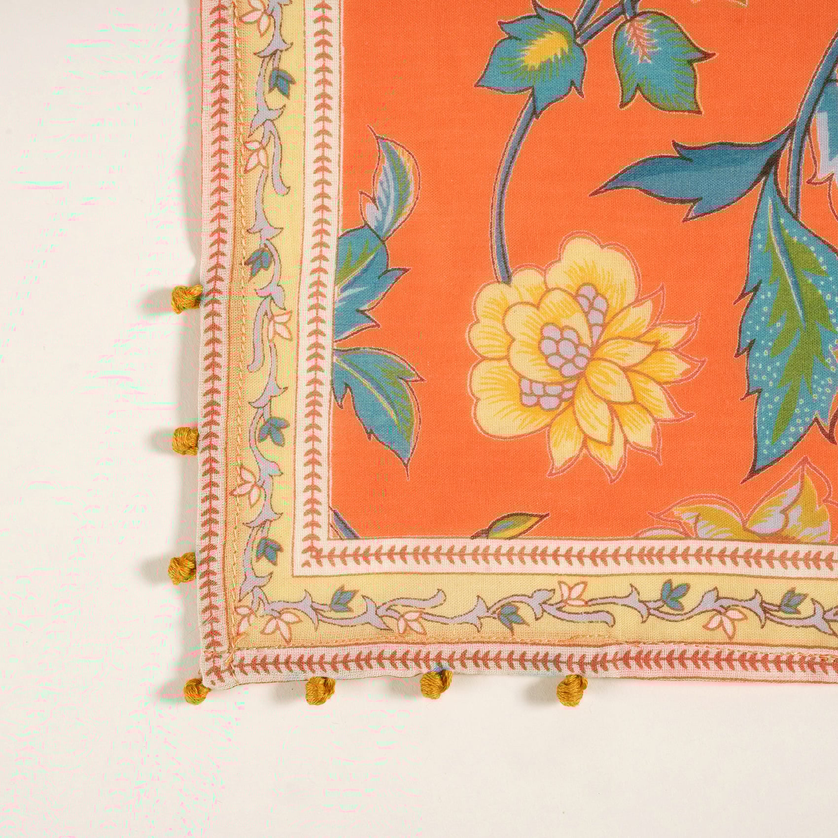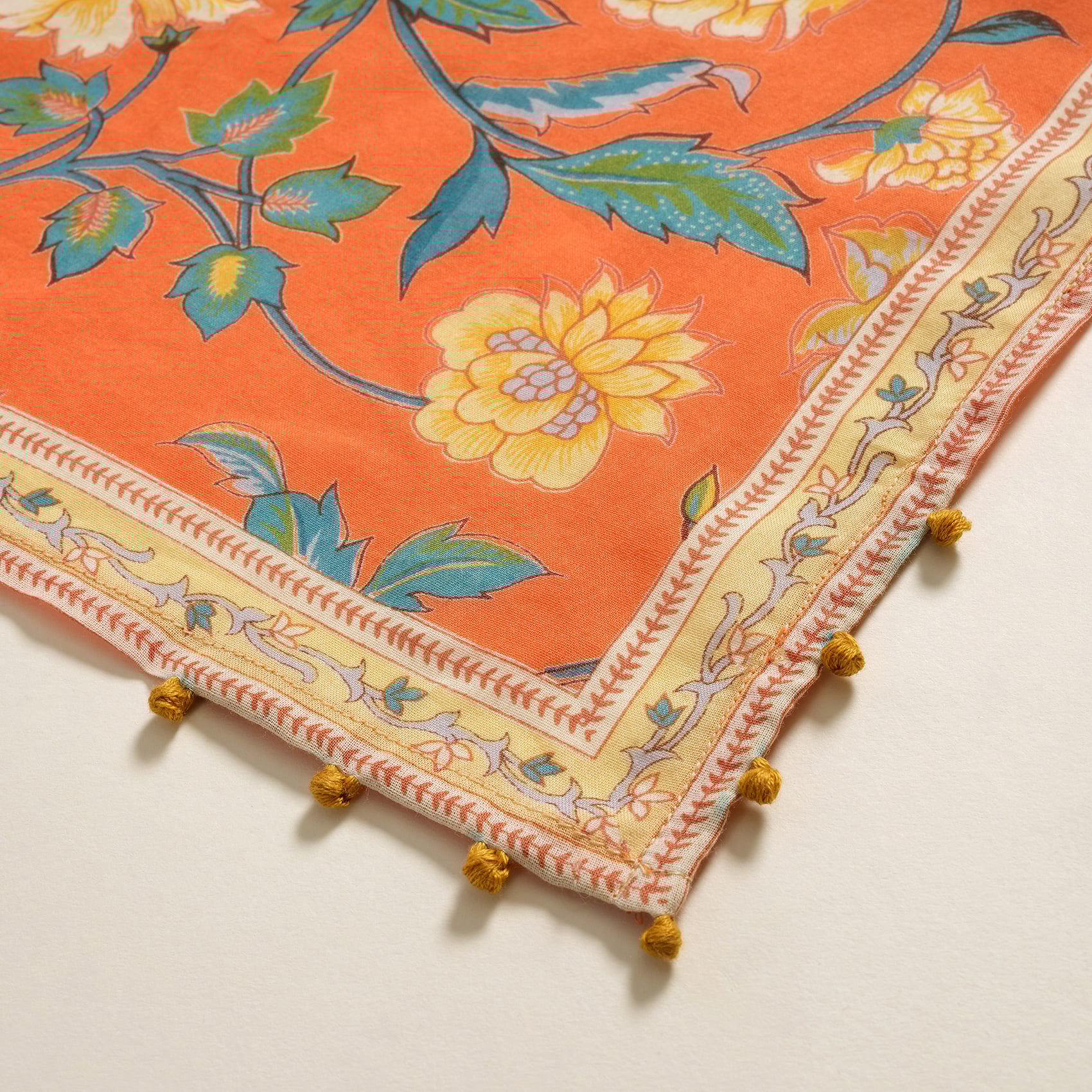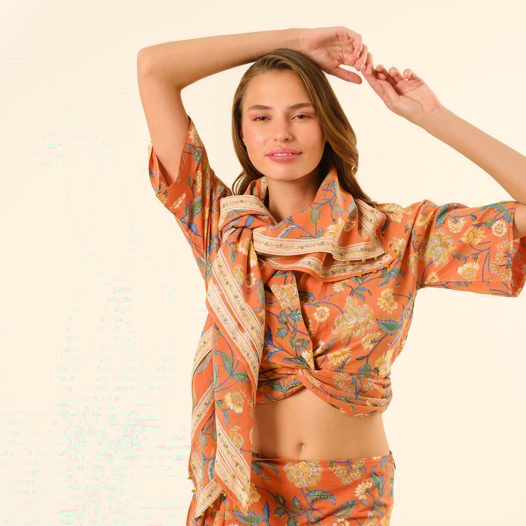Gaya baskılı kenar ponponlu %100 pamuk şal, Hindistan’ın geleneksel block print sanatını alıp ona yepyeni bir ruh katıyor! Sıcak turuncu tonları ve el işçiliğiyle işlenen desenleriyle stilinize enerji, hafif pamuk dokusuyla gün boyu konfor getiriyor. Kenarlarını süsleyen ponponlar her hareketinizde ritme eşlik ederken, bu şalı omuzlarınıza atabilir, saçlarınıza bağlayabilir ya da belinize dolayarak kendi tarzınızı yaratabilirsiniz. Gaya, geçmişten ilham alırken anı yaşayanların, özgür ruhların ve stilinde eğlenceye yer açanların favorisi olmaya aday!