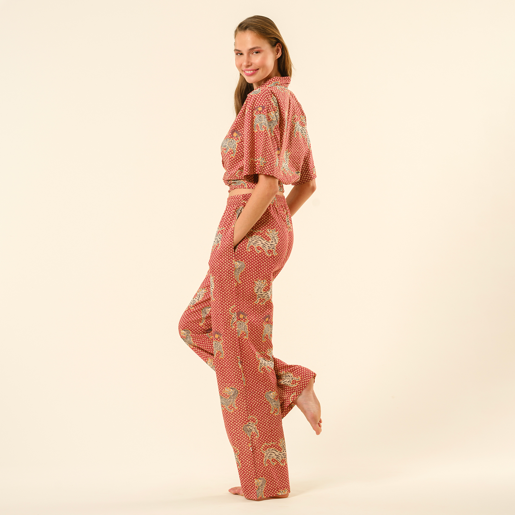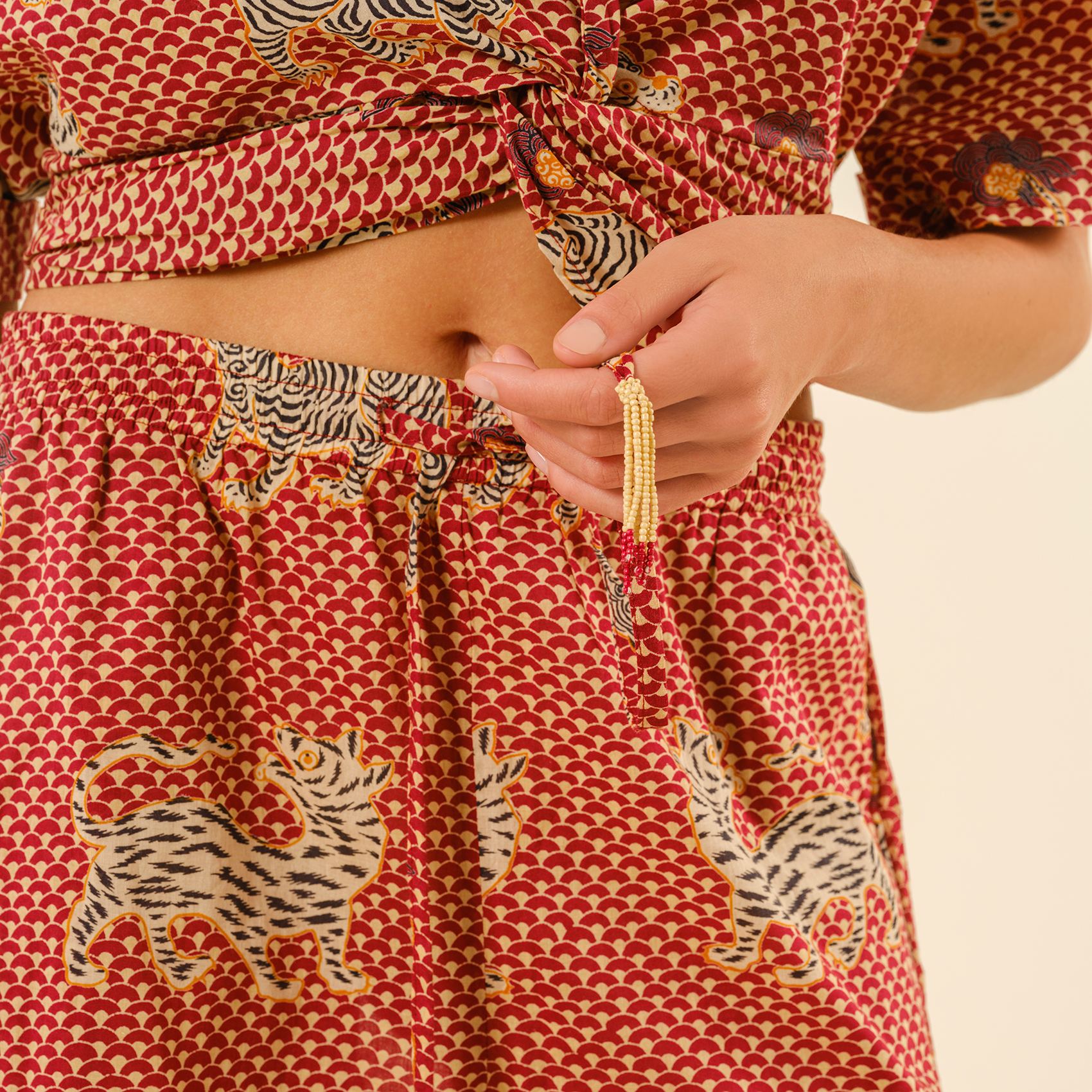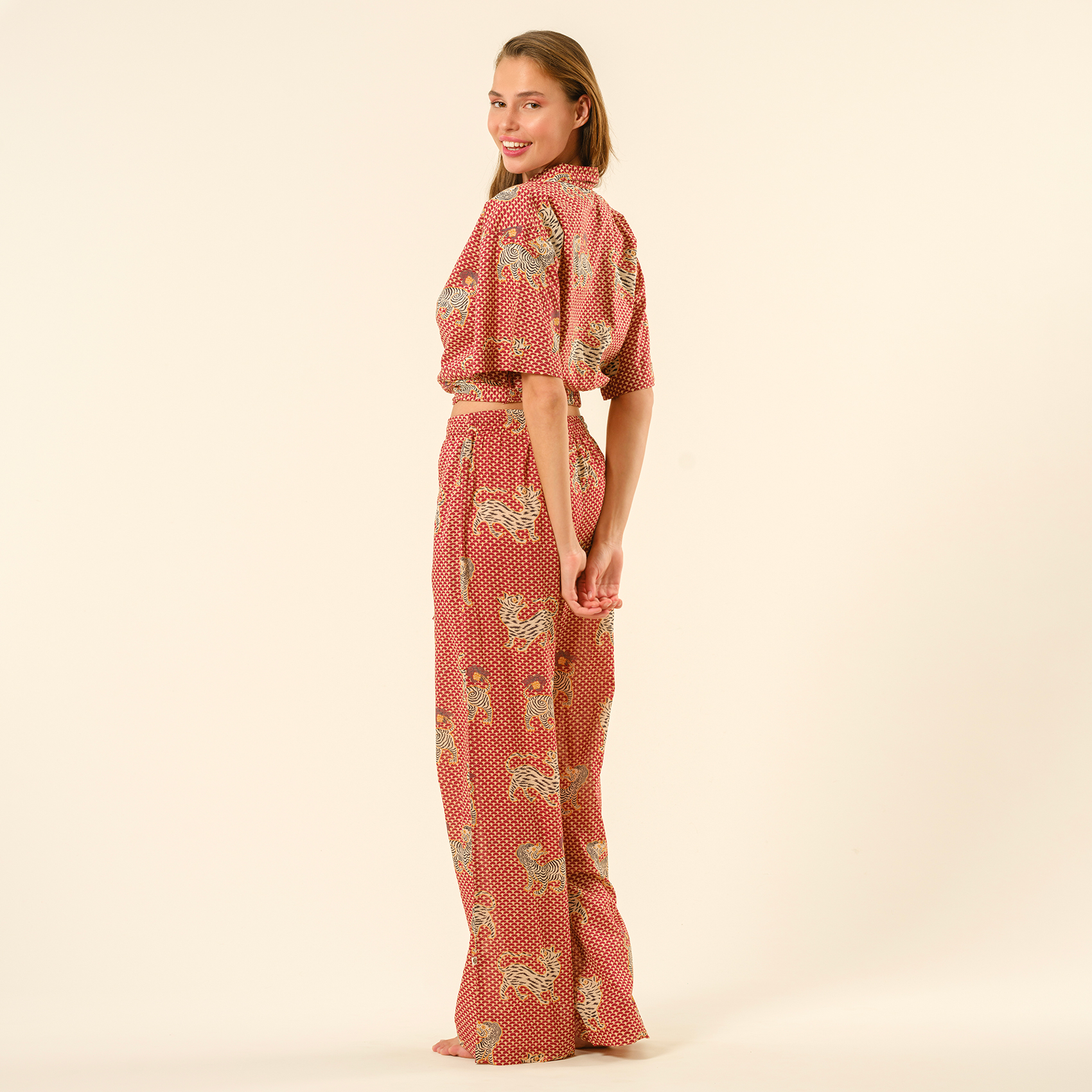 Gaya baskılı %100 pamuk pantolon, geleneksel el işçiliğini enerjik ve modern bir ruhla buluşturuyor. Hindistan’ın köklü baskı sanatıyla şekillenen bu pantolon, hareketli desenleri ve sıcak kırmızı tonlarıyla stilinize cesur bir dokunuş katıyor. Hafif ve nefes alabilen %100 pamuklu dokusu, gün boyu konfor sağlarken yüksek belli kesimi ve akışkan formu özgürce hareket etmenizi sağlıyor. Sahilde yalınayak gezmekten şehirde şık bir yürüyüşe kadar her ana uyum sağlayan Gaya, tarzını özgürce ifade etmek isteyenler için tasarlandı!