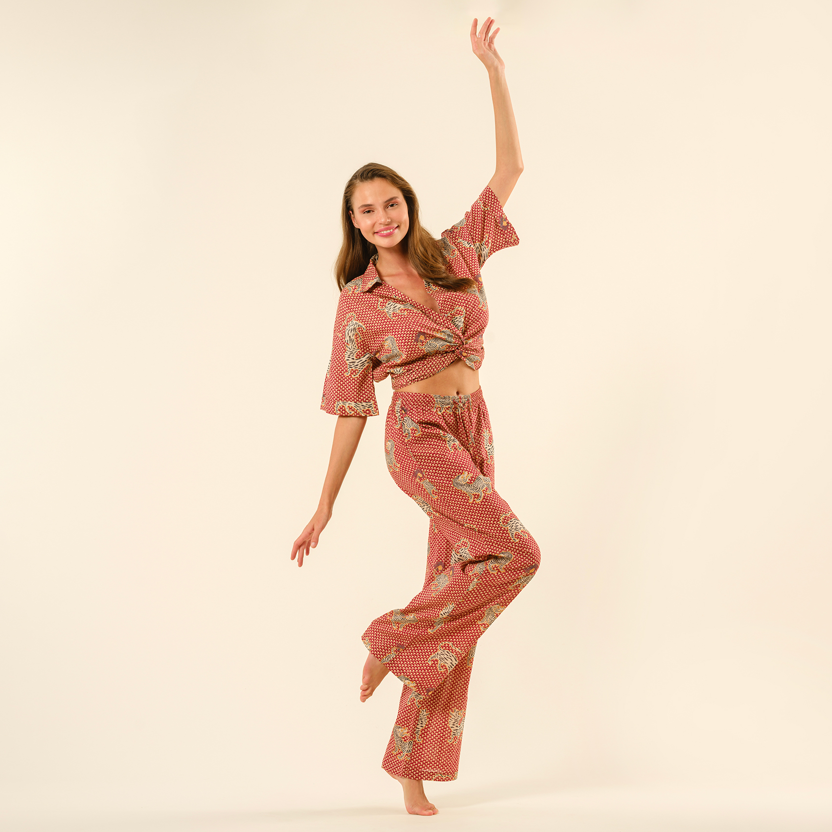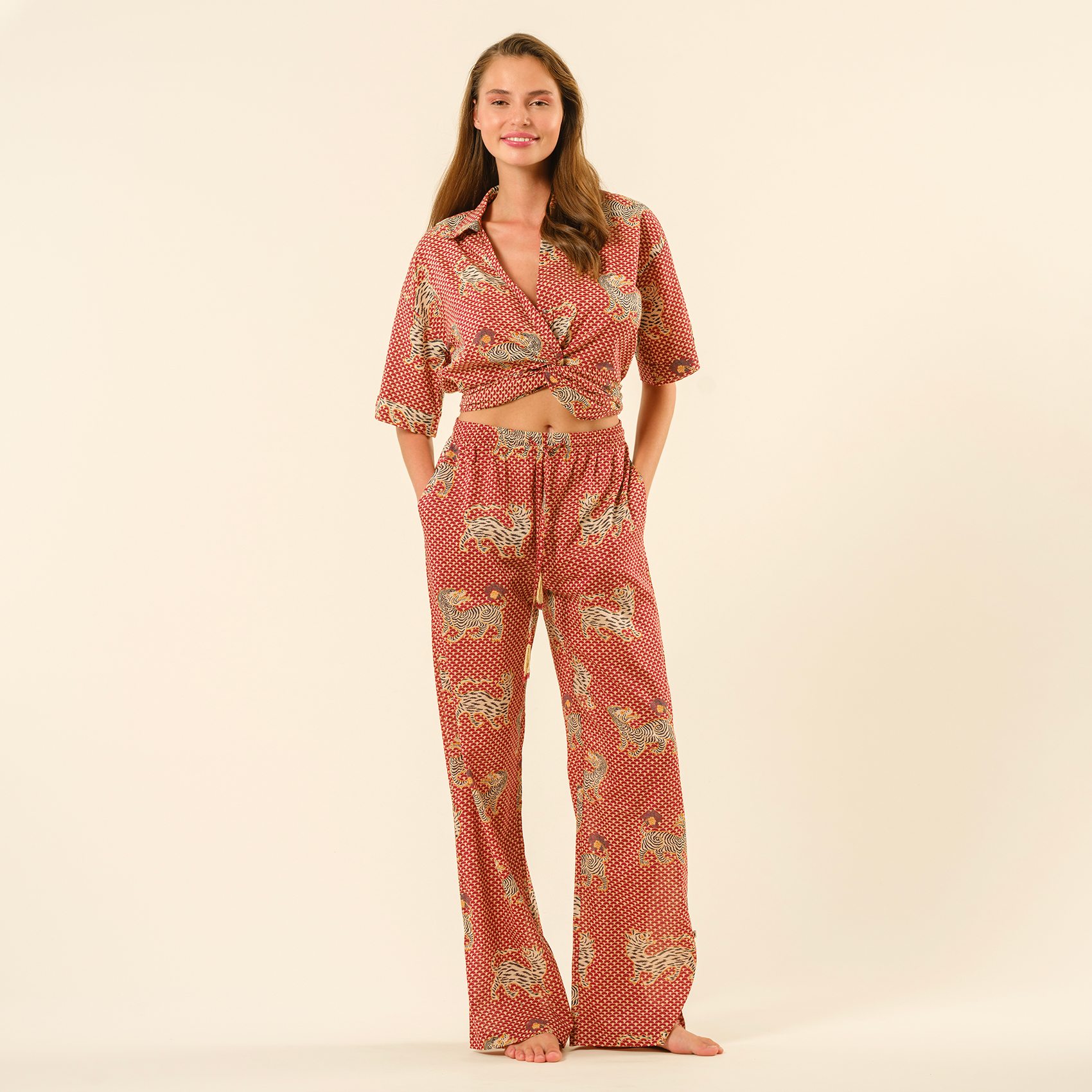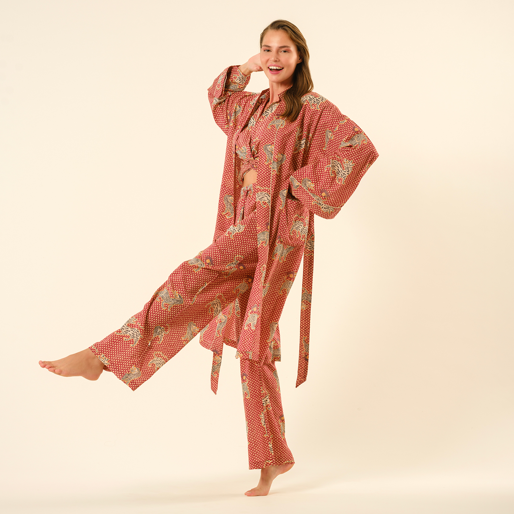 Gaya baskılı %100 pamuk pantolon, geleneksel el işçiliğini enerjik ve modern bir ruhla buluşturuyor. Hindistan’ın köklü baskı sanatıyla şekillenen bu pantolon, hareketli desenleri ve sıcak kırmızı tonlarıyla stilinize cesur bir dokunuş katıyor. Hafif ve nefes alabilen %100 pamuklu dokusu, gün boyu konfor sağlarken yüksek belli kesimi ve akışkan formu özgürce hareket etmenizi sağlıyor. Sahilde yalınayak gezmekten şehirde şık bir yürüyüşe kadar her ana uyum sağlayan Gaya, tarzını özgürce ifade etmek isteyenler için tasarlandı!