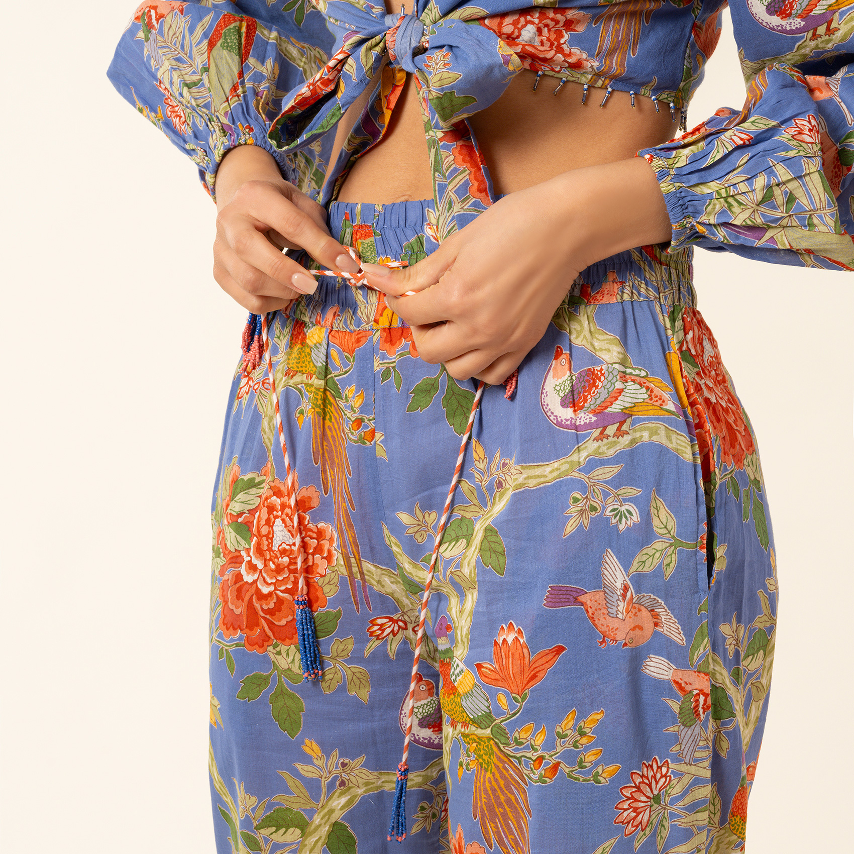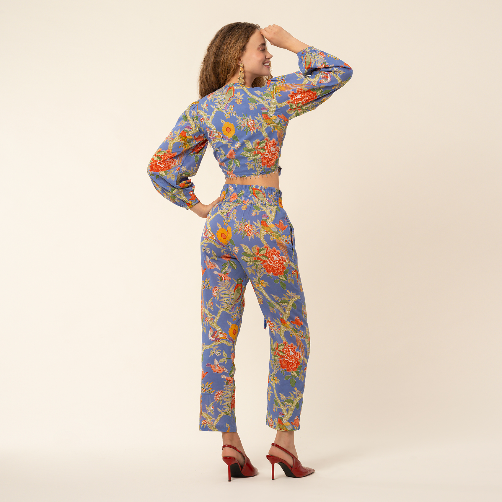 Gaya pantolon, otantik el baskısı geleneğini modern yaşamın enerjisiyle birleştiriyor. Mavi zemin üzerinde hayat bulan sofistike çiçek ve yaprak motifleri, %100 pamuk kumaşın hafifliğiyle buluşarak gün boyu konfor ve özgür bir his sunuyor. Yüksek bel formu ve bağcık detayı silueti vurgularken, formu tasarıma zarif bir akış katıyor. İlham verici desenleriyle modern şehir stiline özgün bir yorum getiriyor.