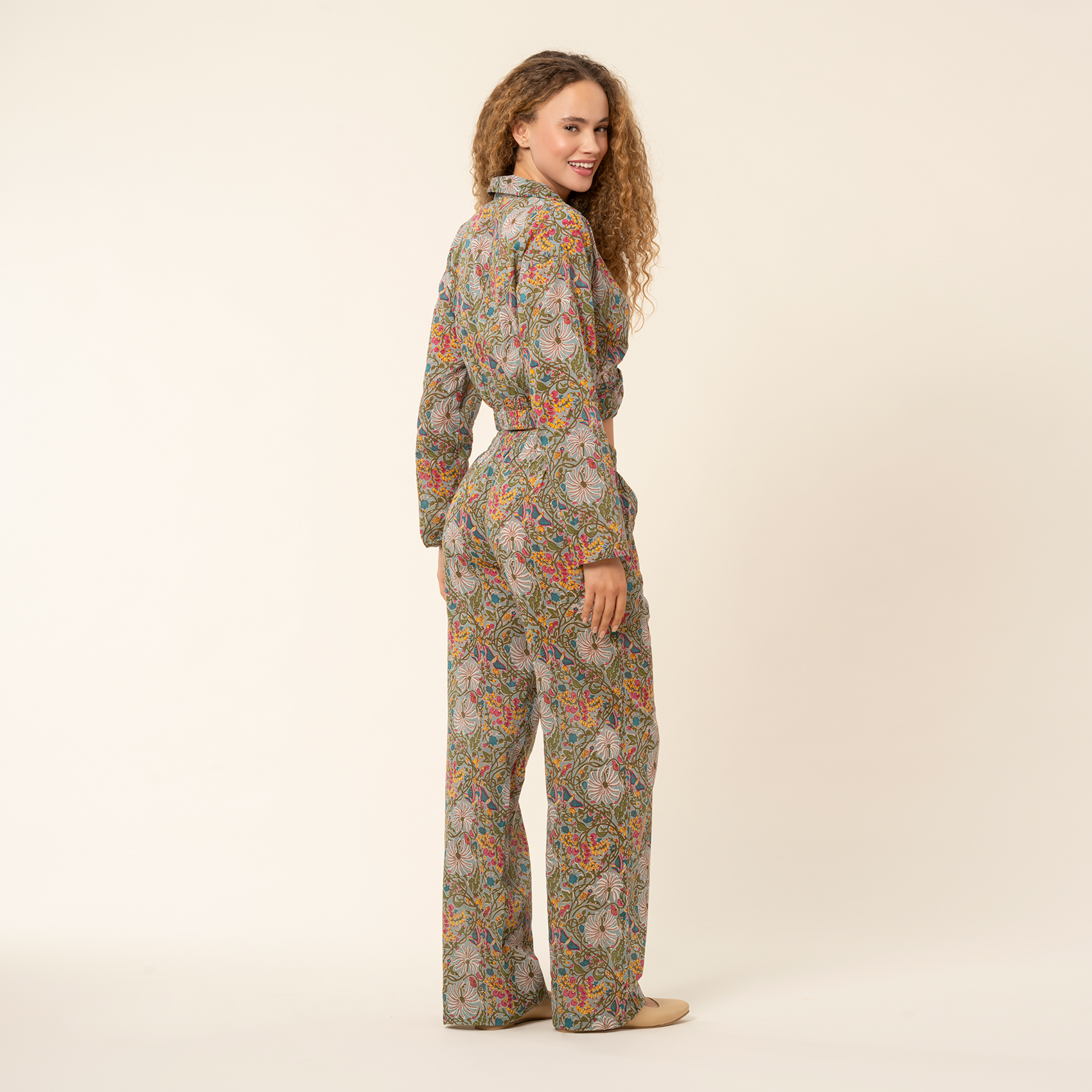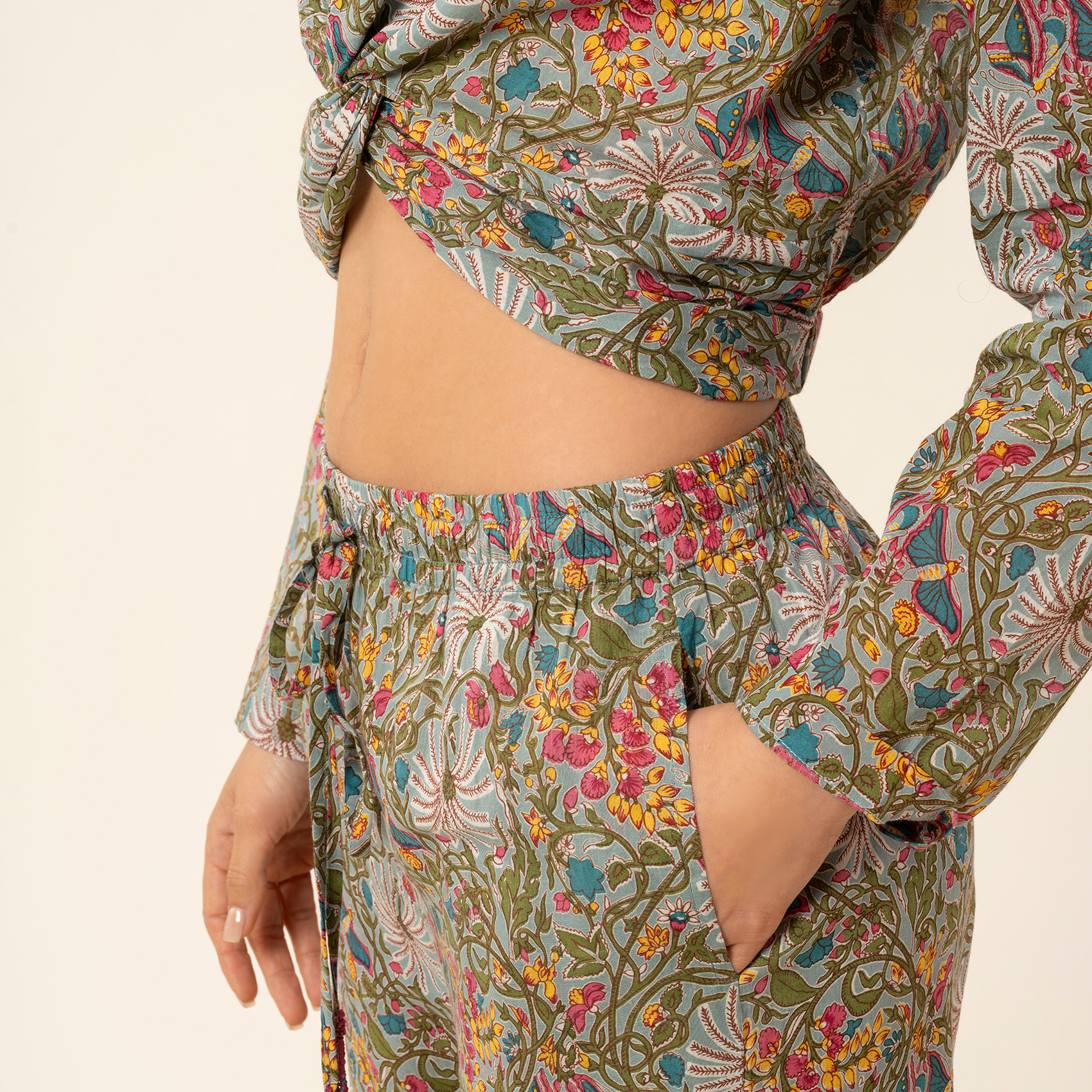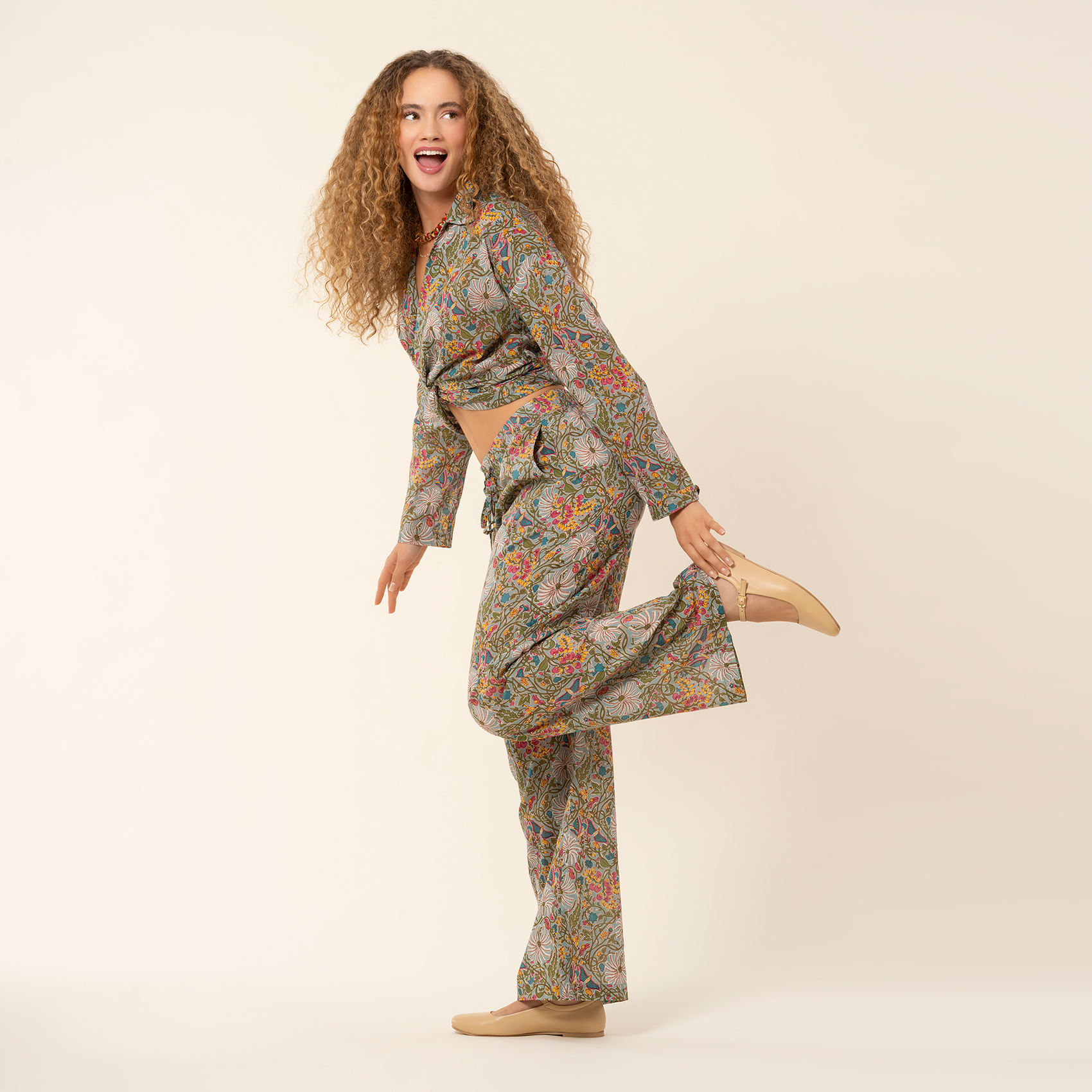 Gaya pantolon, yeşil zemin üzerinde filizlenen çiçekler ve canlı kırmızı detaylarla doğanın büyüsünü şehre taşıyor. El baskısının otantik izleri her motifte kendini hissettirirken, %100 pamuk kumaşın yumuşaklığı bedene gün boyu hafiflik ve özgürlük armağan ediyor. Rahat kesimi ve akışkan paça formu, yürüyüşünüze şiirsel bir hareket katıyor. İlhamını doğadan alan bu desenler, sıradan anları bile daha özel hissettiren bir ruh uyandırıyor. Gaya pantolon, gardırobunuzda özgürlüğü ve zarafeti aynı anda taşıyan eşsiz bir parça olacak.