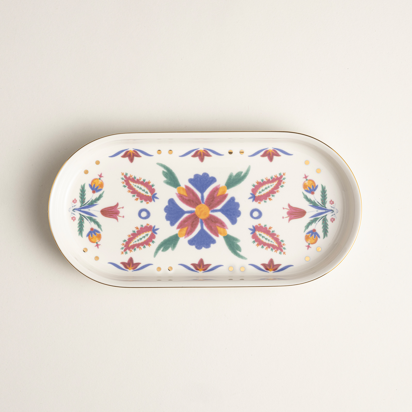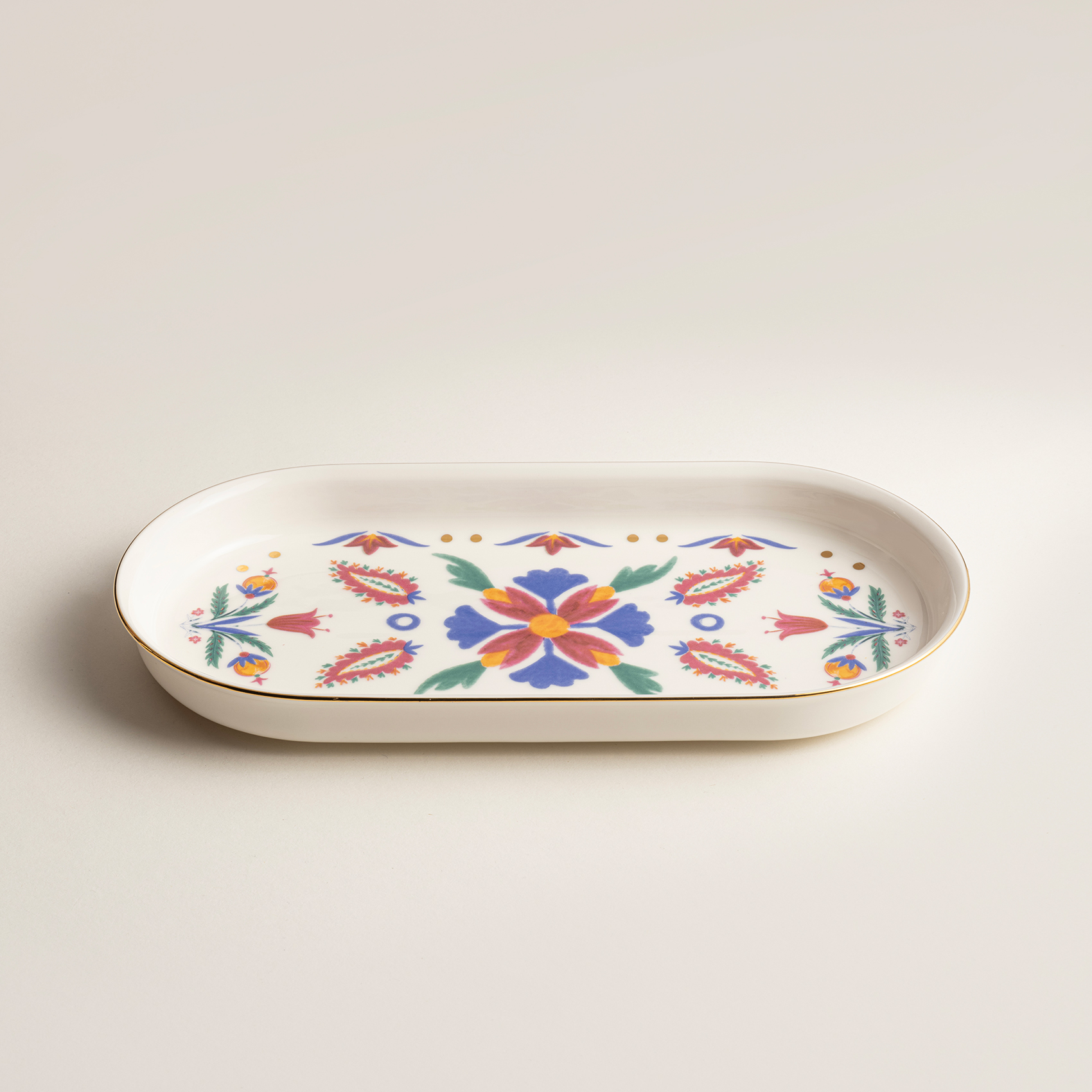 Maximalist koleksiyonunun illüstratif desenlerini zarif altın detaylarıyla buluşturan Gediz kayık tabak, masalarınıza sofistike bir hava katacak. Paylaşımlı lezzetlerin servisi için mükemmel olan bu kullanışlı parça, etkileyici desenleri ve altın detaylarıyla estetik dozu yüksek bir dekorasyon öğesine dönüşüyor. Kaliteli porselenden üretilen bu kayık tabak, Türkiye de titizlikle hazırlanmış olup pürüzsüz yüzeyiyle dikkat çekiyor. Hem günlük sofralarınıza hem de özel davetlerinize şıklık getirecek olan bu zarif parça, estetik ve fonksiyonelliği bir arada sunuyor.