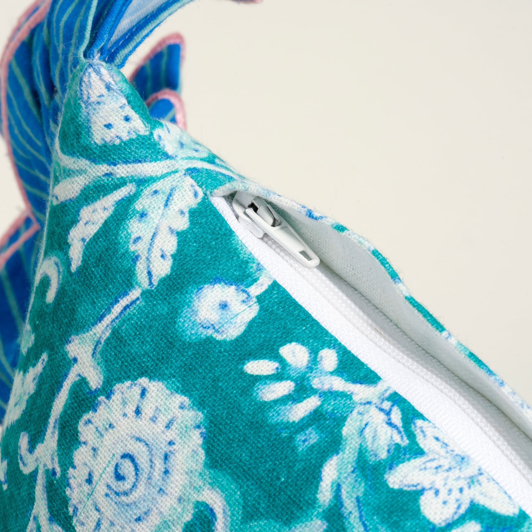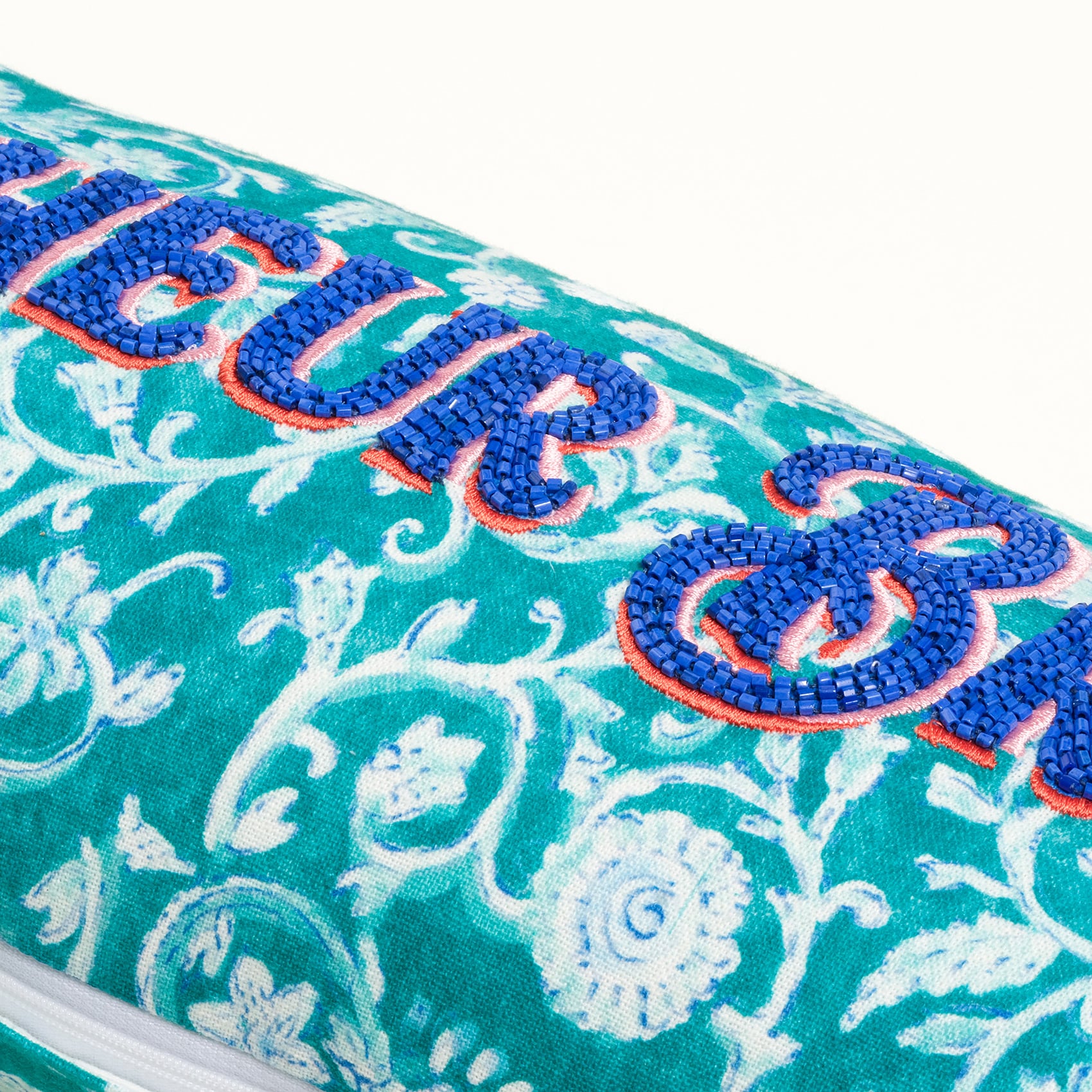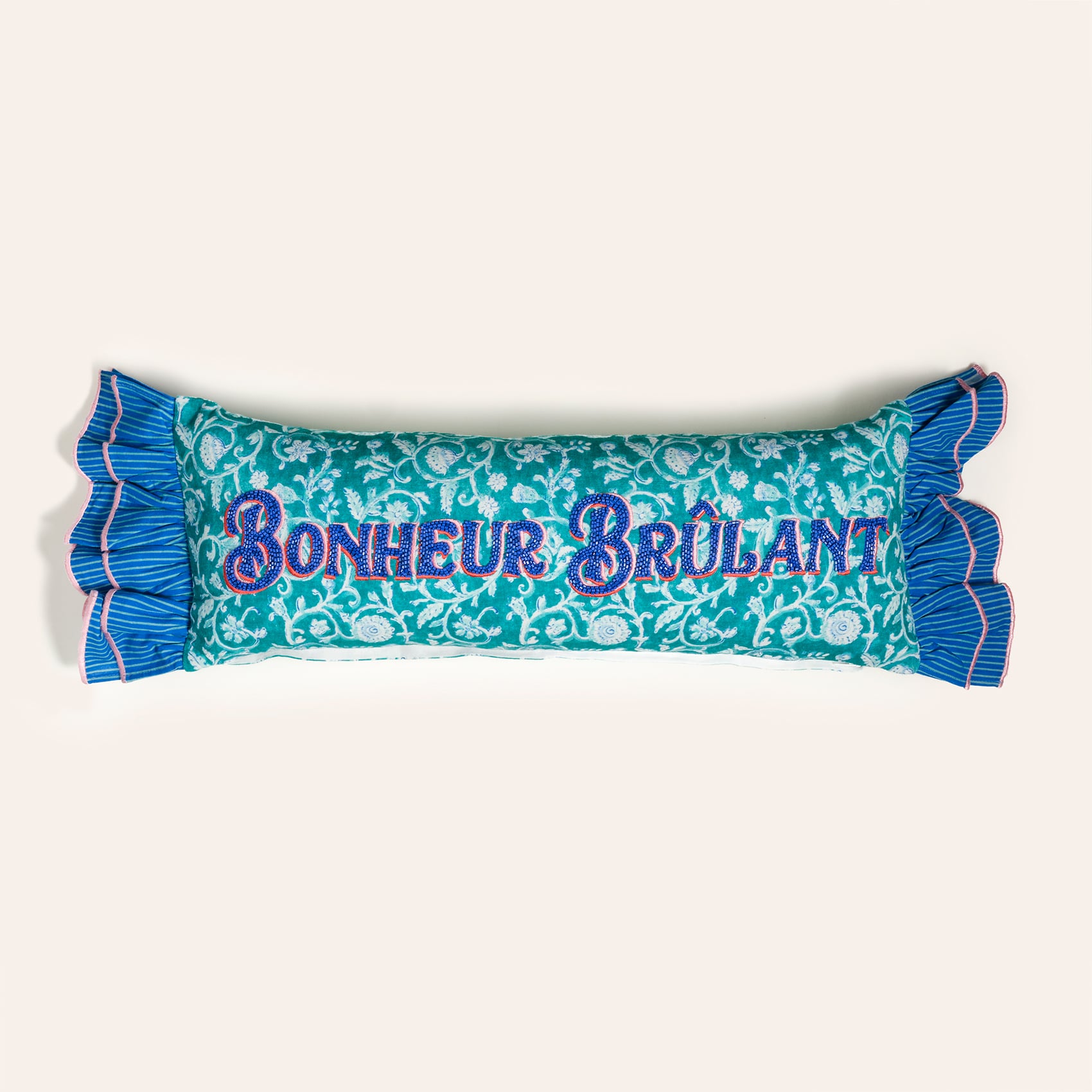 Zsa Zsa Zsu tasarımcılarının hayal dünyasında doğdu, Hindistan’da yaşayan artizanların ellerinde hayat buldu. “Bonheur Brûlant” nakışıyla kalbinden geçen her şeyi açıkça söyleyen bu kırlent, kendine has bir karaktere sahip: neşeli, gösterişli ve tam bir duygusal stilist. 20x55 cm ölçüsündeki bu göz alıcı tasarım, stilize mavi fırfırları, çiçek desenleri ve çarpıcı yeşil tonlarıyla evde baş köşeye kurulmak için sabırsızlanıyor. Dış yüzeyi %100 pamuk, iç dolgusu yumuşacık ve konforlu. Yavaş üretimin değerini taşıyan bu tatlı diva, Heritage koleksiyonunun kültürel çeşitliliğe açık ve duygularla bezeli dünyasından ilham alıyor.
