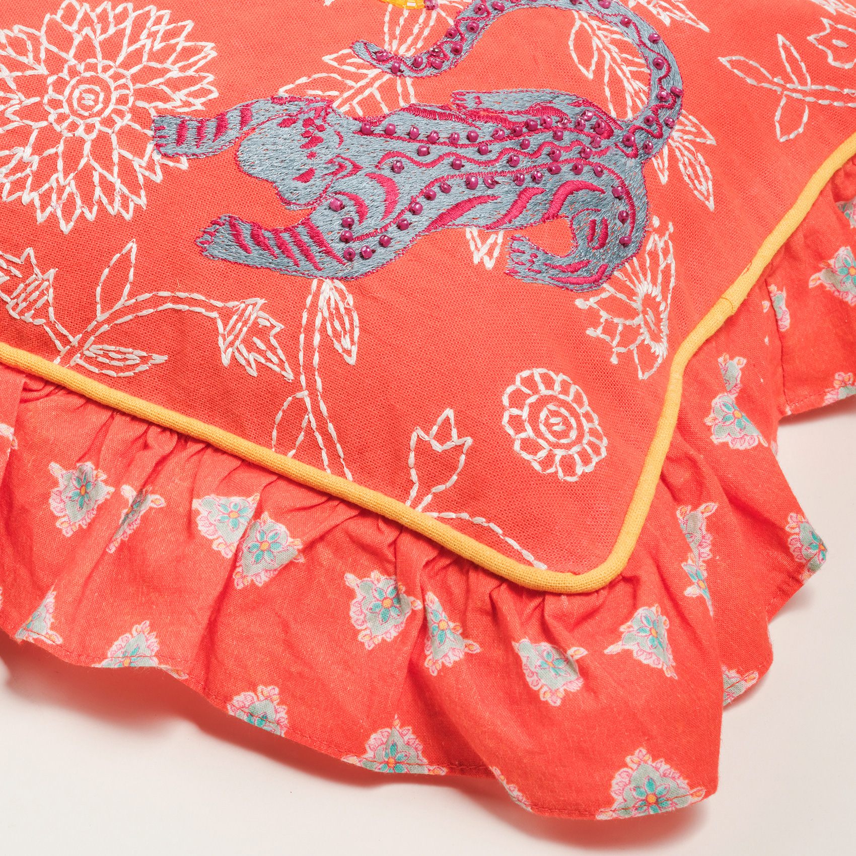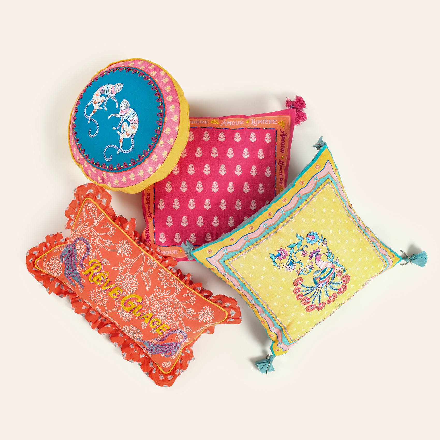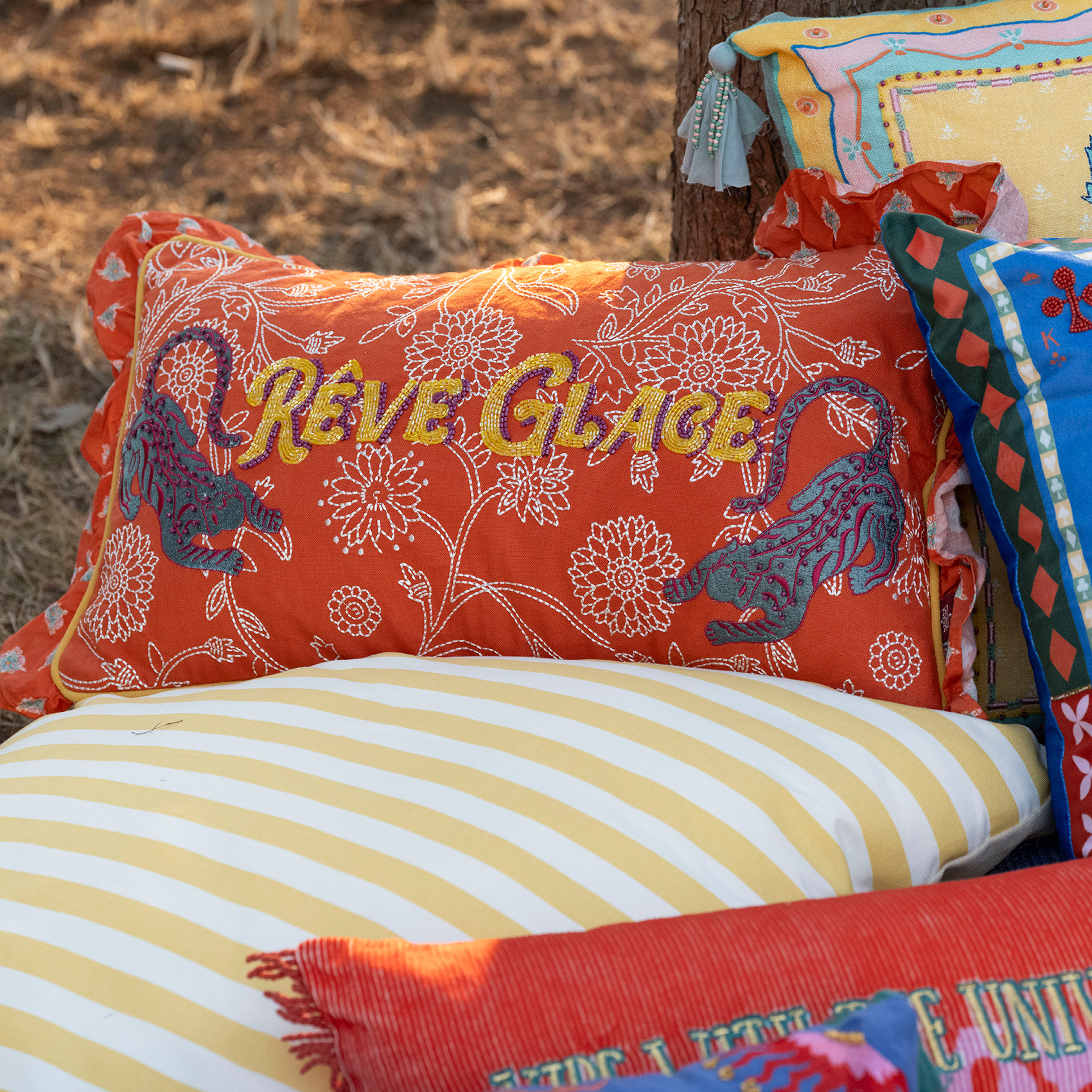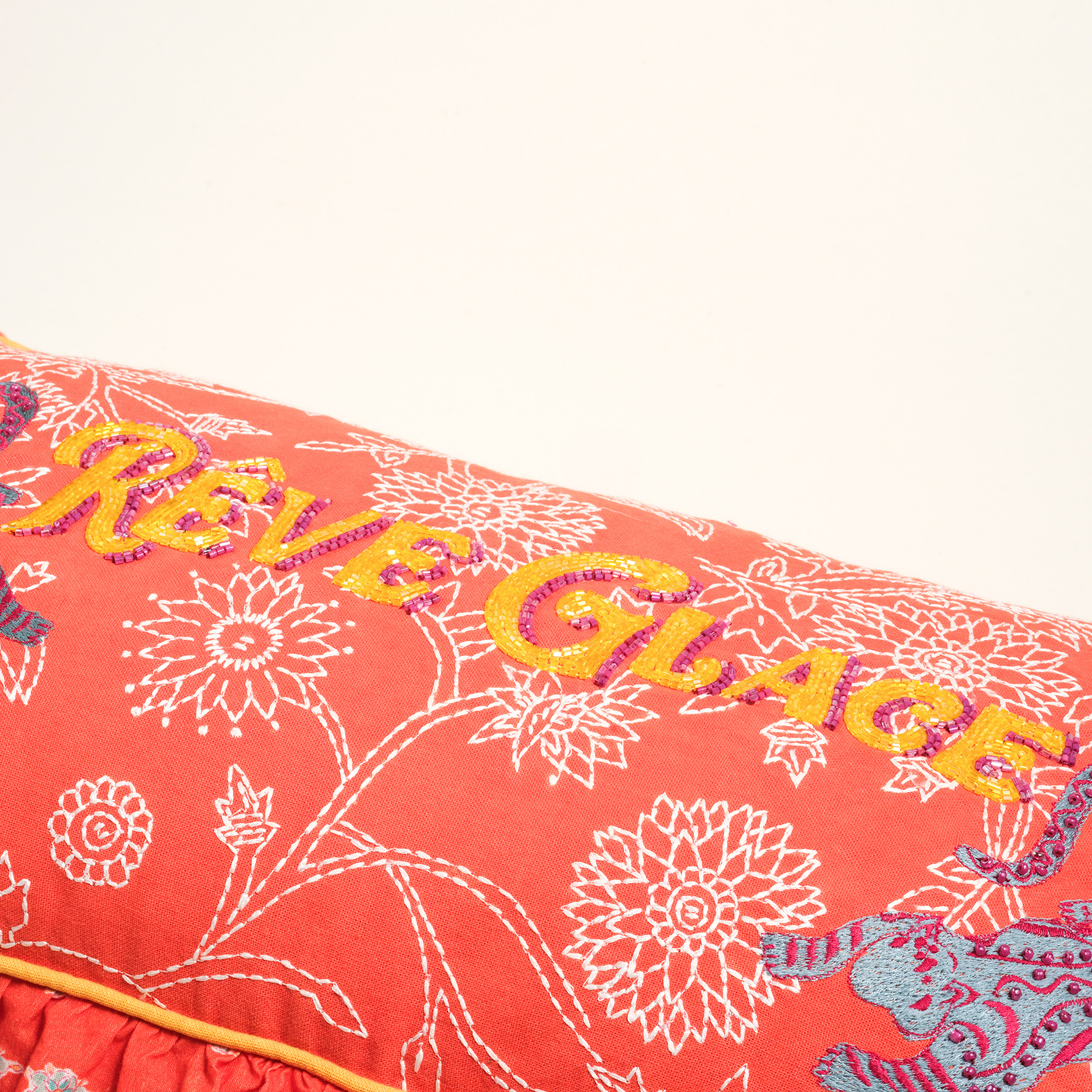 Zsa Zsa Zsu tasarım ekibinin imzasını taşıyan desenlerle renklenen bu tasarım, Hindistan’da yaşayan artizanlar tarafından üretildi. Üzerindeki nakışıyla göz kırpan, fırfırlarıyla enerjisini yükselten bu turuncu kırlent, girdiği her yere şenlik havası katıyor. Çiçekli yüzeyi %100 pamuk kumaştan üretildi. İç dolgusu yumuşacık yapısıyla konforu tamamlıyor. Yavaş üretimin izlerini taşıyan bu eğlenceli parça, Heritage koleksiyonunun kültürel mirasını bugünün dilinde yeniden yorumluyor.