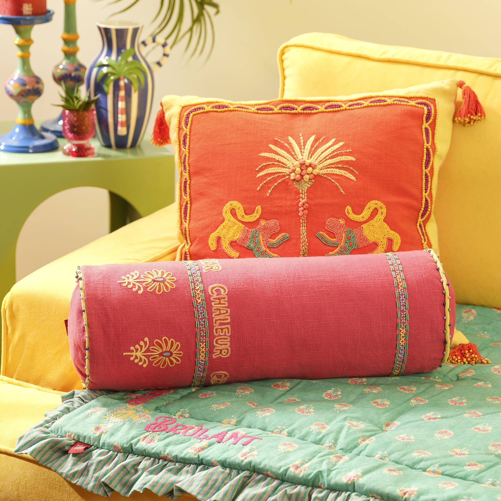 Heritage koleksiyonunun zengin stilinden ilham alınarak tasarlanan Ghuni kırlent, kültürel mirasın enerjisini modern bir yorumla buluşturuyor. %100 pamuk yüzey doğal bir sıcaklık ve yumuşak bir tutuş sunarken, fuşyanın güçlü tonu mekâna anında canlılık kazandırıyor. İnce nakış detayları Hindistanlı artizanların özenli emeğini görünür kılıyor. Uzun formu kanepeye, koltuğa ya da yatak kenarına yerleştirildiğinde mekânın akışını güzelleştiriyor. Heritage’ın otantik ruhu kırlentin dokusunda hafifçe parlıyor; bulunduğu alanı renkle, kültürel zarafetle ve sıcak bir atmosferle buluşturuyor. Hindistan’da usta artizanlar tarafından üretilmiştir; kuru temizleme yapılmalıdır.