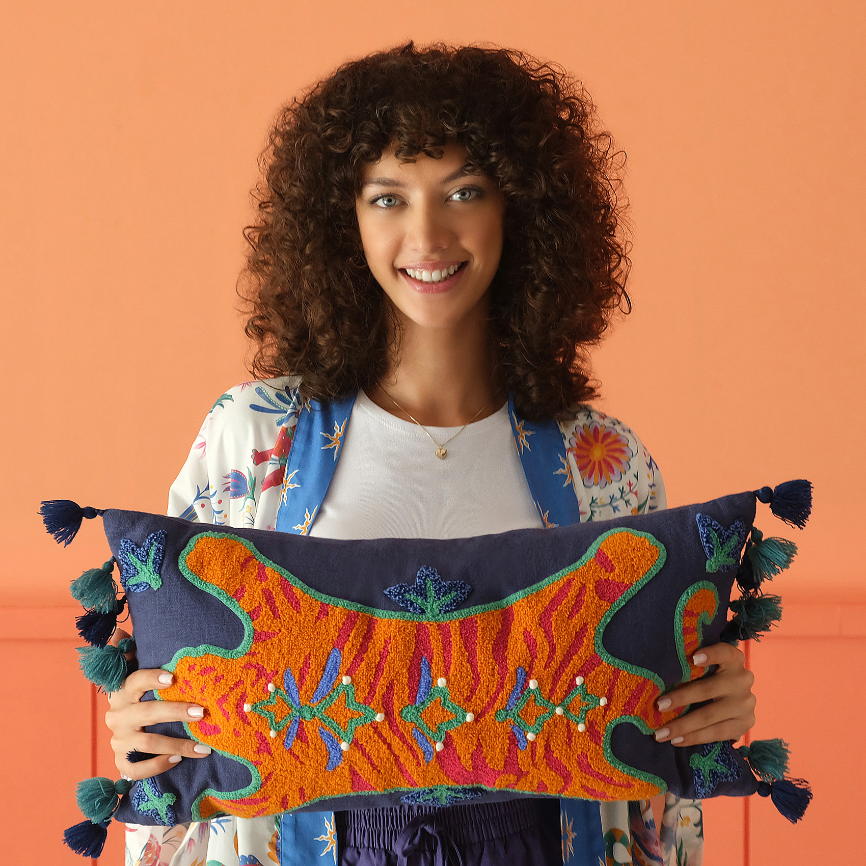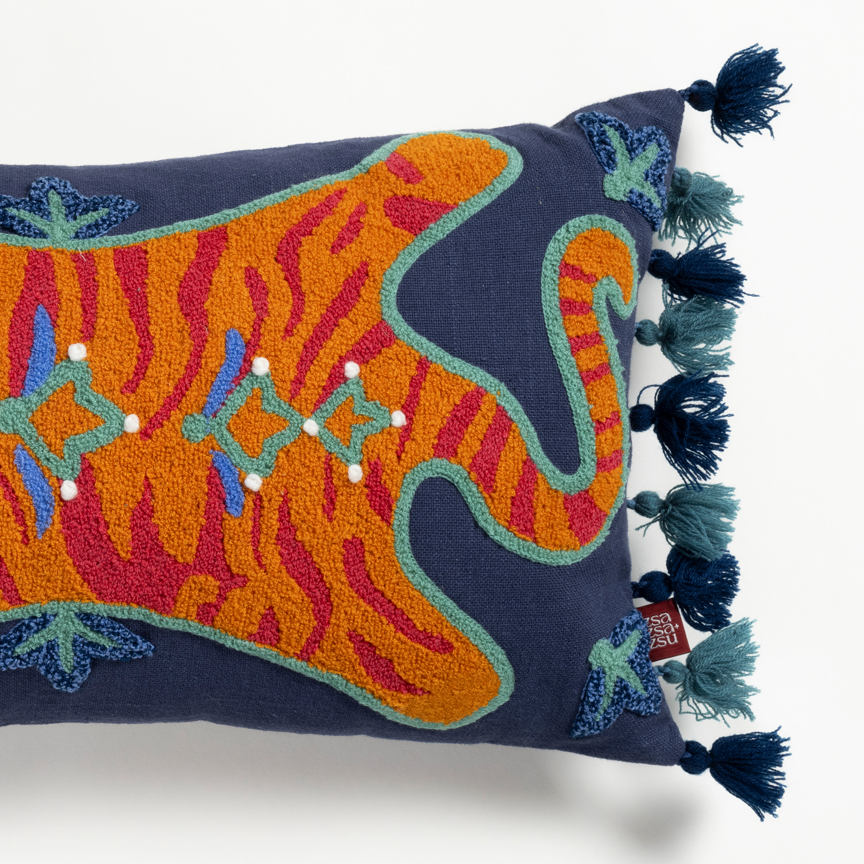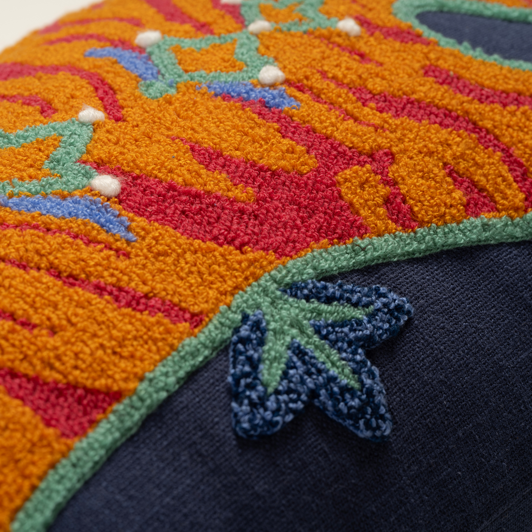 Ghuni kırlentin çarpıcı desenleri %100 dokuma pamuk tabanın üzerine renkli iplikler kullanılarak makinede işleniyor. Farklı nakış teknikleriyle hayat bulan desenler, ilhamını Maximalist temasının egzotik coğrafyalara referans veren cesur dünyasından alıyor. Kırlentin güçlü stilini tamamlayan püskülleri Hindistanlı zanaatkârlar tarafından el emeğiyle hazırlandıktan sonra kırlente dikiliyor.