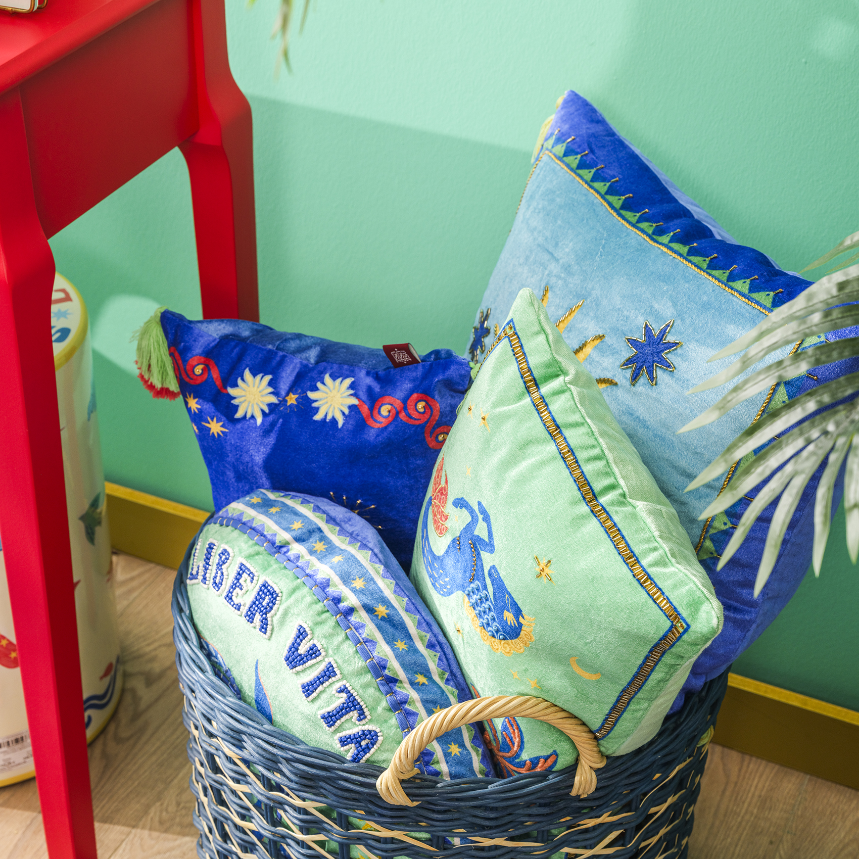 Blue koleksiyonu, Akdeniz’in güneşli göğünü ve mitolojik hayal gücünü buluşturan büyülü bir evren yaratıyor; Ghuni kırlent de bu evrende ışığını kadifenin yumuşak dokusundan alıyor. %55 viskon ve %45 pamuk kadife karışımı yüzey tasarıma hem parlak hem de derin bir ifade katıyor. Nakışların her biri Hindistanlı artizanların sabırlı emeğini taşıyor; bu emek kırlenti dekoratif bir objeden çok sıcak, karakterli bir hikâyeye dönüştürüyor. Ghuni bulunduğu ortamda bir ışık kaynağı gibi davranıyor. Kanepeye bıraktığında odanın enerjisi değişiyor; yatak odasında renkler canlanıyor; açık havada ise Akdeniz’e özgü taze bir esinti duyguya dönüşüyor. Hindistan’da usta artizanlar tarafından üretilmiştir; yalnızca kuru temizleme yapılmalıdır.