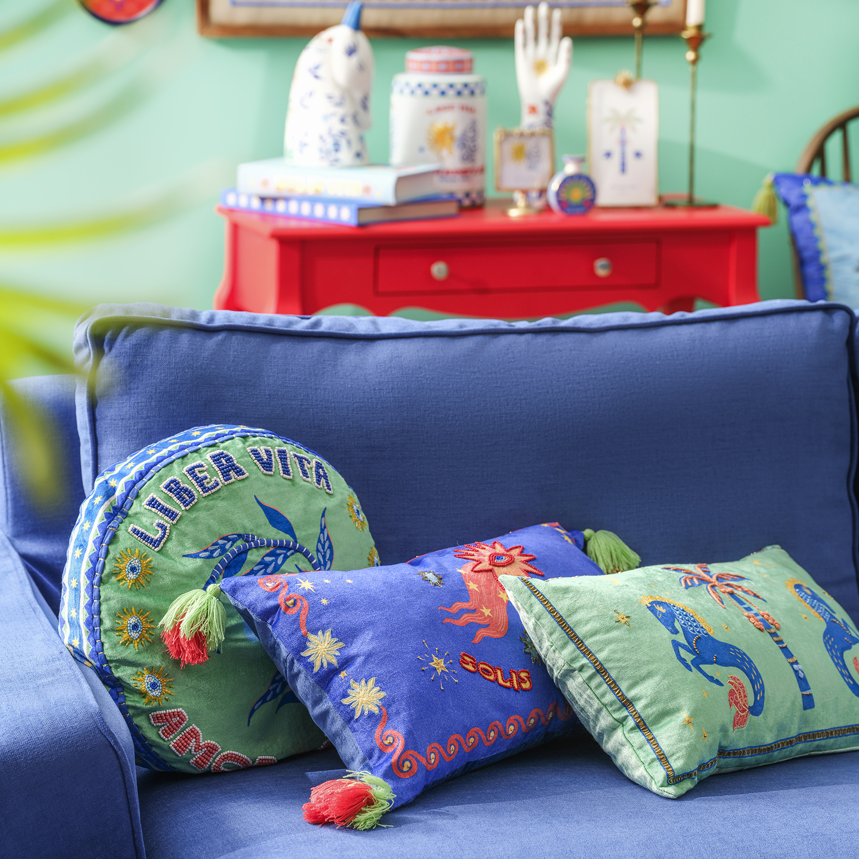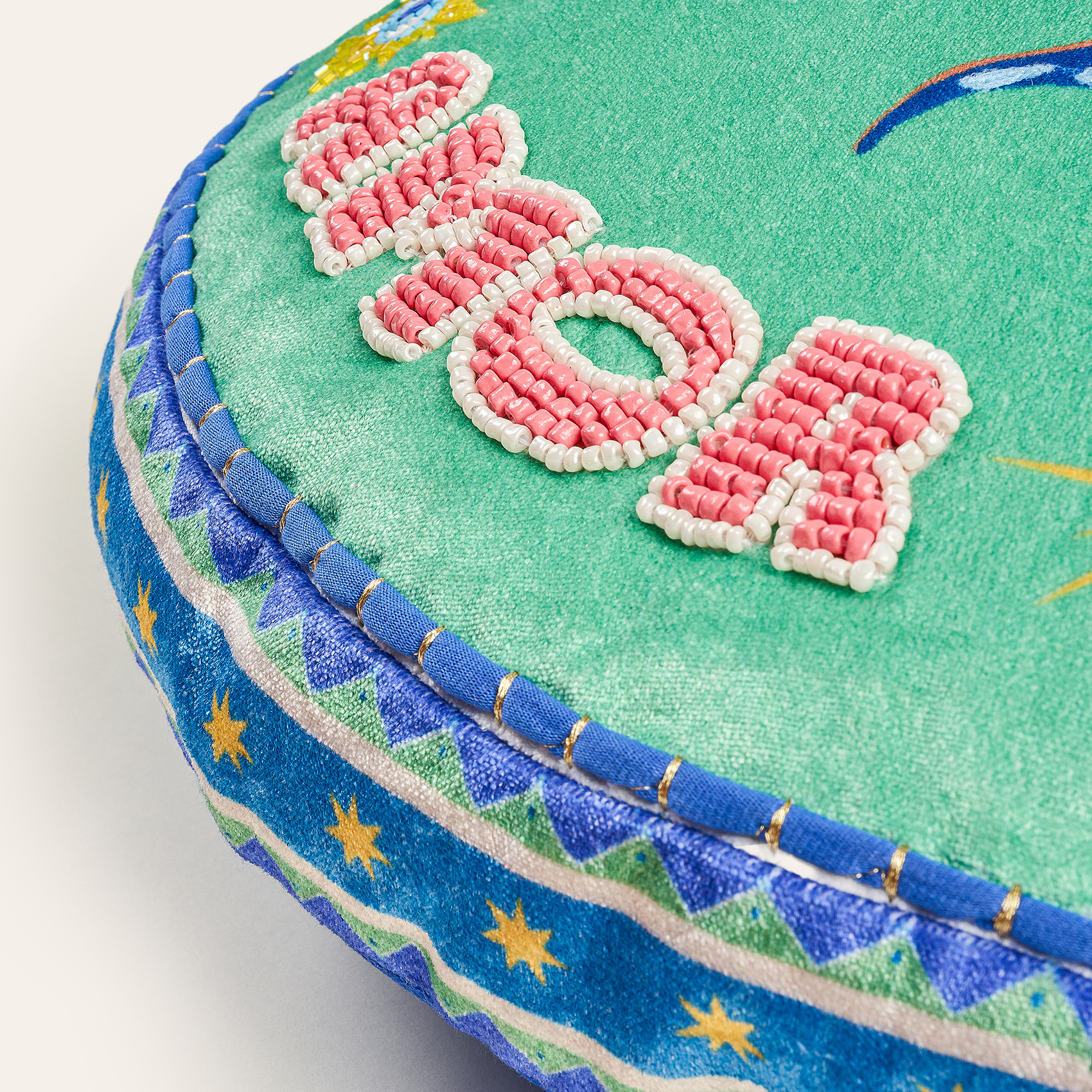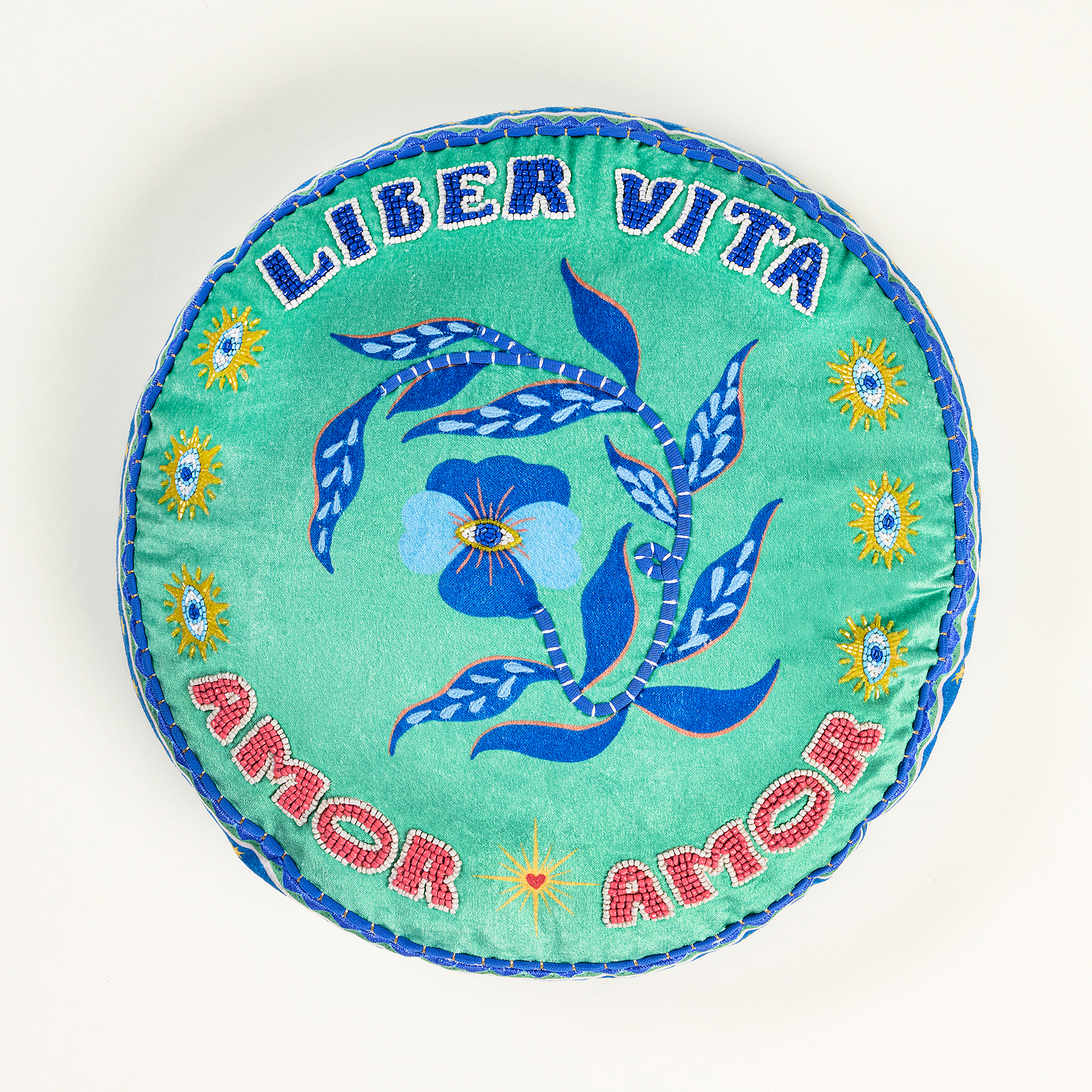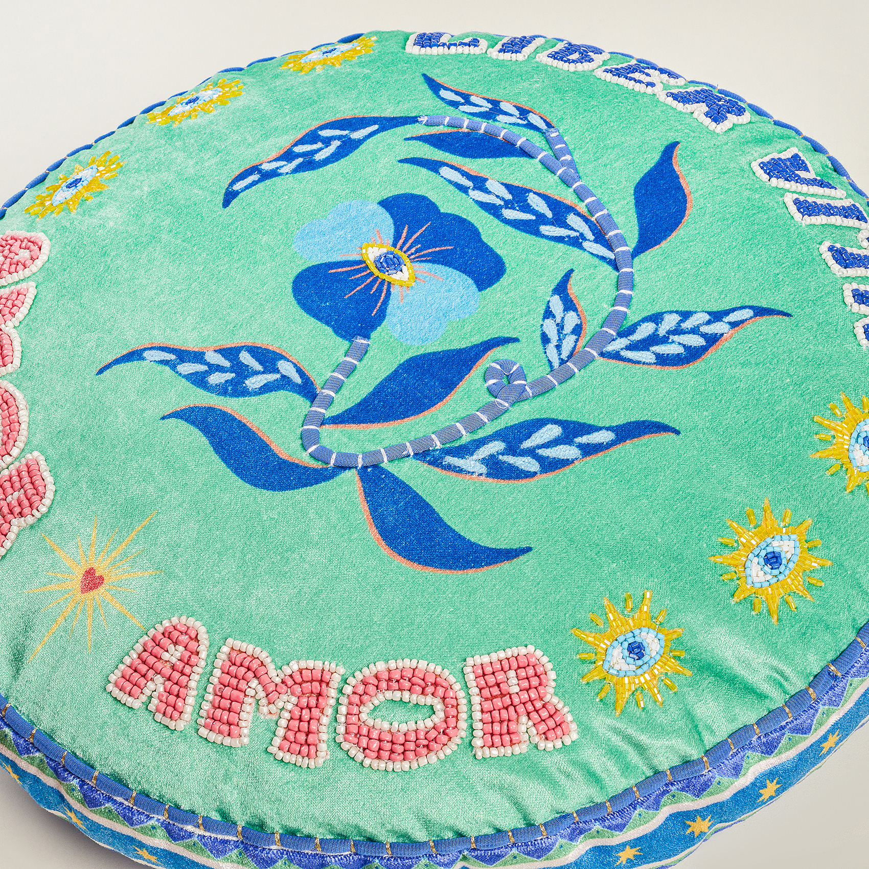 Blue koleksiyonunun özgür ve güneşli dünyası, Ghuni yuvarlak kırlentin yumuşak kadife yüzeyinde canlı bir enerjiye dönüşüyor. %55 viskon ve %45 pamuk kadife karışımı doku tasarıma parlak bir derinlik katarken, elde tutulduğunda huzur veren bir yumuşaklık sunuyor. Yuvarlak formun akışkan çizgisi mekâna hem zarif hem de neşeli bir denge getiriyor. Nakışların her biri Hindistanlı artizanların incelikli emeğini taşıyor; bu emek kırlenti dekoratif bir parçadan çok yaşam alanına sıcak, karakterli bir dokunuş olarak konumlandırıyor. Kanepeye, koltuğa ya da bir köşe sehpasının üzerine bıraktığında Blue evreninin ferahlığı yayılıyor; renkler canlanıyor ve ortama pozitif bir ışık hâli eşlik ediyor. Hindistan’da usta artizanlar tarafından üretilmiştir; kuru temizleme yapılmalıdır.