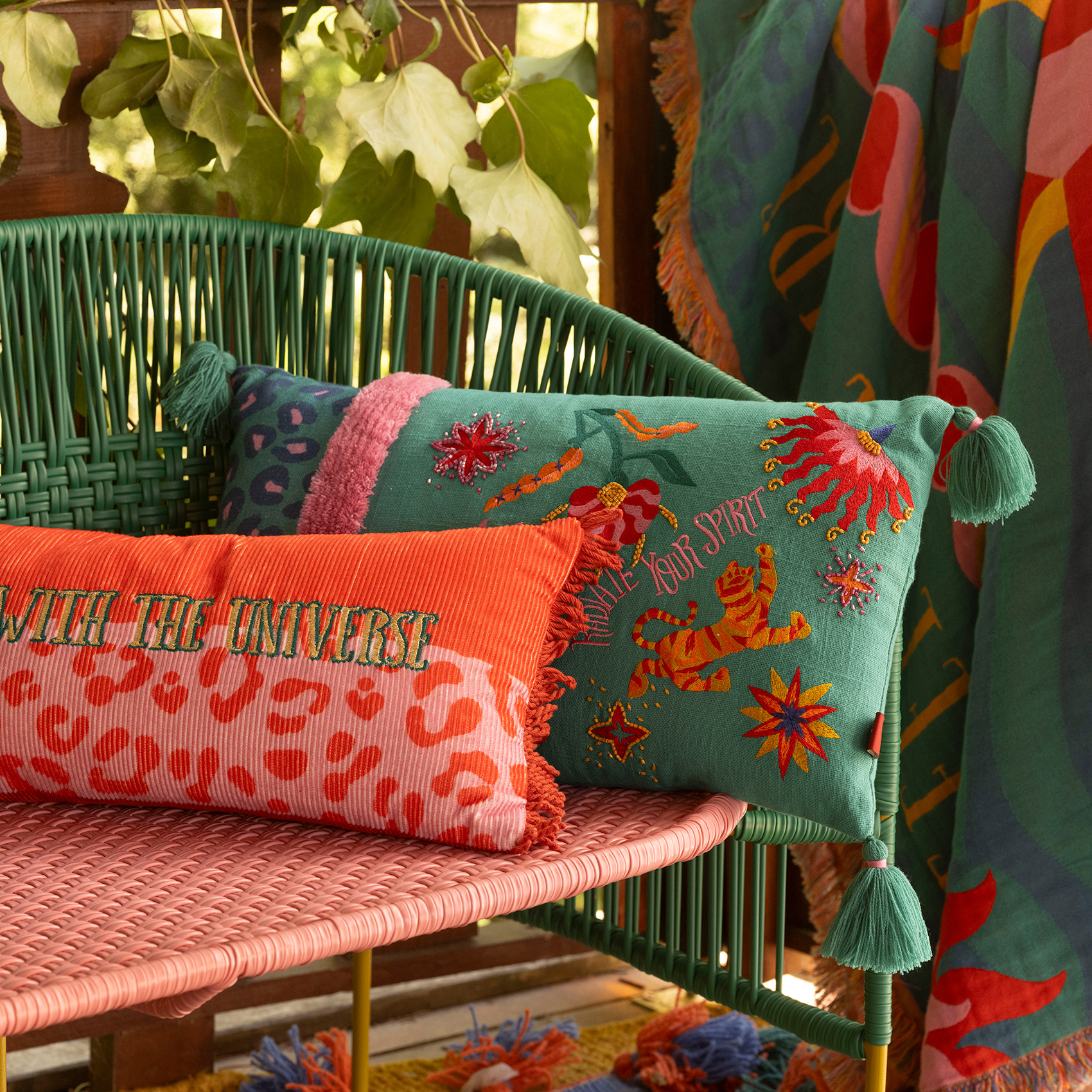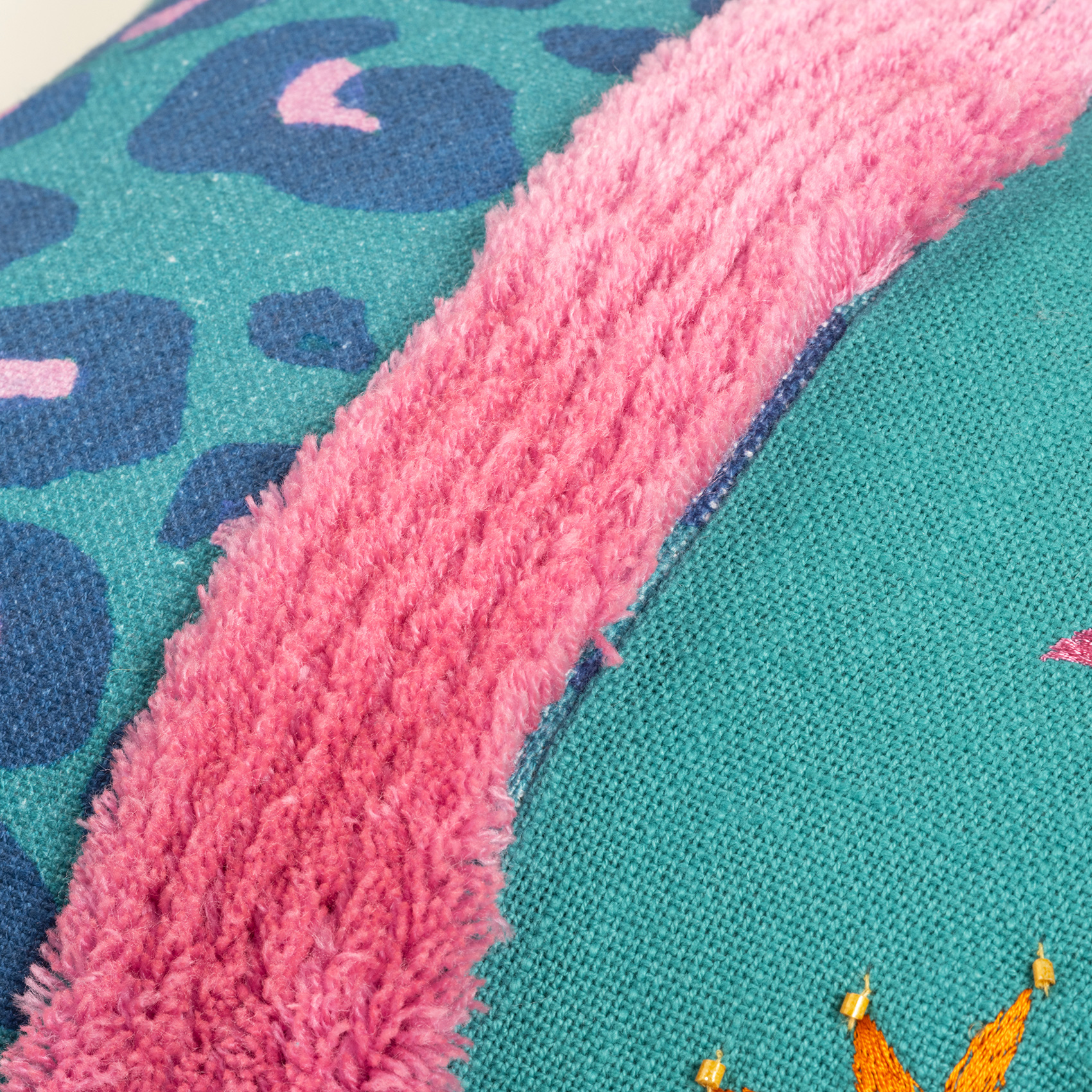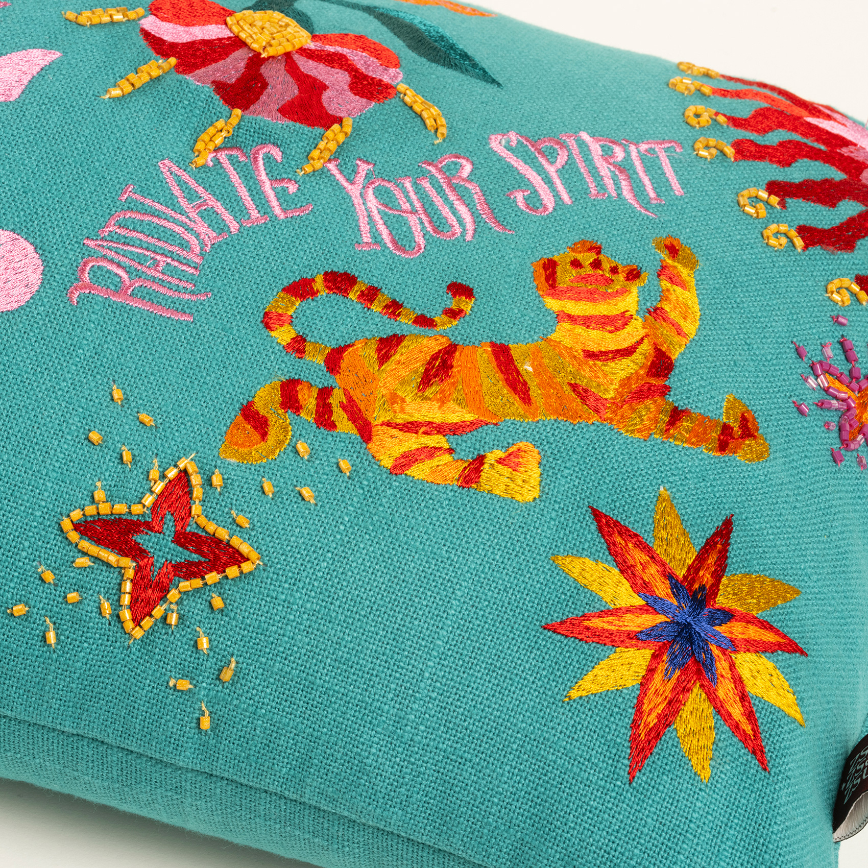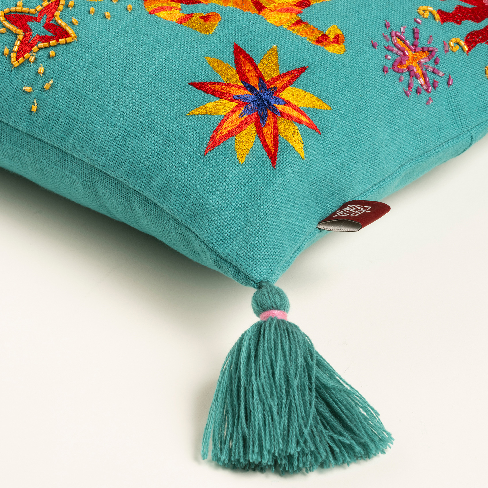 Maximalist koleksiyonun düş gücüyle bezeli evreninden çıkan Ghuni kırlent, adeta bir fabl anlatıyor. Üzerindeki hayali canlılar, stilize çiçekler ve coşkulu detaylar, sıradanlıktan uzak oyunbaz bir dünya kuruyor. El nakışı desenler boncuk, püskül ve doku kontrastlarıyla canlanıyor. Dış yüzeyi %100 pamuk, iç dolgusu ise yumuşak ve destekleyici. 30x55 cm ölçüsündeki bu özgün tasarım, Hindistan’daki usta ellerin emeğiyle üretildi. Ghuni, dekorasyona masalsı bir ruh katan modern bir hayal parçası.