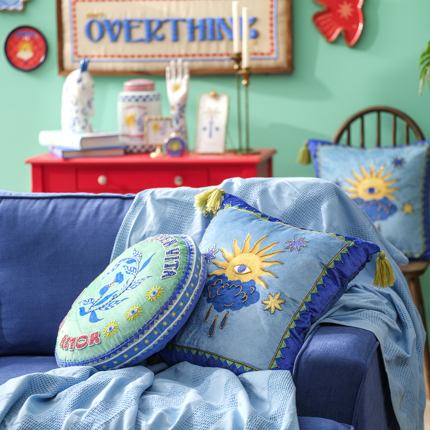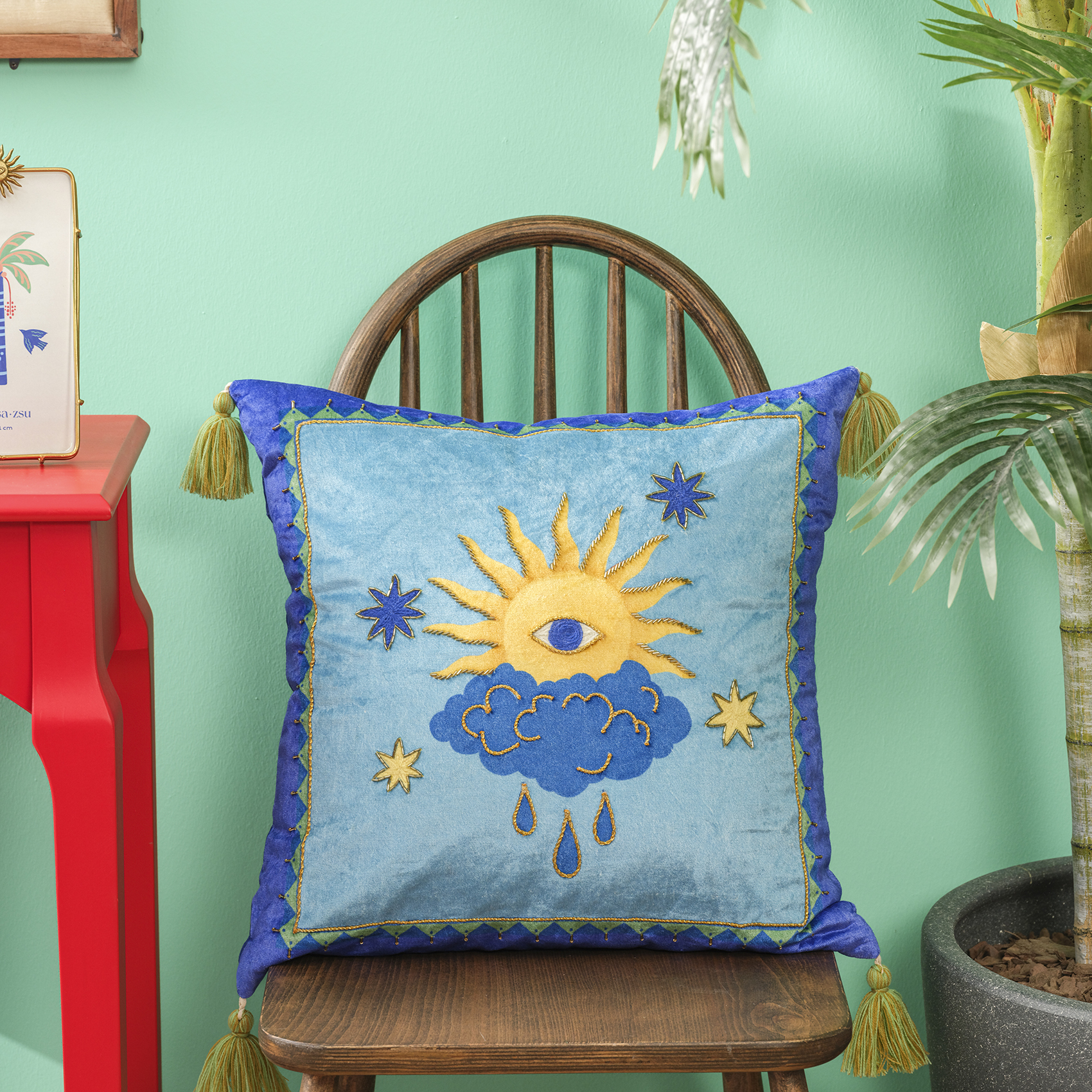 Blue koleksiyonunun güneşli dünyası bu kez gökyüzünün sembolleriyle buluşuyor; Ghuni kırlent, kadifenin yumuşak dokusuna işlenen mitolojik bir sahne gibi parlıyor. Ortadaki güneş motifi, bulutların arasından yükselen canlı bir enerji taşıyor; yıldızlar ve altın detaylar tasarıma kozmik bir hareket katıyor. %55 viskon ve %45 pamuk kadife karışımı yüzey bu parlak ifadeyi derin bir etkiyle tamamlıyor. Her bir nakış, Hindistanlı artizanların elinden çıkan ince işçiliğin izini taşıyor. Köşelerdeki püsküller ise kırlente hafif ve oyunbaz bir dokunuş ekleyerek Blue evreninin neşeli ruhunu ortaya çıkarıyor. Kanepeye, terasa ya da yatak odasına bıraktığında etrafa Akdeniz’e özgü bir tazelik, renk ve hayal gücü yayılıyor. Hindistan’da usta artizanlar tarafından üretildi; yalnızca kuru temizleme yapılmalıdır.