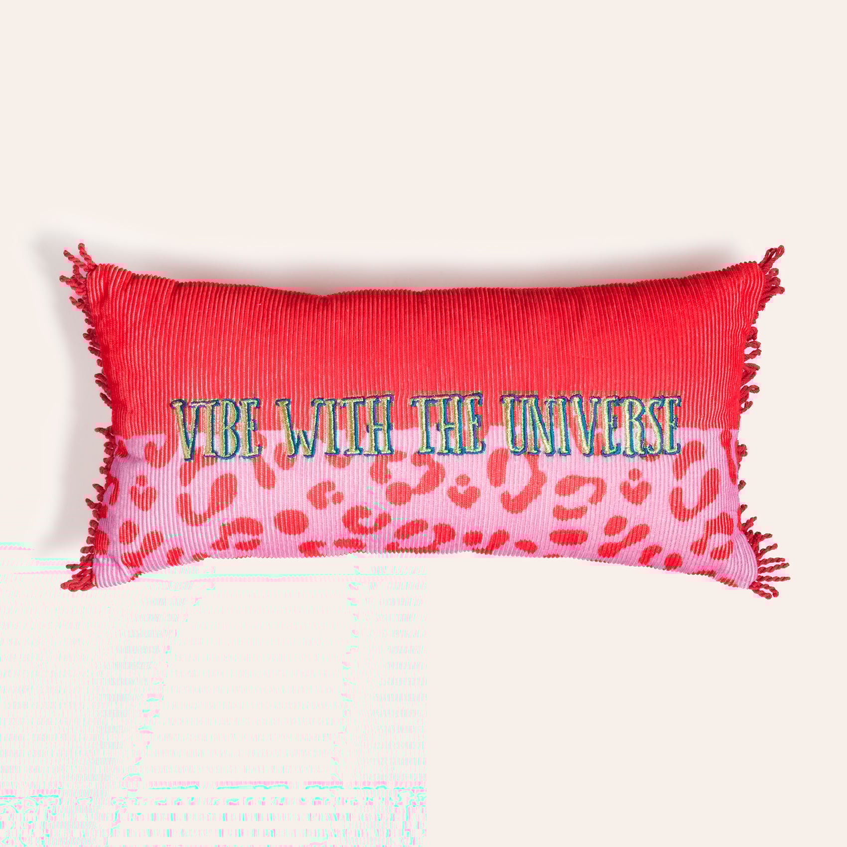 Maximalist koleksiyonun yüksek frekanslı evreninden çıkan bu Ghuni kırlent, enerjiyi yükseltmek için tasarlandı. Motive edici mesajı el nakışıyla yüzeye işlenmiş; saçaklar, renk blokları ve zengin dokularla birleşerek ortama canlılık katıyor. %100 pamuk kumaşı doğal bir his sunarken, yumuşak dolgusu rahat bir destek sağlar. 25x50 cm ölçüsündeki bu parça, Hindistan’daki zanaatkârların özenli emeğiyle üretildi.