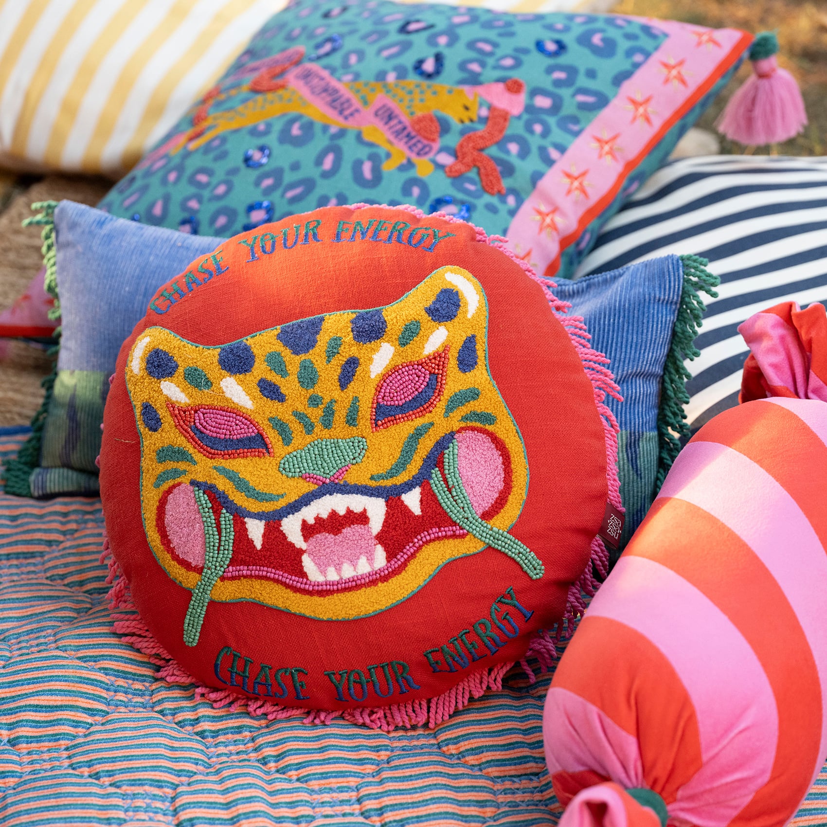 Maximalist koleksiyonun yüksek tempolu sahnesinde Ghuni, adeta kendi efsanesini yazıyor. Zsa Zsa Zsu tasarımcılarının çizdiği vahşi motif ve cesur çağrısıyla bulunduğu her ortama ritim kazandırıyor. Usta zanaatkârların elinden çıkan nakışlar, saçaklarla çevrili yuvarlak form üzerinde hareket kazanıyor; her detayıyla esprili ve oyunbaz bir atmosfer yaratıyor. %100 pamuk dış yüzeyi doğallık hissi sunarken, yumuşak dolgusu konforlu bir duruş sağlar. Hindistan’da özenle üretilen 40 cm’lik bu parça, bulunduğu mekâna enerjik bir soluk getiriyor.
