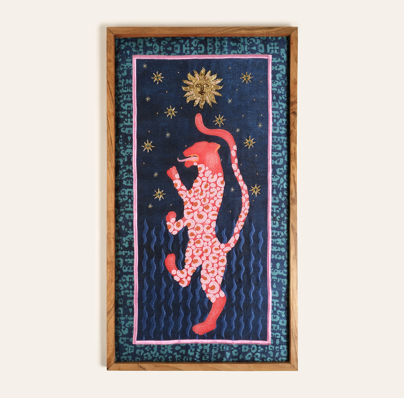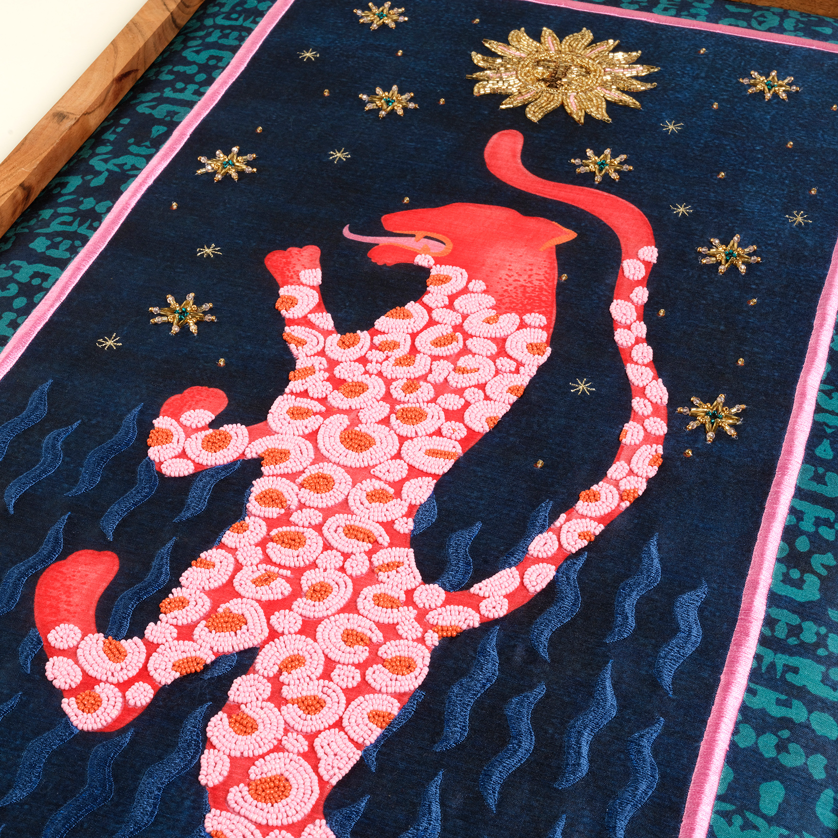 Usta artizanlar tarafından el işçiliğiyle üretilen Dadri El Yapımı Boncuklu Duvar Panosu, Maximalist koleksiyonunun özgür ruhundan ve hayal gücünü harekete geçiren dünyasından ilham alıyor. Parıldayan yıldızların altında dans eden sevimli leopar motifi, sanki bir masaldan fırlamış gibi. Koleksiyon değeri taşıyan bu özel parça, Hindistan’ın geleneksel el işçiliğini Zsa Zsa Zsu’nun modern tasarım vizyonuyla birleştiriyor. Çerçevesi doğal ahşaptan üretilmiştir.