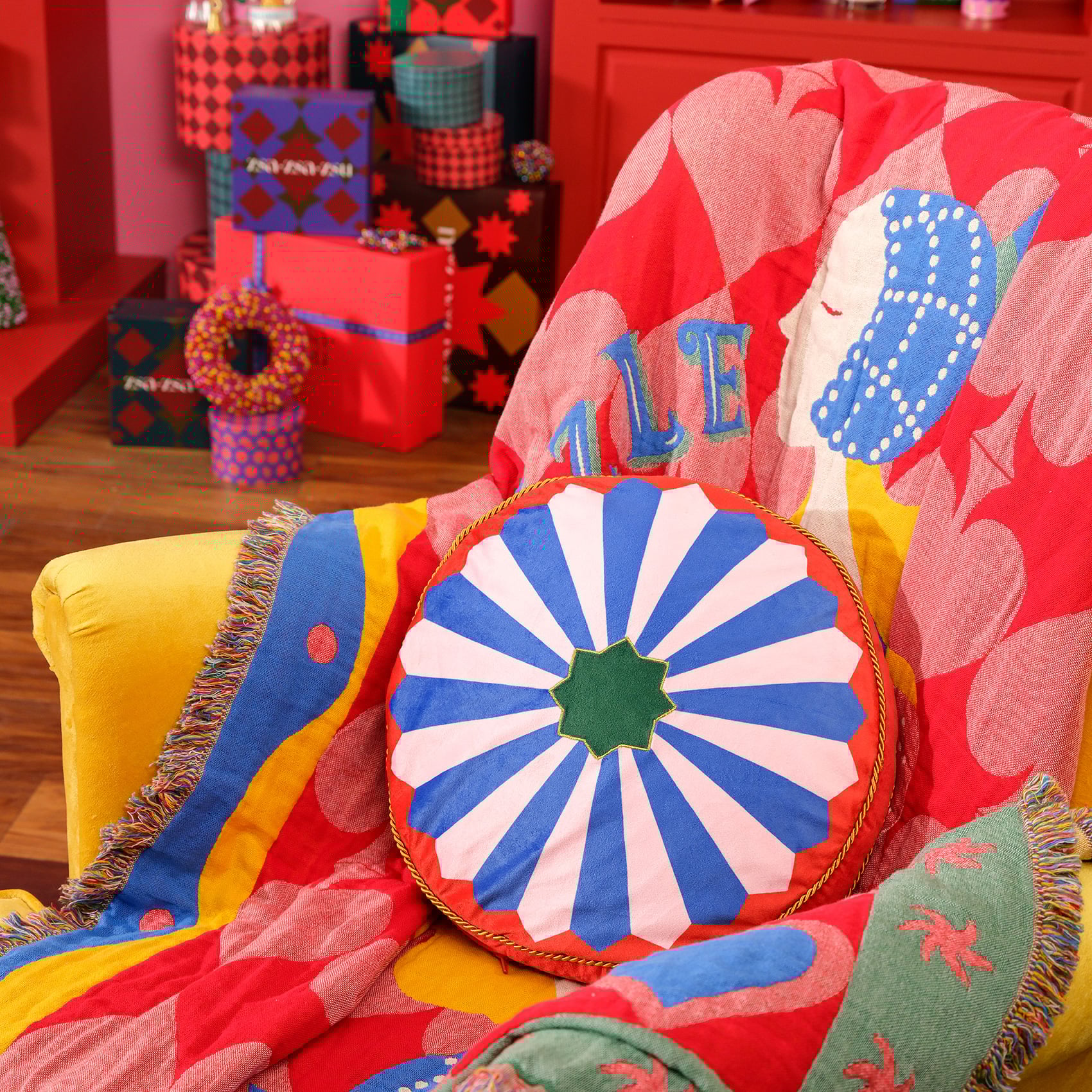 Hansi kırlent, Cheerland koleksiyonunun en neşeli üyelerinden biri. Yuvarlak formuyla sirk çadırlarının büyüsünü, çocukluk hayallerinin sınırsızlığını ve rengârenk bir hayal dünyasını bir araya getiriyor. Turuncu, pembe ve mavi renklerin çarpıcı uyumu, yıldız biçimli merkezde buluşarak etrafa saf bir coşku yayıyor. Hansi’ye her bakış bir renk selamı gibi; yaşadığınız yere oyunbazlık ve sıcaklık katıyor. Hindistan’da üretilen bu kırlent, kadife dokusu ve bulut gibi yumuşacık dolgusu ile adeta duygulara renk saçıyor.