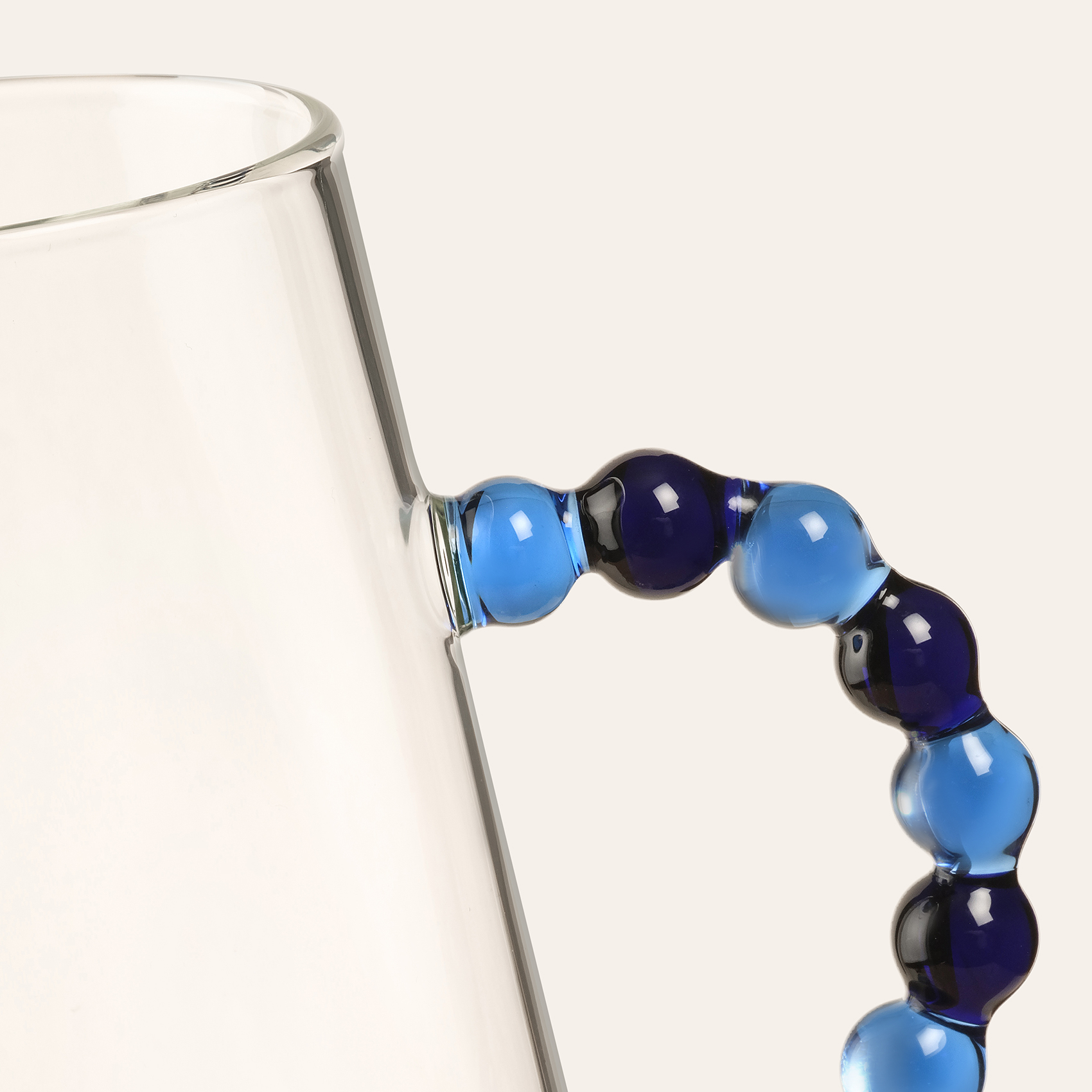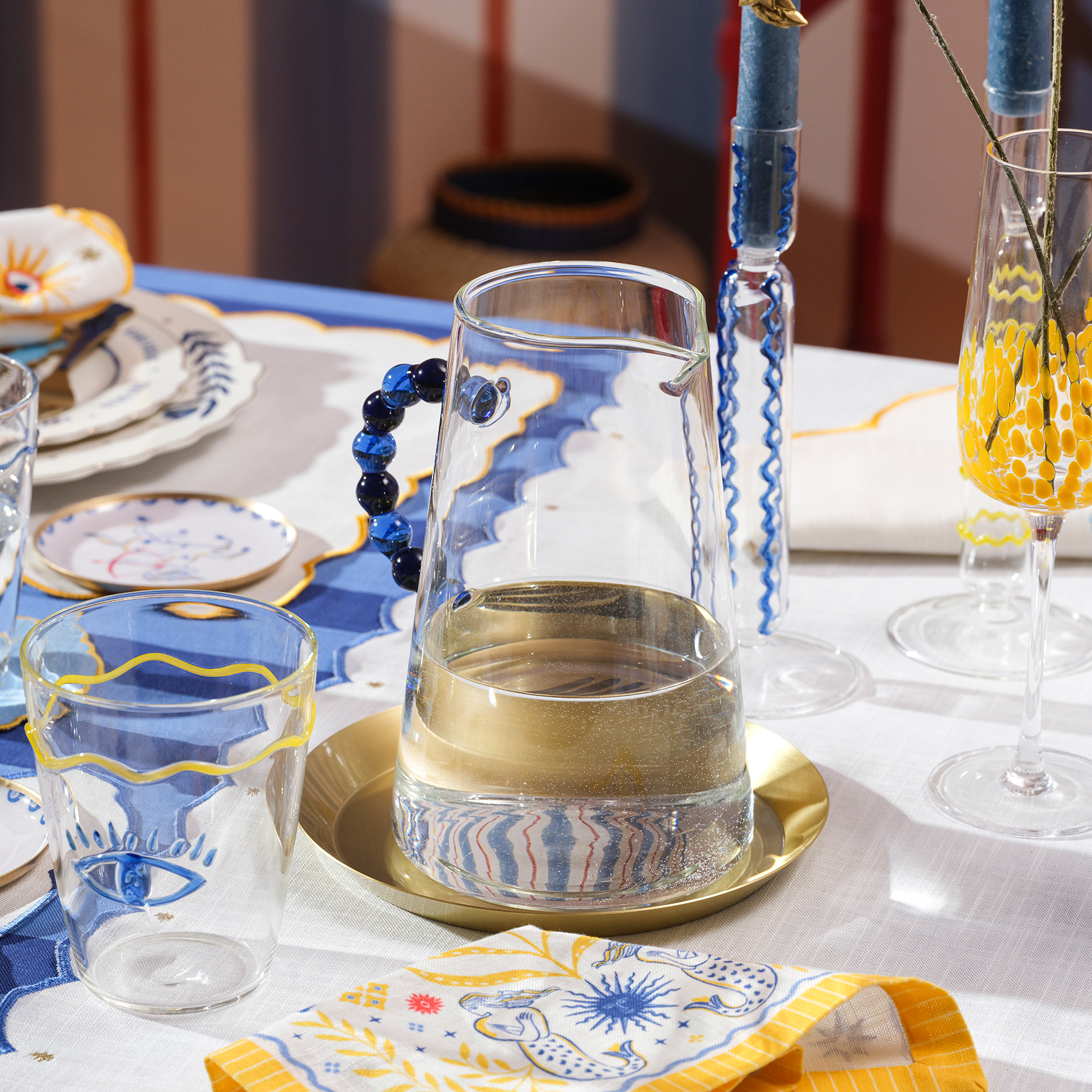 El işçiliğinin ışıltısı, Akdeniz’in neşesi ve camın büyüleyici zarafeti bir arada! Usta ellerde şekillenen Henan borosilikat cam sürahi, keskin hatları ve misket gibi ışıldayan boncuk detaylı kulpuyla karakterini cesurca sergiliyor. Minimalist gövdesi sofistike bir zarafet sunarken, renkli kulpu tasarıma neşeli bir oyunbazlık ve sanatsal bir dokunuş katıyor. Blue koleksiyonunun özgür enerjisini taşıyan bu sürahi, sofralarınıza Akdeniz’den esen ferah bir stil esintisi getiriyor!
