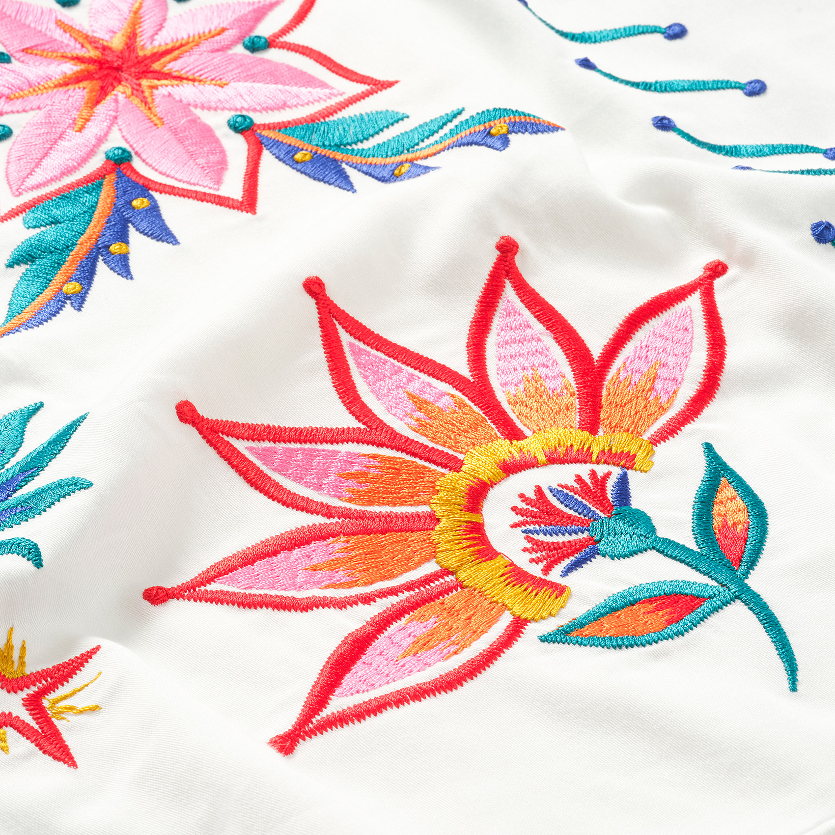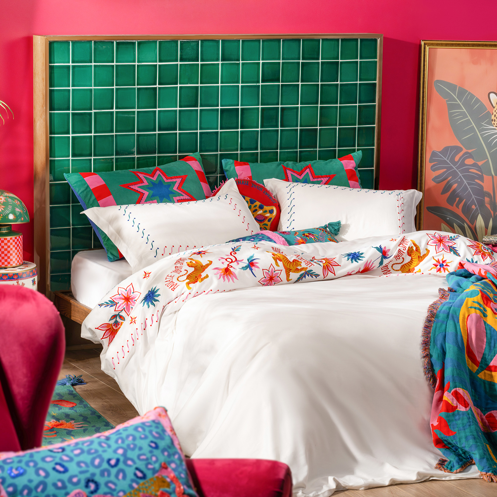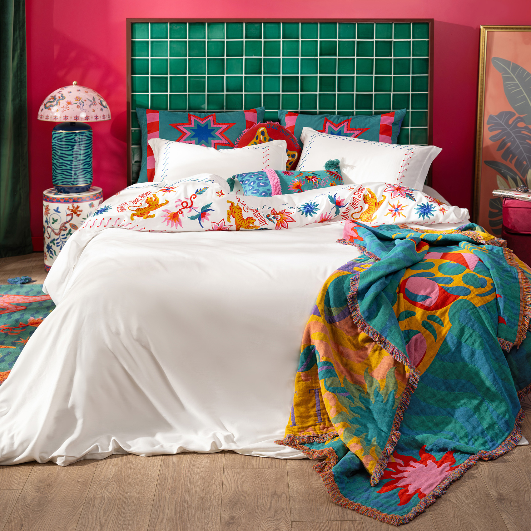 Kadmos nakışlı bambu pamuk nevresim takımı, ekru zemin üzerinde dans eden çiçekler, egzotik motifler ve hayali figürleriyle yatağınızı Maximalist bir masala dönüştürüyor. Zsa Zsa Zsu Tasarım Ekibi’nin imzasını taşıyan ilham dolu nakış bordürü yatak odanızın havasını anında değiştiriyor; %60 bambu %40 pamuktan oluşan nefes alan dokusu doğal bir yumuşaklık sunarken, 200 TC kalitesiyle hafif ve dayanıklı bir kullanım sağlıyor. Türkiye’de üretilen bu tasarım, göz alıcı detaylarıyla enerjinizi yükseltiyor ve odanızı özgür ruhlu bir oyun alanına çeviriyor. Takımın içinde 2 adet yastık kılıfı, çarşaf ve nevresim bulunuyor.