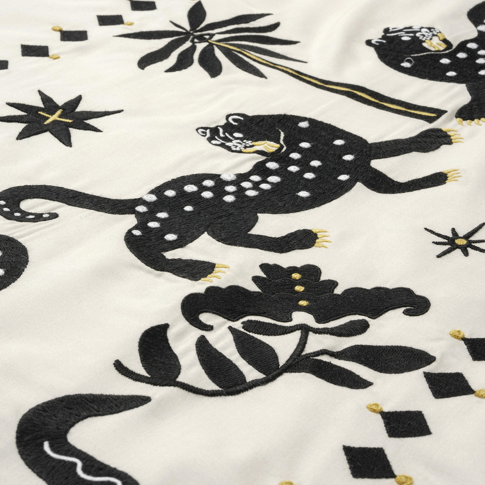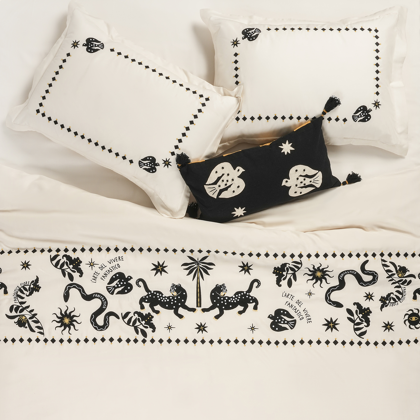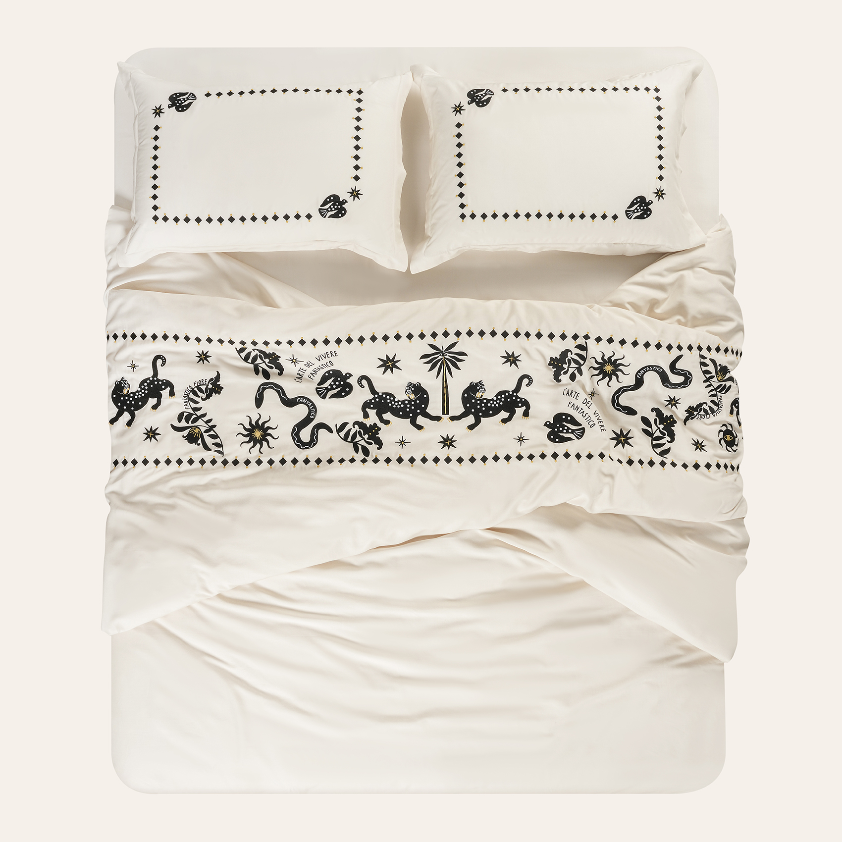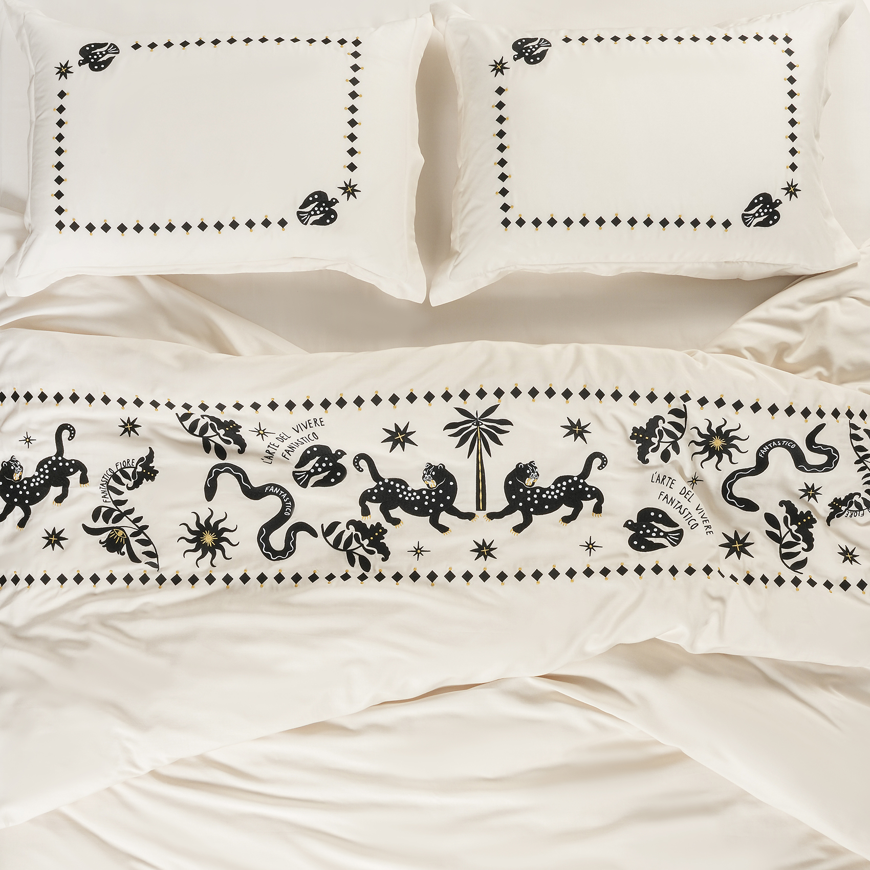 Kontrastın gücünden doğan iddialı bir etki. Bold koleksiyonunda yer alan Kadmos 144 TC %100 Tencel Nevresim Takımı, yatak odasında güçlü bir görsel atmosfer kuran çarpıcı bir tasarım. %100 Tencel dokusu yumuşak hissi ve nefes alabilen yapısıyla uyku konforunu desteklerken, nakış detayları tropik bir coğrafyada yaşayan hayali karakterlerden ilham alıyor. Türkiye’de tasarlanmış ve üretilmiştir.