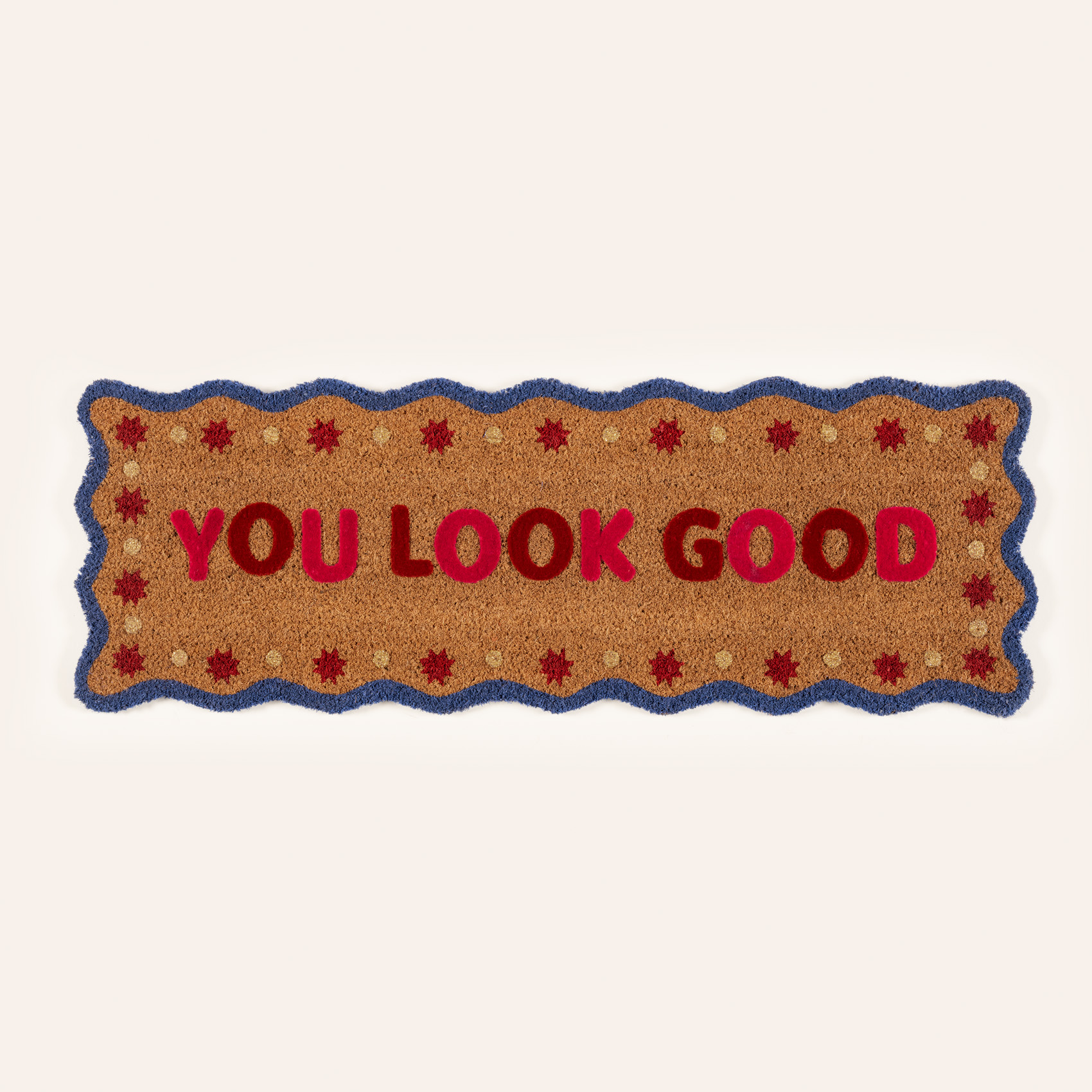Kendinize güvenin, çünkü iyi görünüyorsunuz! Evet, kapının eşiğinde durduğunuz anda sizi sıcak iltifat karşılıyor ve “You look good!” diyor! %100 Hindistan cevizi lifinden yapılmış bu harika paspas, yıldız desenleri ve capcanlı mavi kenarıyla her misafirinizi büyülü bir karşılama partisine davet ediyor. Maximalist koleksiyonunun kıpır kıpır ruhunu yansıtan Kerala kapı önü paspası, sıradan bir ev eşiğini, kendinizi özel hissettiğiniz bir moda podyumuna dönüştürüyor. Her adımda siz ve misafirleriniz, aynanın karşısında hazırlanmış gibi harika hissedeceksiniz! Kerala Hindistan cevizi lifi kapı önü paspası, sadece doğal ve dayanıklı yapısıyla değil, aynı zamanda yüksek enerjisiyle de göz dolduruyor. Hindistan cevizi liflerinin sıcak dokusuyla buluşan “You look good” mesajı, her gün kapınızdan geçerken size kendinizi harika hissettirecek.