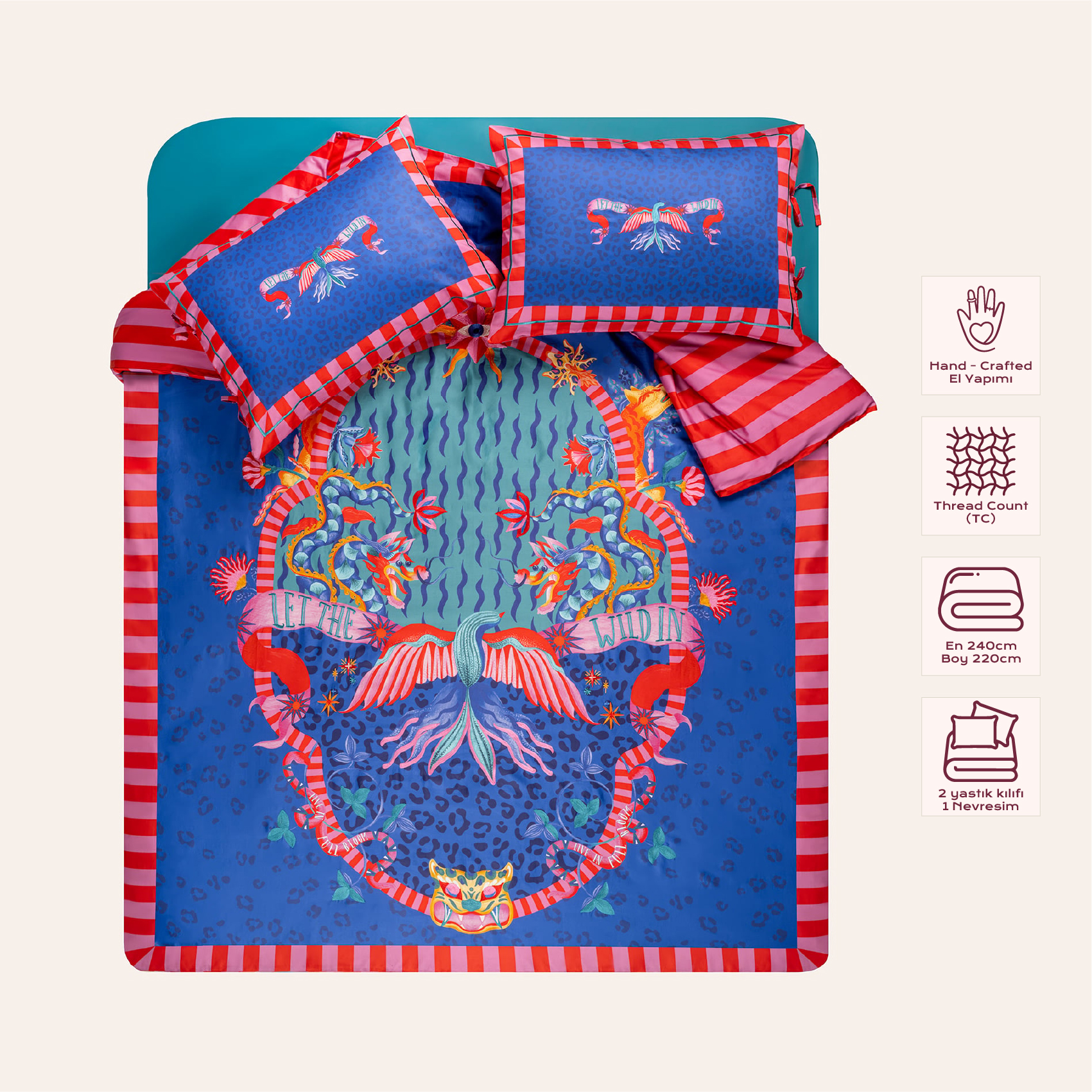 Maximalist koleksiyonunun sınır tanımayan ruhunu taşıyan Lahor 300 TC %100 pamuk saten nevresim seti, sıradanlıktan uzak, duyguları harekete geçiren bir hayal dünyası kuruyor. Renklerin coşkusu ve desenlerin özgürlüğü, 300 TC kalitesindeki saten dokunun ışıldayan yumuşaklığıyla buluşuyor; her detay, stilini ifade etmen için özgün bir alan yaratıyor. Bir hikaye anlatıcısı gibi, her motifiyle kendi karakterini konuşturan bu özel tasarım, Zsa Zsa Zsu kreatif ekibinin imzasını taşıyor. El işçiliğiyle hazırlanan fırfırlar, zarif nakışlar ve enerjisi yüksek dijital baskılar, artizan ruhu modern çizgilerle harmanlıyor.
