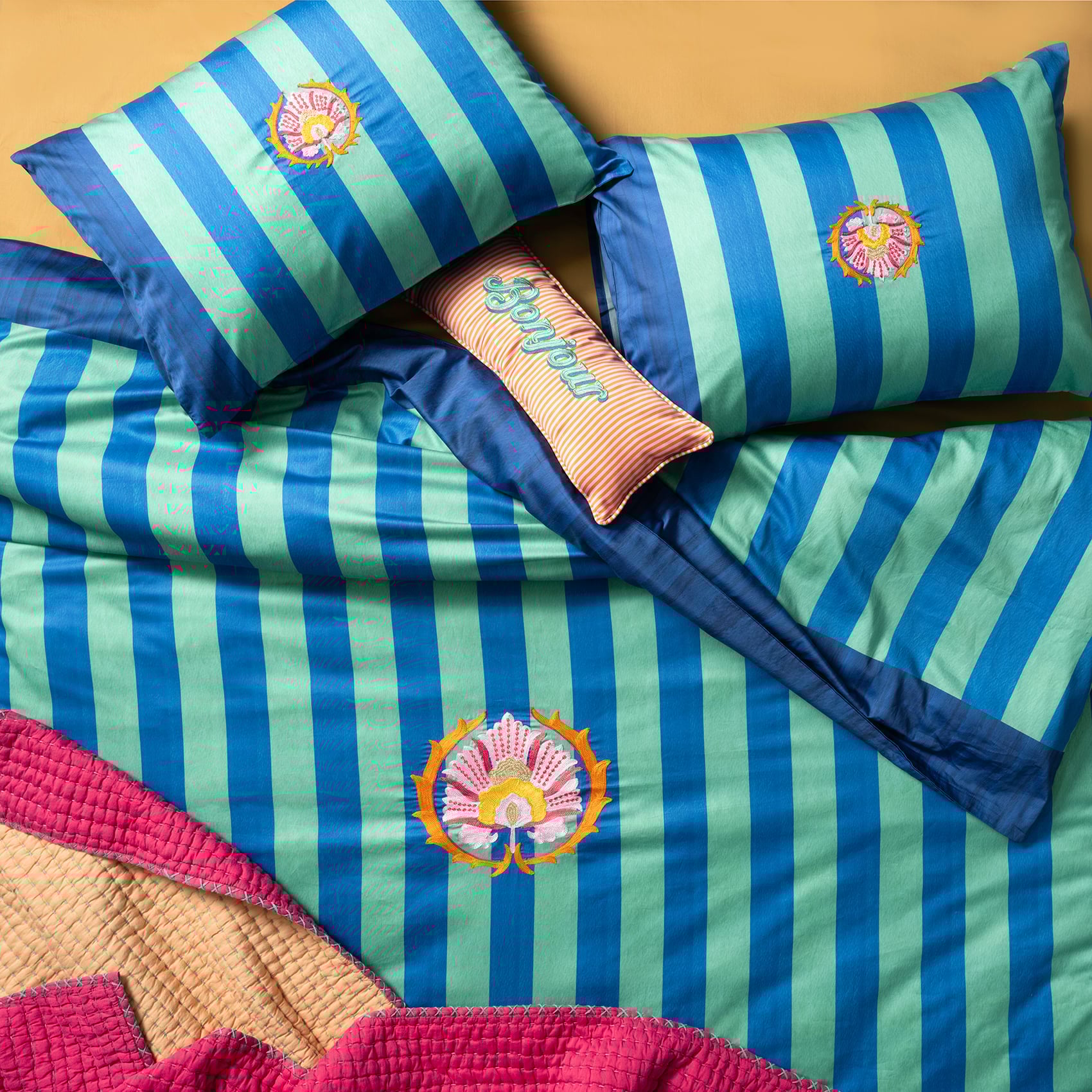 Lahor nevresim seti, geometrik formları, egzotik dünyaya ait desenleri ve cesur tasarımıyla Maximalist sahnenin yatak odalarındaki başrol oyuncusu. Dijital baskı ve nakış tekniklerinin bir arada kullanıldığı Lahor, 300 TC parlak saten kumaştan üretilmektedir.