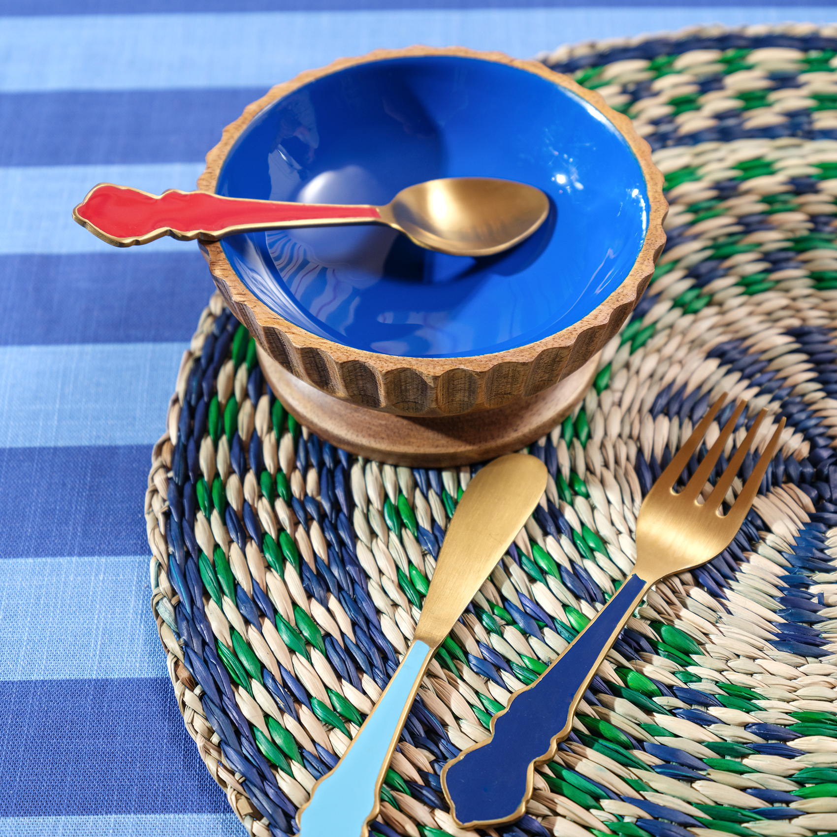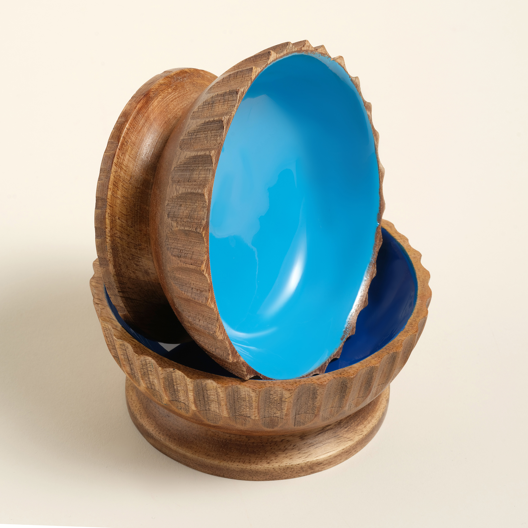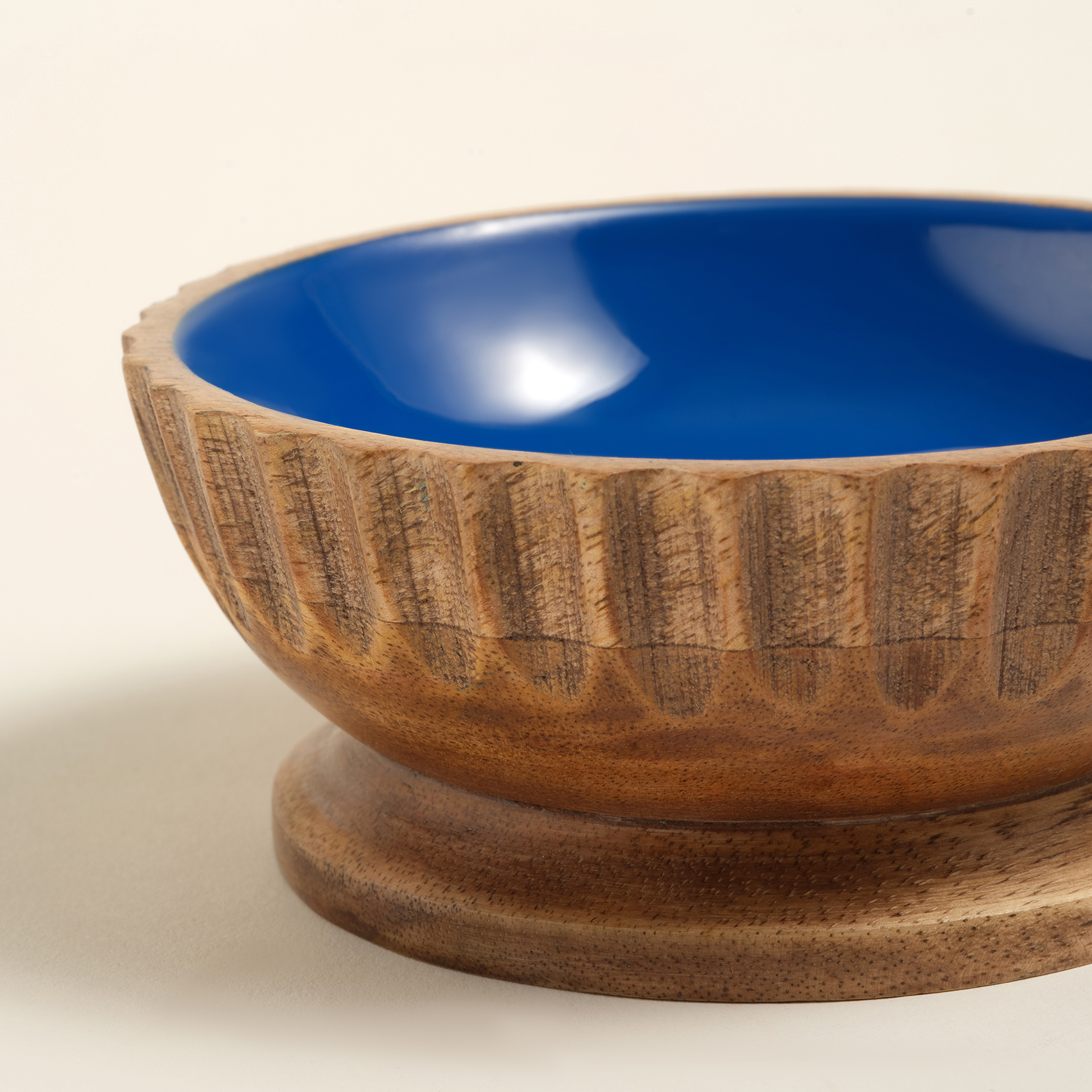 El işçiliğinin izlerini taşıyan oyma detaylar, doğal mango ağacının sıcak dokusuyla buluşuyor, iç yüzeydeki çarpıcı mavi epoksi kaplama ise Blue koleksiyonunun Akdeniz’den ilham alan özgür renk paletini yansıtıyor. Tamamen el yapımı ve kendine özgü! Lakri oymalı mango ağacı kâse ile sofralarınıza doğallıkla birlikte otantik bir dokunuş ve bolca neşe katabilirsiniz. Lakri serisindeki her parça el işçiliğiyle üretildiği için renk tonları ve desenler kendine özgüdür. Elde yıkayınız, hemen kurulayınız ve yumuşak bir bezle siliniz. Kuru gıdalar, kuru meyveler ve atıştırmalıklar için uygundur ancak asidik ürünlerle temas etmemelidir. Doğrudan güneş ışığına bırakmayın; renginde solma olabilir.
