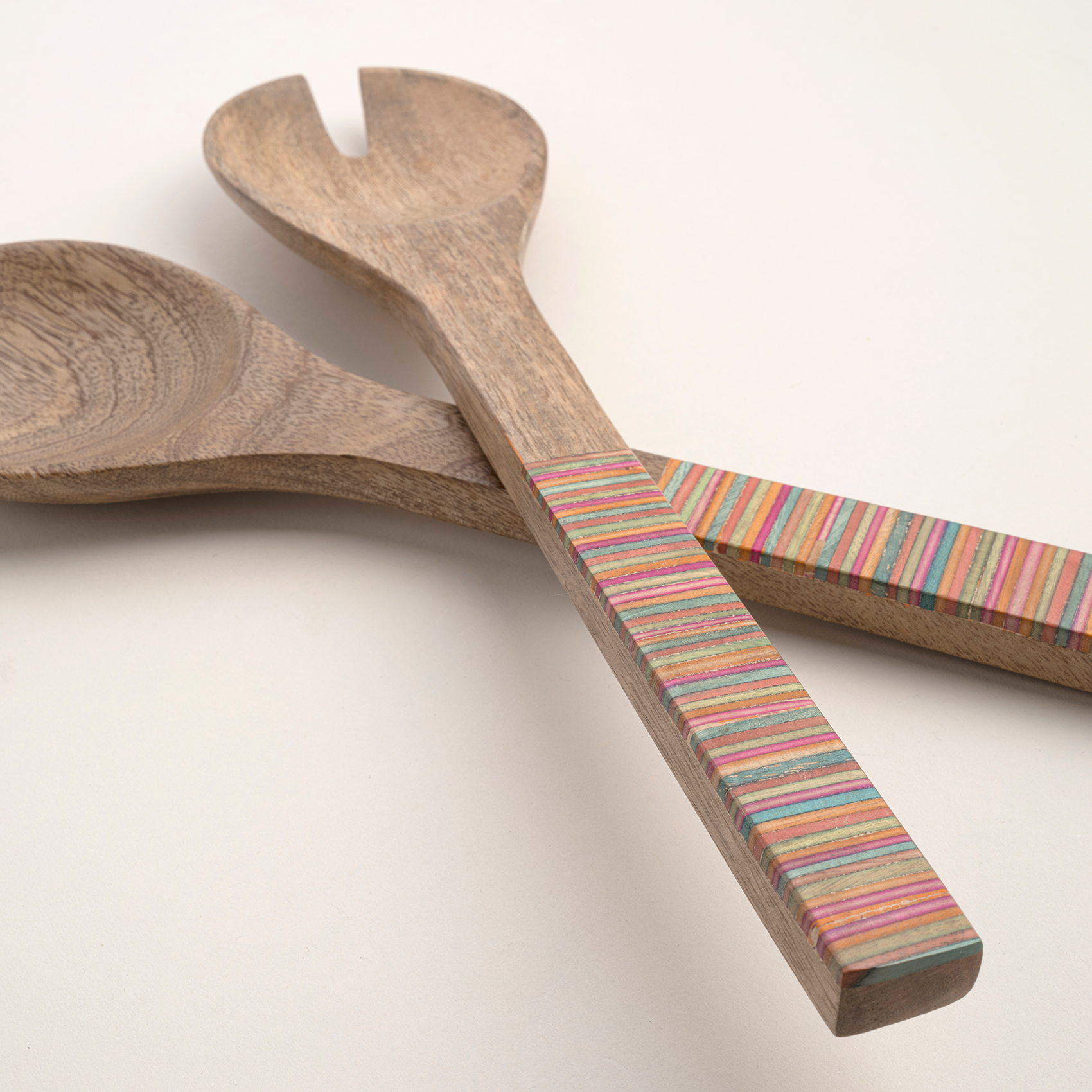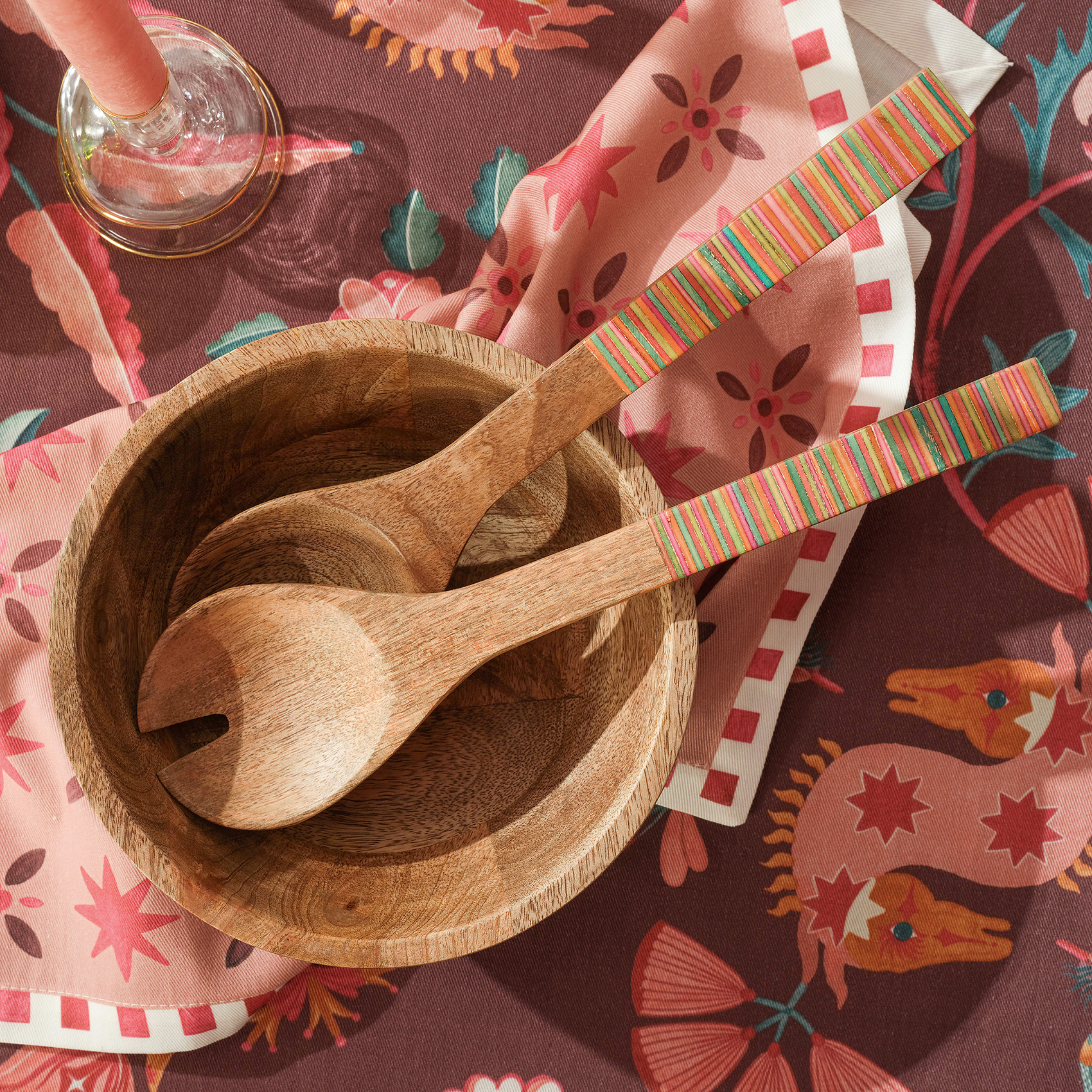 Mango ağacından elde edilen malzemesi sayesinde natürel bir görünüm sunan bu ahşap servis seti, Hindistanlı artizanlar tarafından küçük ölçekli imalathanelerde el işçiliğiyle üretiliyor. Gıda ile temasında sakınca yoktur. Uzun süre boyunca ilk günkü gibi kalması için elde yıkamanızı ve ardından kurulamanızı öneriyoruz. Asidik gıdalar ile kullanmayın ve uzun süre güneşte bırakmayın.