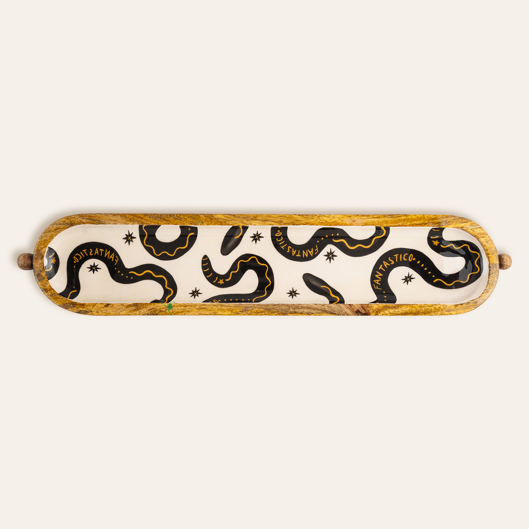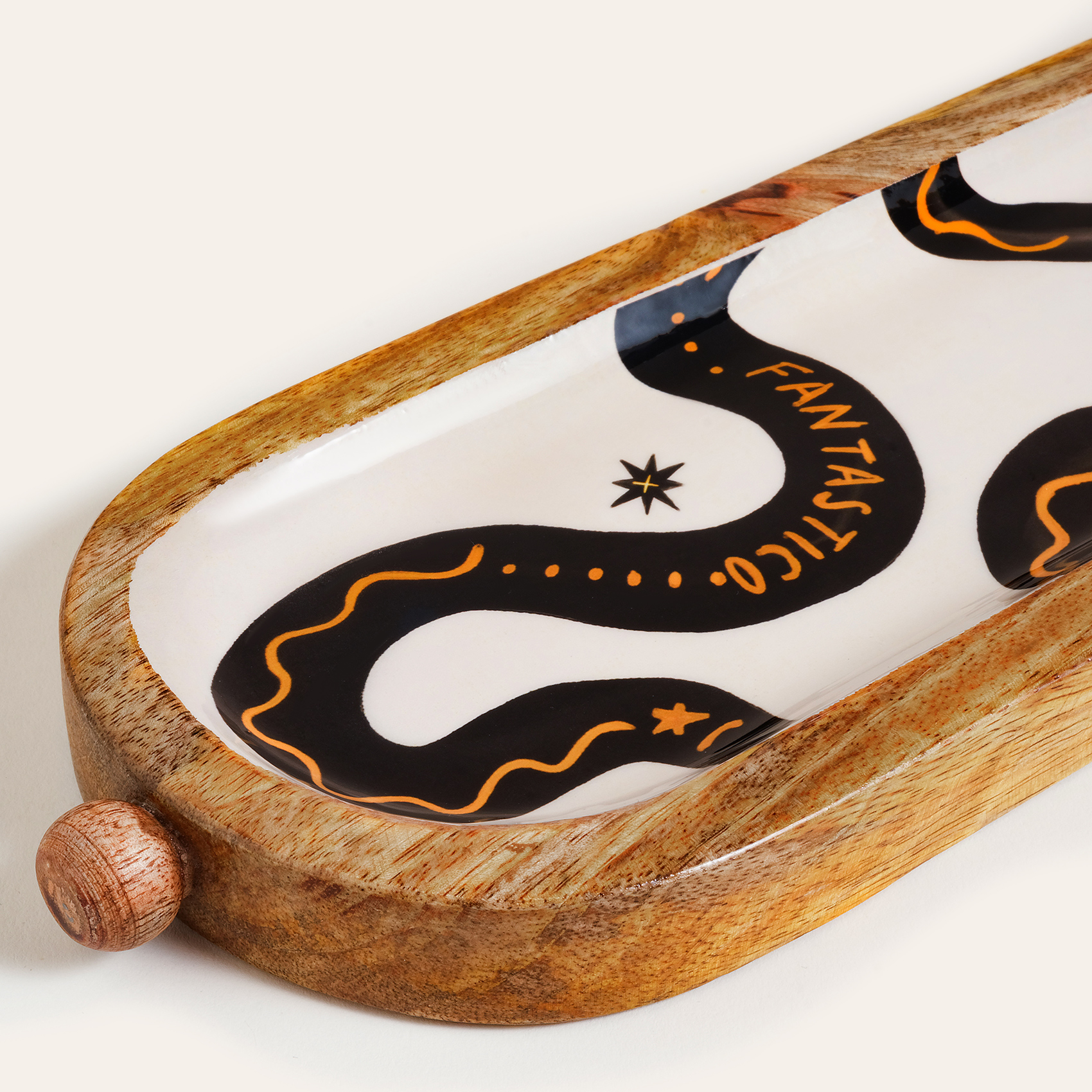 Bold koleksiyonunun etkileyici sembollerinden ilham alan Lakri Oval Mango Ağacı Tepsi, Zsa Zsa Zsu’nun modern estetik yaklaşımını mango ağacının sıcak dokusuyla bir araya getiriyor. Siyah yüzey üzerinde kıvrılarak ilerleyen motif tasarıma güçlü bir duruş kazandırırken, usta artizanların özenli el işçiliği parça üzerinde belirgin bir karakter yaratıyor. Sirlı yüzeyin ışığı yakalayan parlaklığı, tepsiyi mekâna iddialı bir enerji taşıyan çağdaş bir tasarım objesine dönüştürüyor.