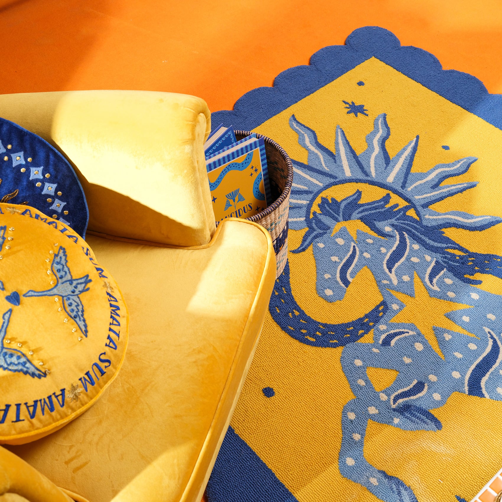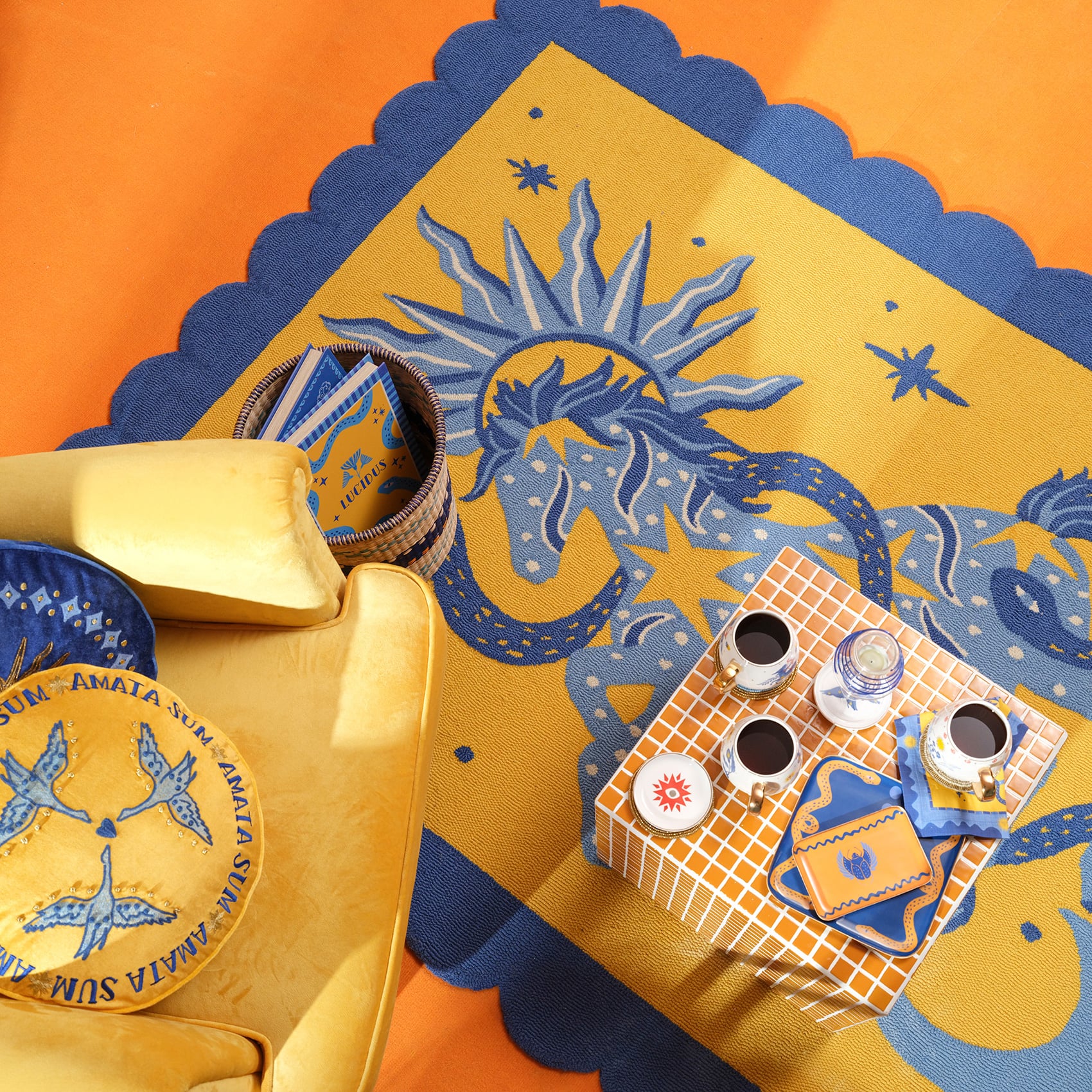 Blue koleksiyonunun güneşle aydınlanan renk paleti ve hayal gücü, Laxia’nın tufted dokusunda en beklenmedik şekilde buluşuyor. Her ilmek, her desen eski bir masaldan fısıltılar getiriyor; neşeyle boyanmış, renkle coşmuş bir anlatı kuruyor. Bir bakmışsınız kıyı boyunca yürüyorsunuz, sonra ışıkla dans ediyorsunuz. Laxia sadece durmaz. Oynar, anlatır, yaşam alanınıza hayat katar.