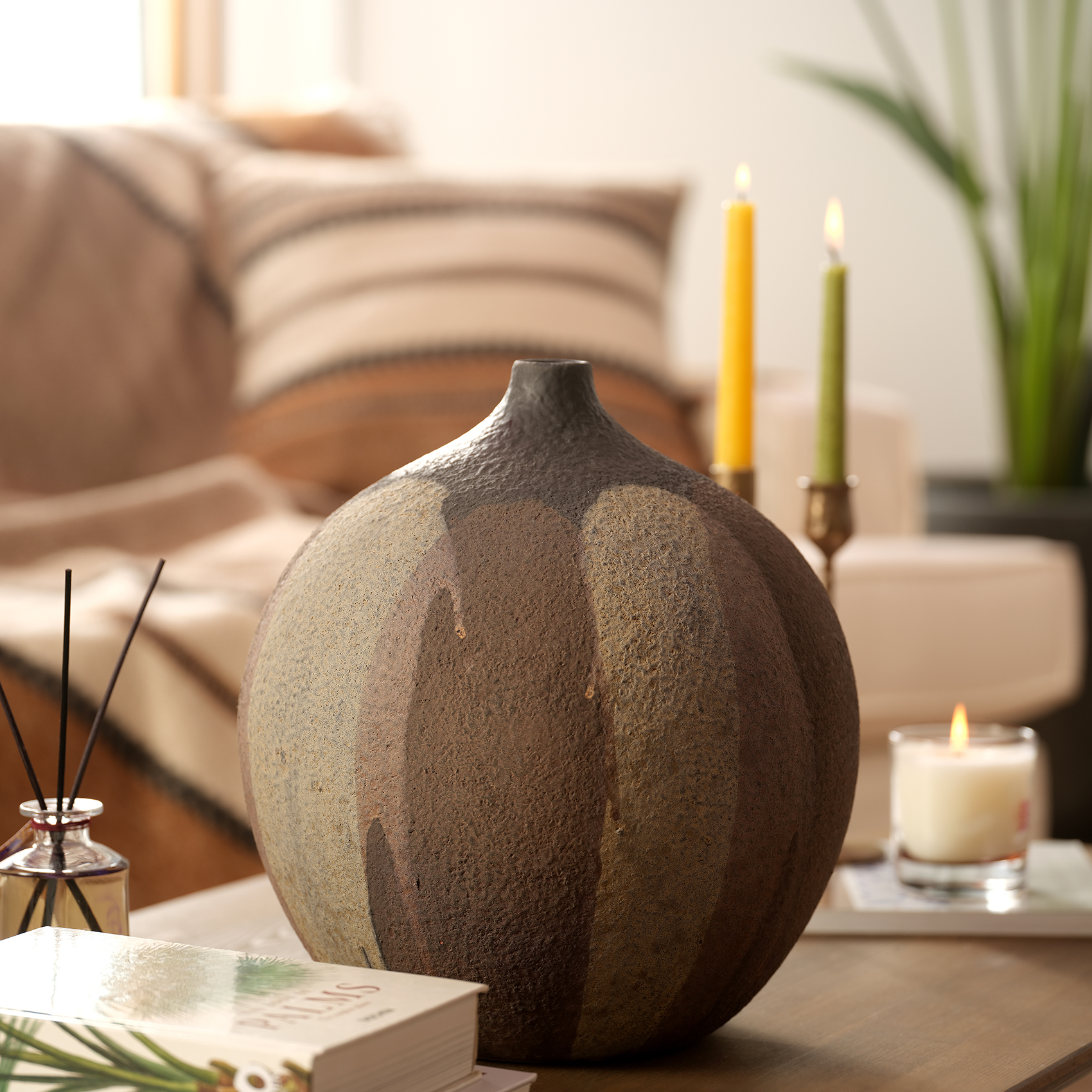 Lizbon vazo, ilk bakışta doğanın ham ve güçlü dokusunu çağrıştırıyor. Siyah ve kahverenginin tonlarındaki geçişlerle zenginleştirilen yüzeyi, toprağın, taşların ve minerallerin zamansız güzelliğini gözler önüne seriyor. Adeta bir arkeolojik buluntu ya da doğal tarih müzesinde sergilenen bir eser gibi, geçmişin hikayelerini bugüne taşıyor. 32x32x33 cm ölçüleriyle cesur bir duruş sergileyen bu el yapımı obje, reaktif sırların oluşturduğu yüzey detaylarıyla her açıdan farklı bir estetik sunuyor. Kalın, yuvarlak formu ve yüzeyindeki derin dokular, onu sıradan bir vazo olmaktan çıkarıp bir sanat eseri haline getiriyor. Bulunduğu ortamda sessiz ama etkileyici bir hakimiyet kuruyor, minimalist ancak rustik bir atmosfer yaratıyor. Lizbon vazo, doğanın ve zanaatın bir araya geldiği heykelsi bir başyapıt.