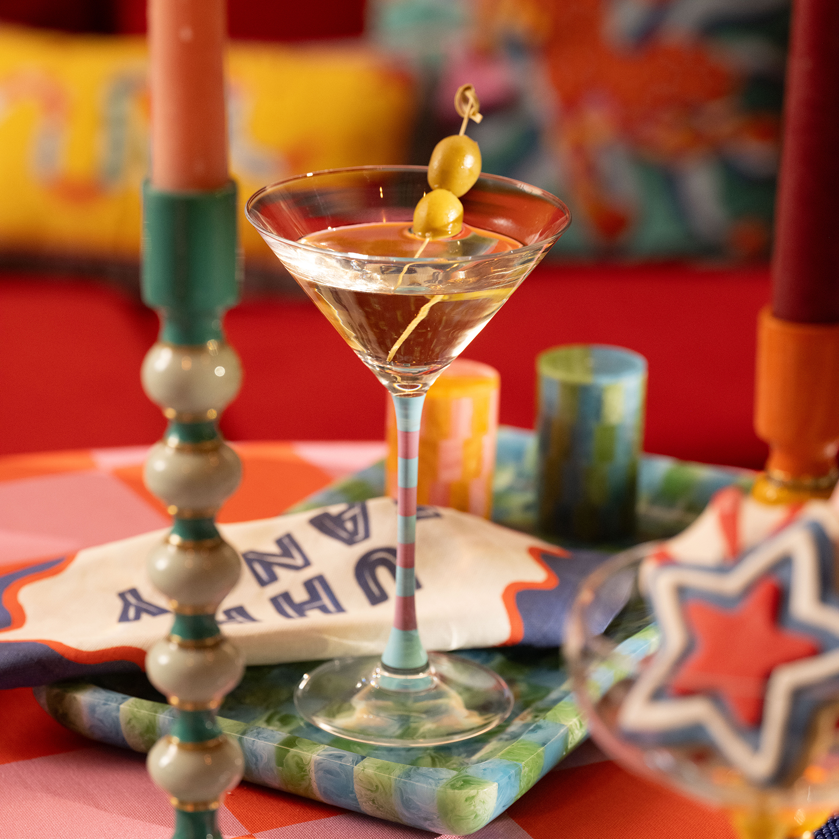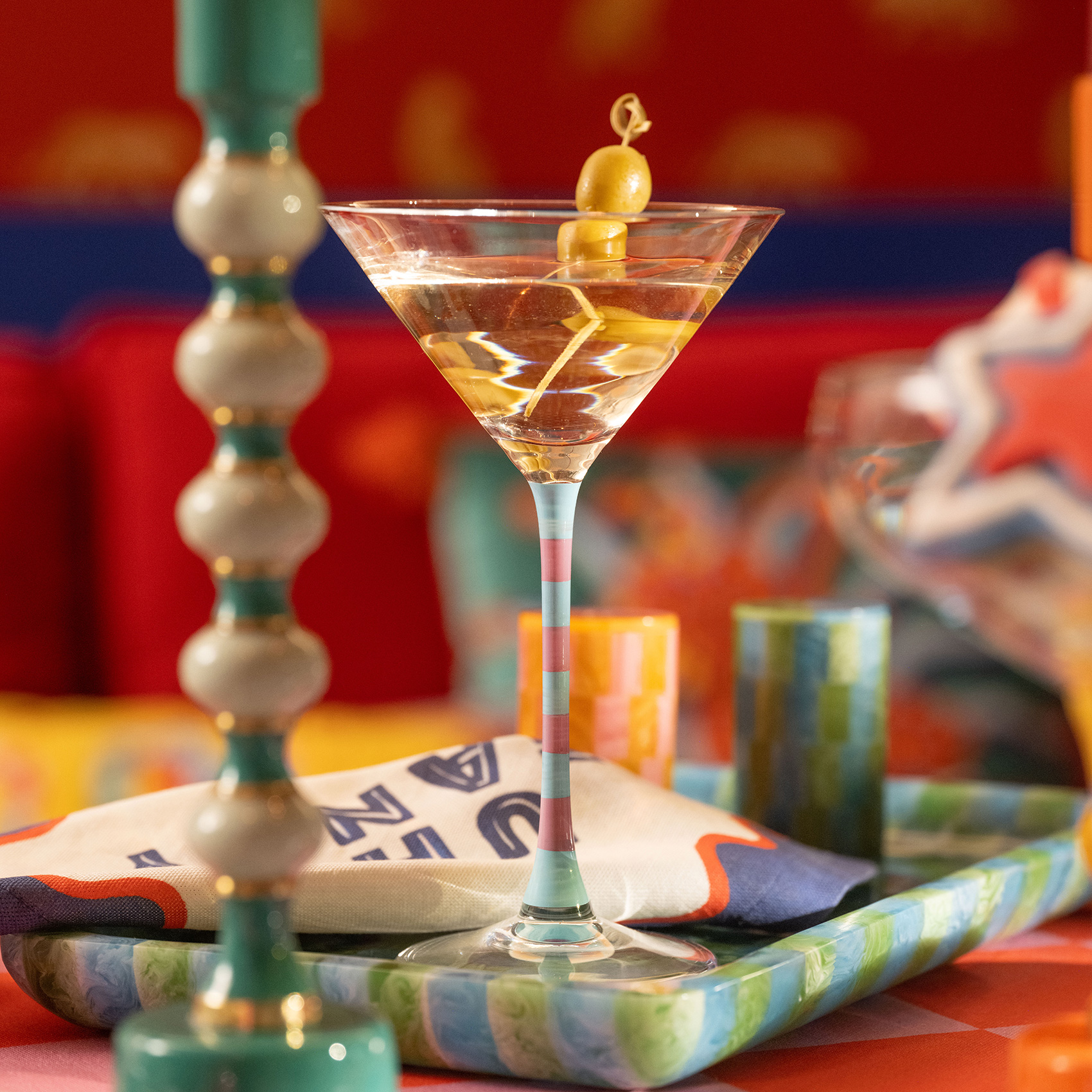 Pembe ve mavinin başlattığı partiye ilk gelen: Loess cam martini kadehi! Zamansız formuna rağmen yerinde duramayan bir enerjisi var; göz kırpıyor, gülümsüyor, sahnenin tam ortasında olmak istiyor. Soda lime camdan üretilen bu kıpır kıpır tasarım, el boyaması çizgileriyle anında eğlence modunu yüklüyor. Martini sunmanın en cıvıl cıvıl yolu tam karşınızda. Bu kadeh geldi mi, kutlama çoktan başlamış demektir.