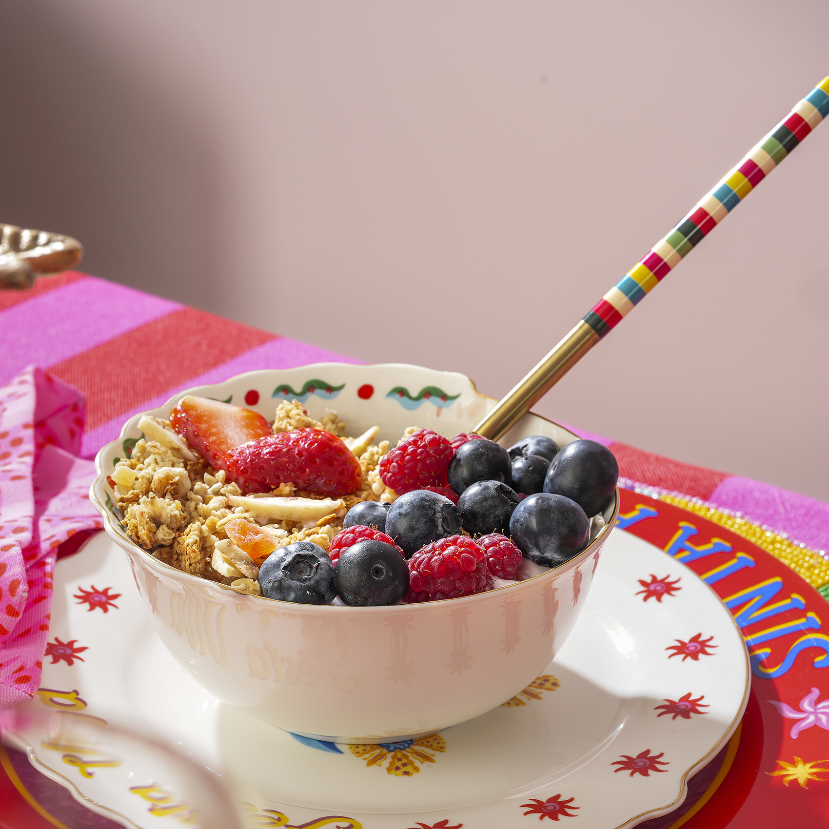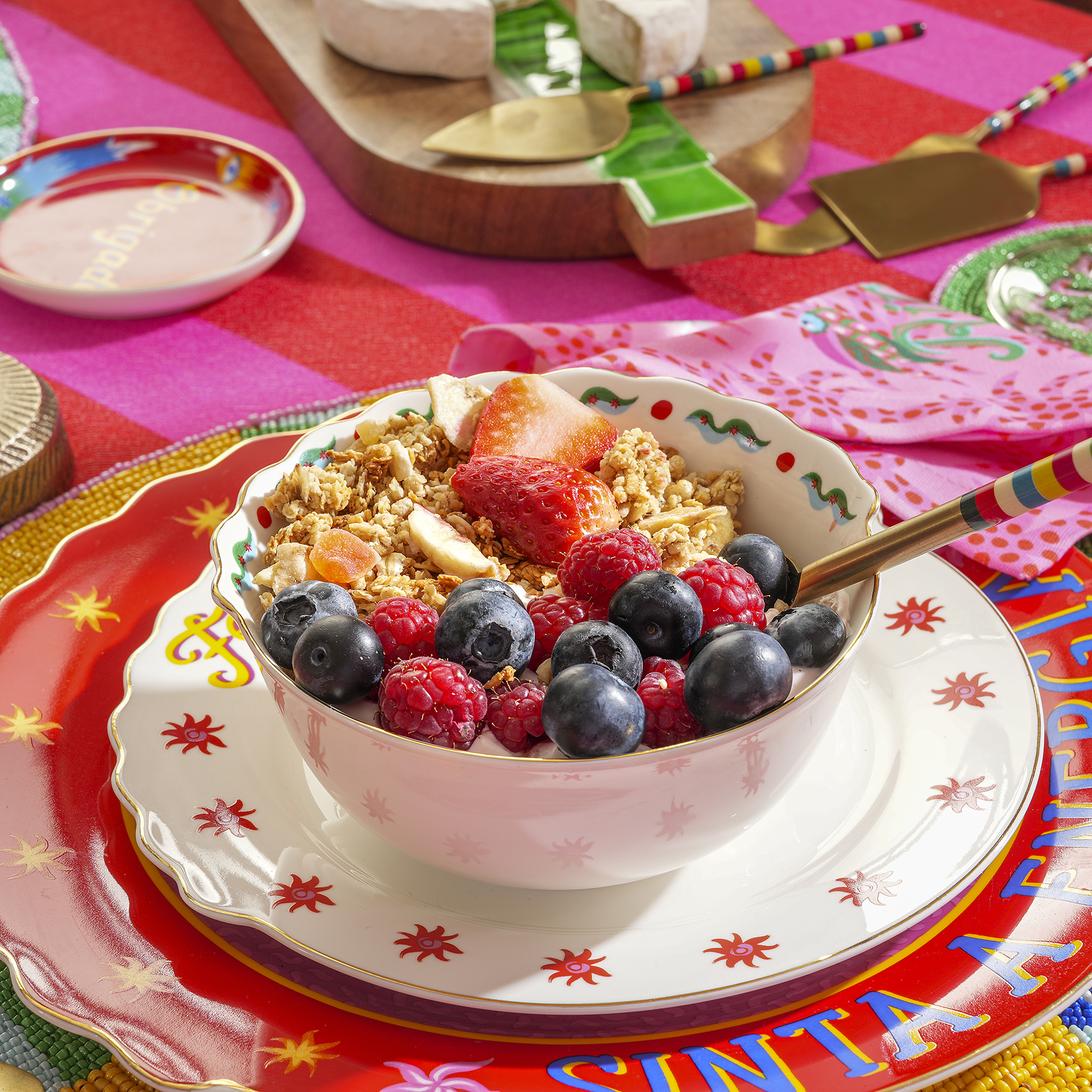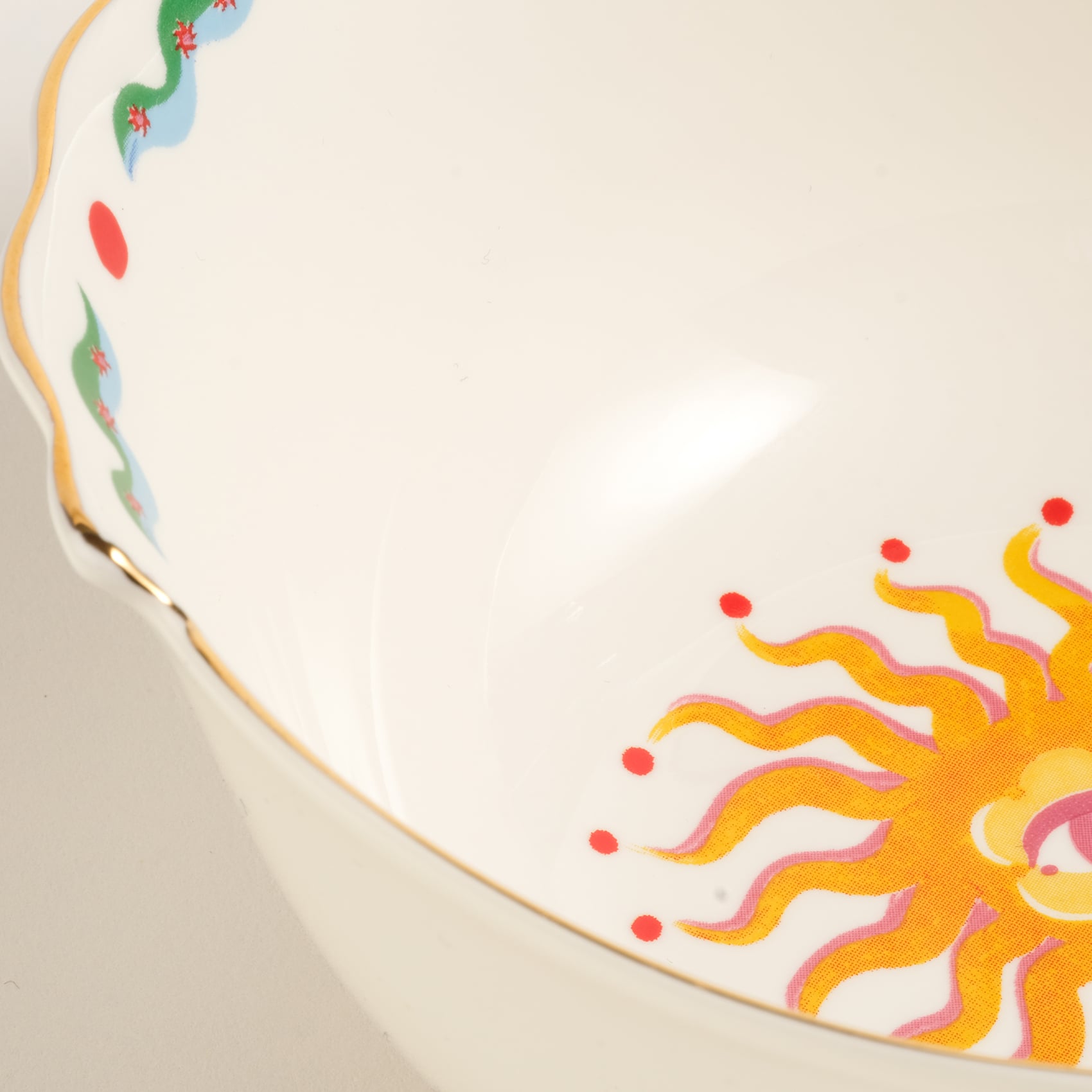 Güneşi sofraya çağır. Luohu Porselen Kâse, ortasındaki güneş motifi ve etrafındaki canlı renkleriyle masaya Zsa Zsa Zsu’nun enerjik dünyasını getiriyor. Çorbalardan meyvelere, küçük atıştırmalıklardan tatlılara kadar her sunumda sofraya hareket ve neşe katıyor. Tek başına bile masada hemen dikkat çeken bu porselen tasarım, Maximalist koleksiyonun diğer parçalarıyla yan yana geldiğinde renklerin ve desenlerin özgürce buluştuğu daha da canlı bir sofra atmosferi yaratıyor.