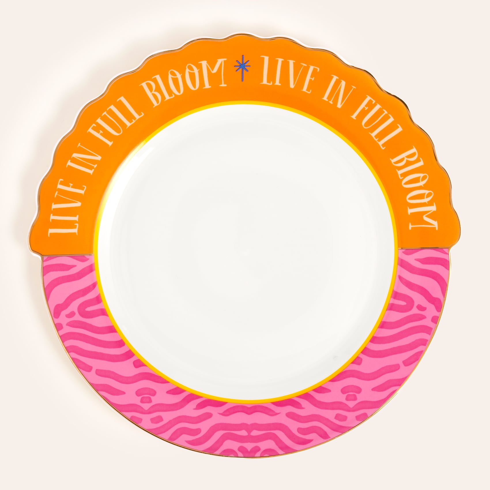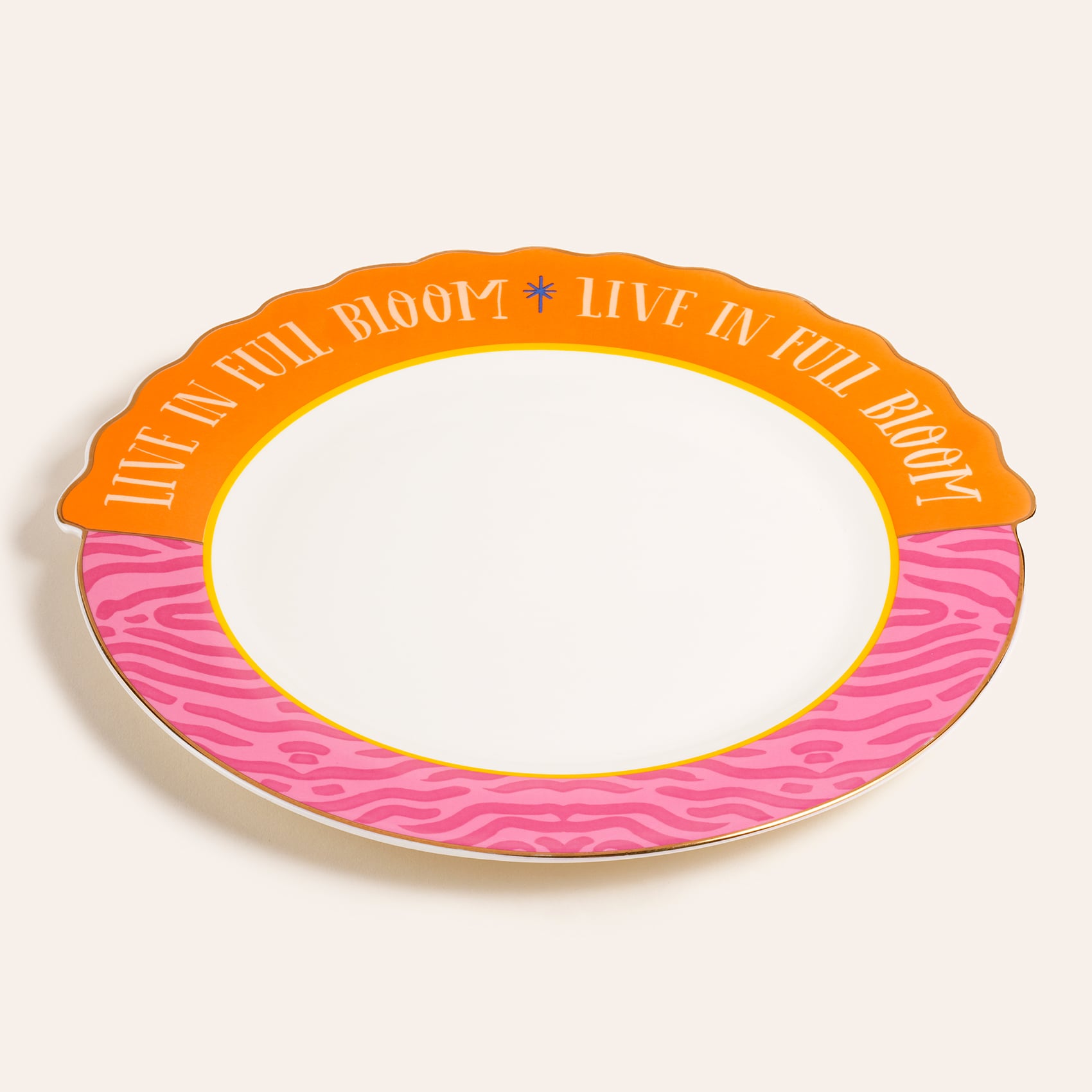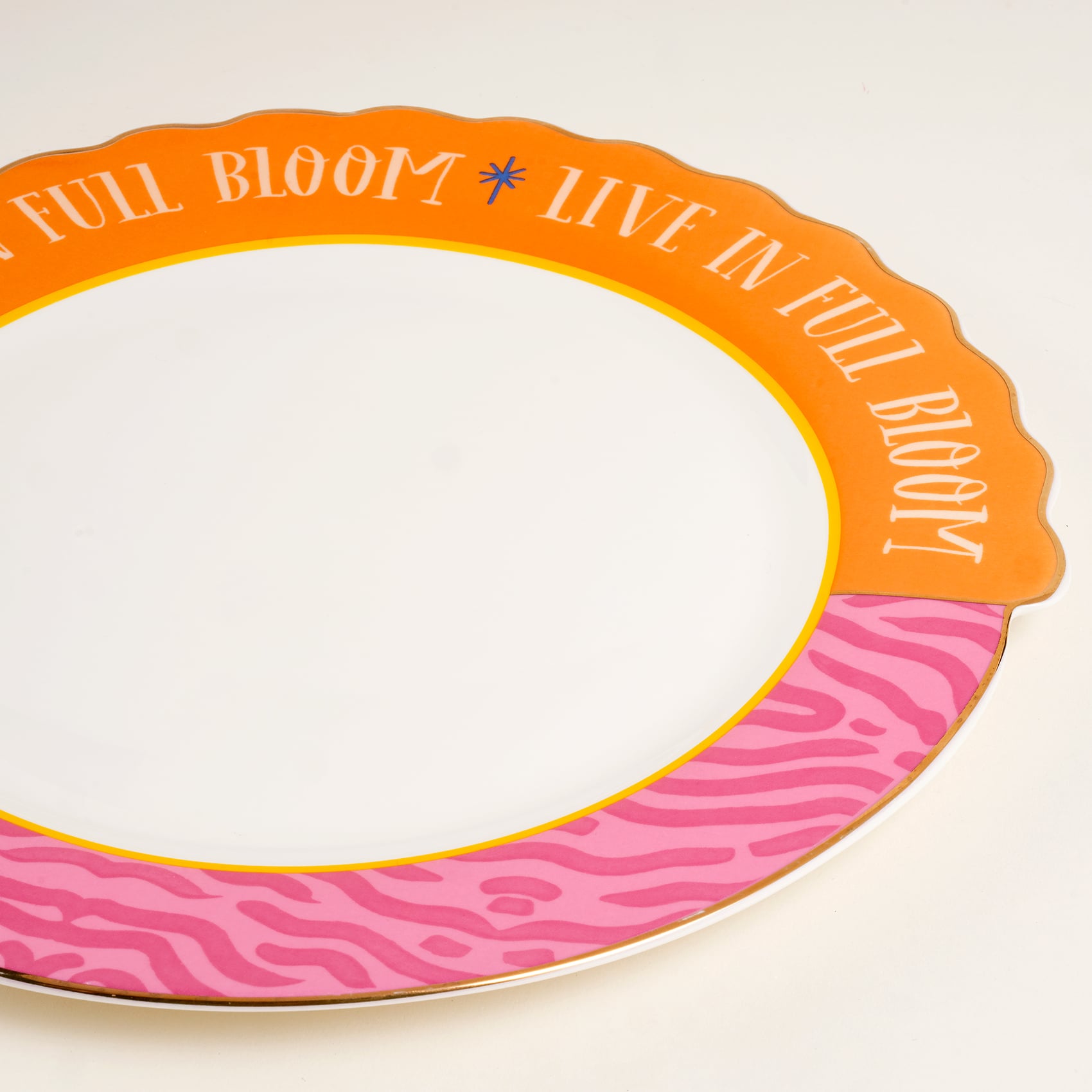 “Live in Full Bloom” mottosuyla öne çıkan Luohu servis tabağı, Maximalist enerjinin en parlak yansıması. Turuncunun sıcak coşkusu pembe desenlerle birleşerek beklenmedik bir uyum yaratıyor, altın detaylar ise tasarımı adeta bir kutlamaya dönüştürüyor. Zebra ilhamlı yüzey cesur bir oyun duygusu katarken, porselenin zarif yapısı sofrayı sofistike bir deneyime taşıyor. Yüksek ısıda uygulanan özel dekalle tamamlanan dayanıklı porselen malzeme uzun ömürlü bir şıklık sunuyor. Bu tabak, davet sofralarını renkli bir gösteriye dönüştürürken gündelik kullanımda da enerjinizi yükseltecek. Çünkü hayatın her anı çiçek açarak yaşanmalı.