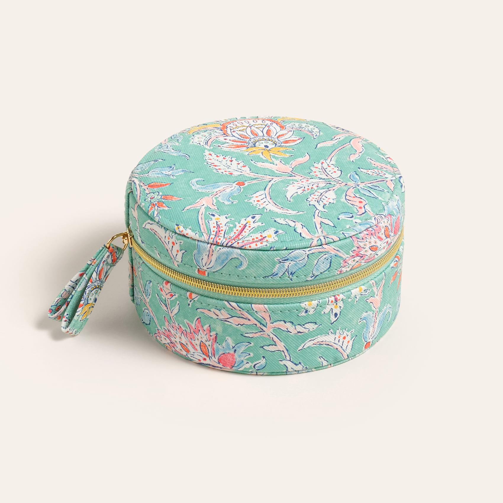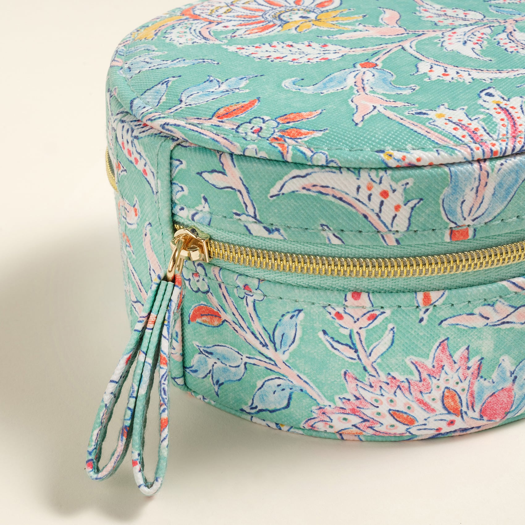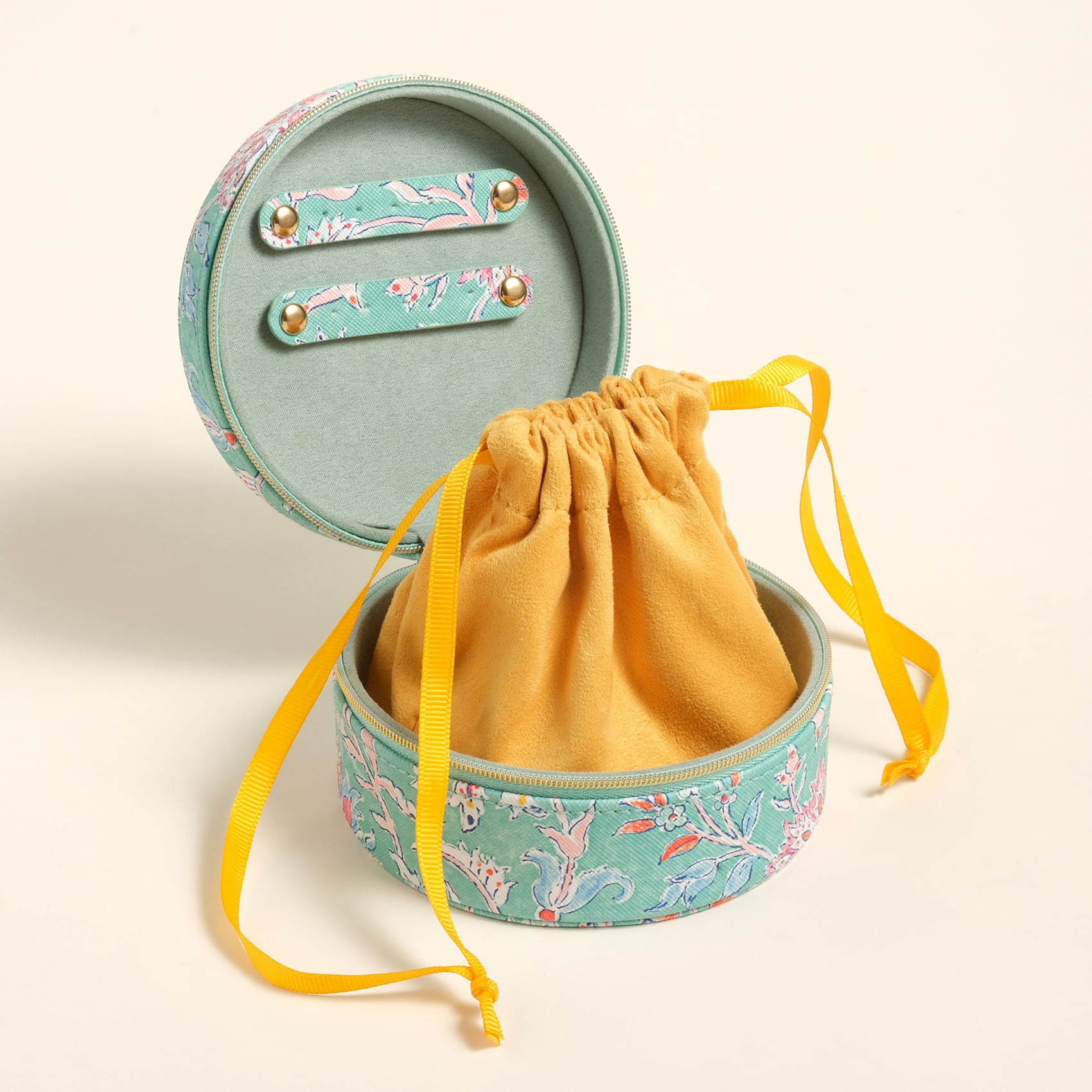 Yuvarlak formu, zarif desenleri ve içindeki sürprizleriyle Meilin takı kutusu, Heritage koleksiyonunun ilham dolu dünyasını yansıtıyor. Üst kapağındaki fiyonk detayı ve özel fermuarı dikkat çekerken, iç kısmındaki büzgülü kadife kese takılarınızı ya da küçük hazinelerinizi özenle saklamanızı sağlıyor. PVC dış yüzeyi formunu koruyor, kadife kaplaması yumuşacık bir alan sunuyor. Valizin içinde de komodin üstünde de çok tatlı durur. Şık, zarif ve oyuncu. Temizlemeniz gerekiyorsa nemli bir bezle silmeniz yeterli.